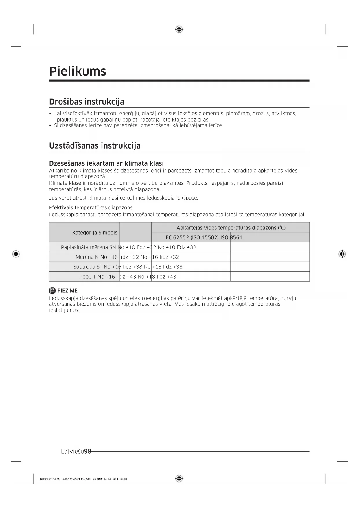 Paplašināta mērena SN No +10 līdz +32 No +10 līdz +32 Mērena N No +16 līdz +32 No +16 līdz +32 Subtropu ST No +16 līdz +38 No +18 līdz +38 Tropu T No +16 līdz +43 No +18 līdz +43 PIEZĪME Ledusskapja dzesēšanas spēju un elektroenerģijas patēriņu var ietekmēt apkārtējā temperatūra, durvju atvēršanas biežums un ledusskapja atrašanās vieta. Mēs iesakām attiecīgi pielāgot temperatūras iestatījumus. Barosa&RB3000_DA68-04283H-00.indb 98 2020-12-22 11:33:54Latviešu 99 Temperatūras instrukcija Ieteicamā temperatūra Optimālais temperatūras iestatījums pārtikas glabāšanai:
