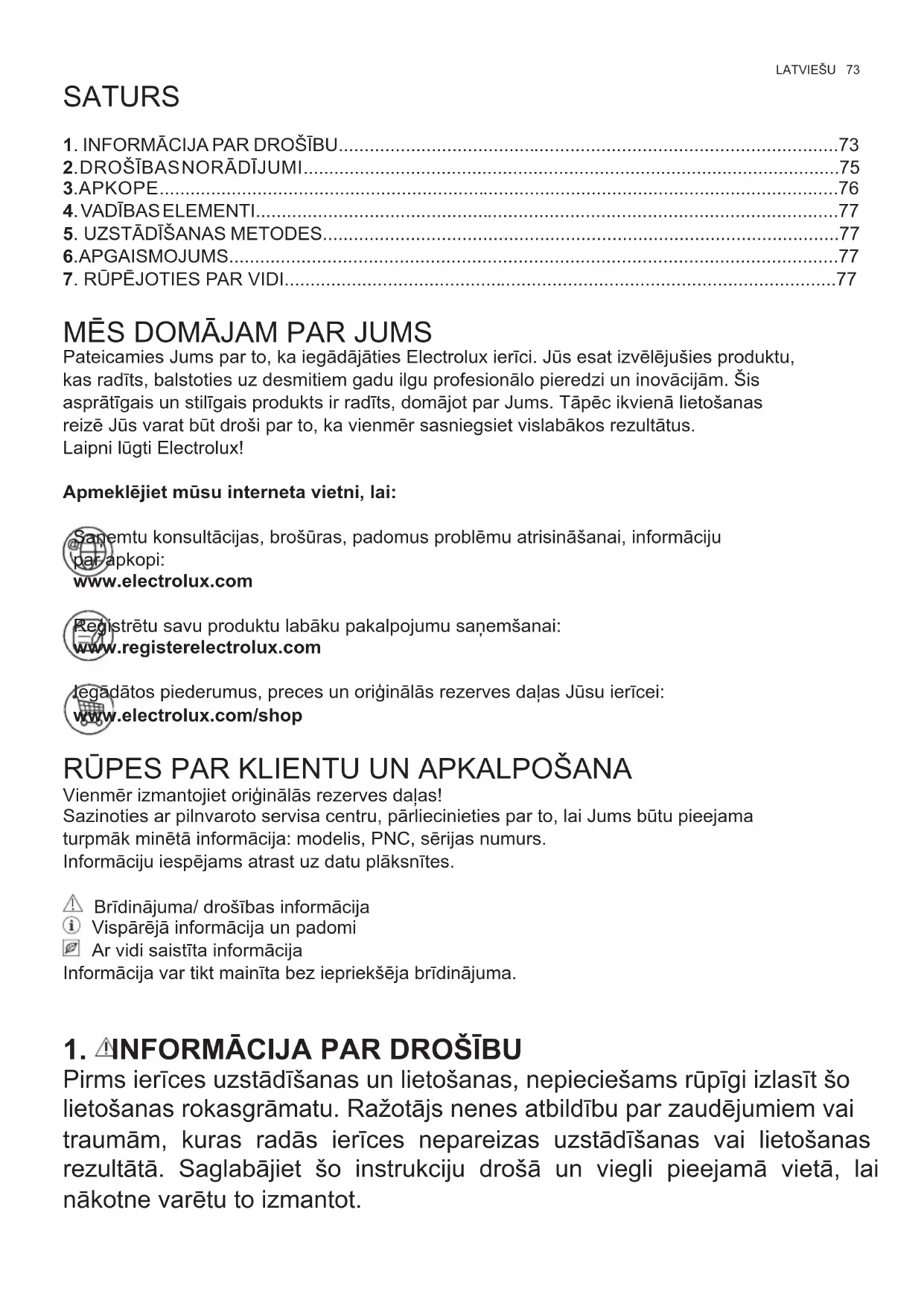 Pirms ierīces uzstādīšanas un lietošanas, nepieciešams rūpīgi izlasīt šo lietošanas rokasgrāmatu. Ražotājs nenes atbildību par zaudējumiem vai traumām, kuras radās ierīces nepareizas uzstādīšanas vai lietošanas rezultātā. Saglabājiet šo instrukciju drošā un viegli pieejamā vietā, lai nākotne varētu to izmantot. LATVIEŠU74 www.electrolux.com