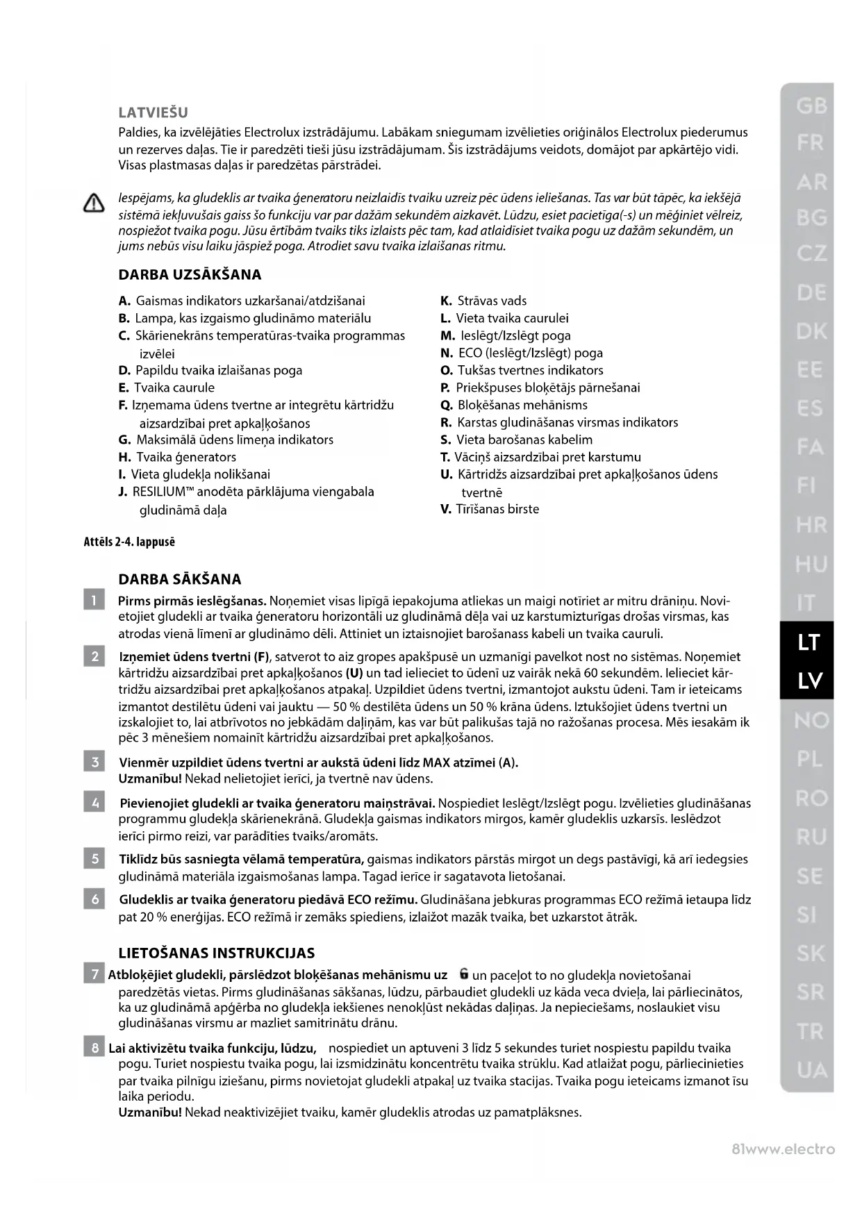LATVIEŠU Paldies, ka izvēlējāties Electrolux izstrādājumu. Labākam sniegumam izvēlieties oriģinālos Electrolux piederumus un rezerves daļas. Tie ir paredzēti tieši jūsu izstrādājumam. Šis izstrādājums veidots, domājot par apkārtējo vidi. Visas plastmasas daļas ir paredzētas pārstrādei. Iespējams, ka gludeklis ar tvaika ģeneratoru neizlaidīs tvaiku uzreiz pēc ūdens ieliešanas. Tas var būt tāpēc, ka iekšējā sistēmā iekļuvušais gaiss šo funkciju var par dažām sekundēm aizkavēt. Lūdzu, esiet pacietīga(-s) un mēģiniet vēlreiz, nospiežot tvaika pogu. Jūsu ērtībām tvaiks tiks izlaists pēc tam, kad atlaidīsiet tvaika pogu uz dažām sekundēm, un jums nebūs visu laiku jāspiež poga. Atrodiet savu tvaika izlaišanas ritmu.
