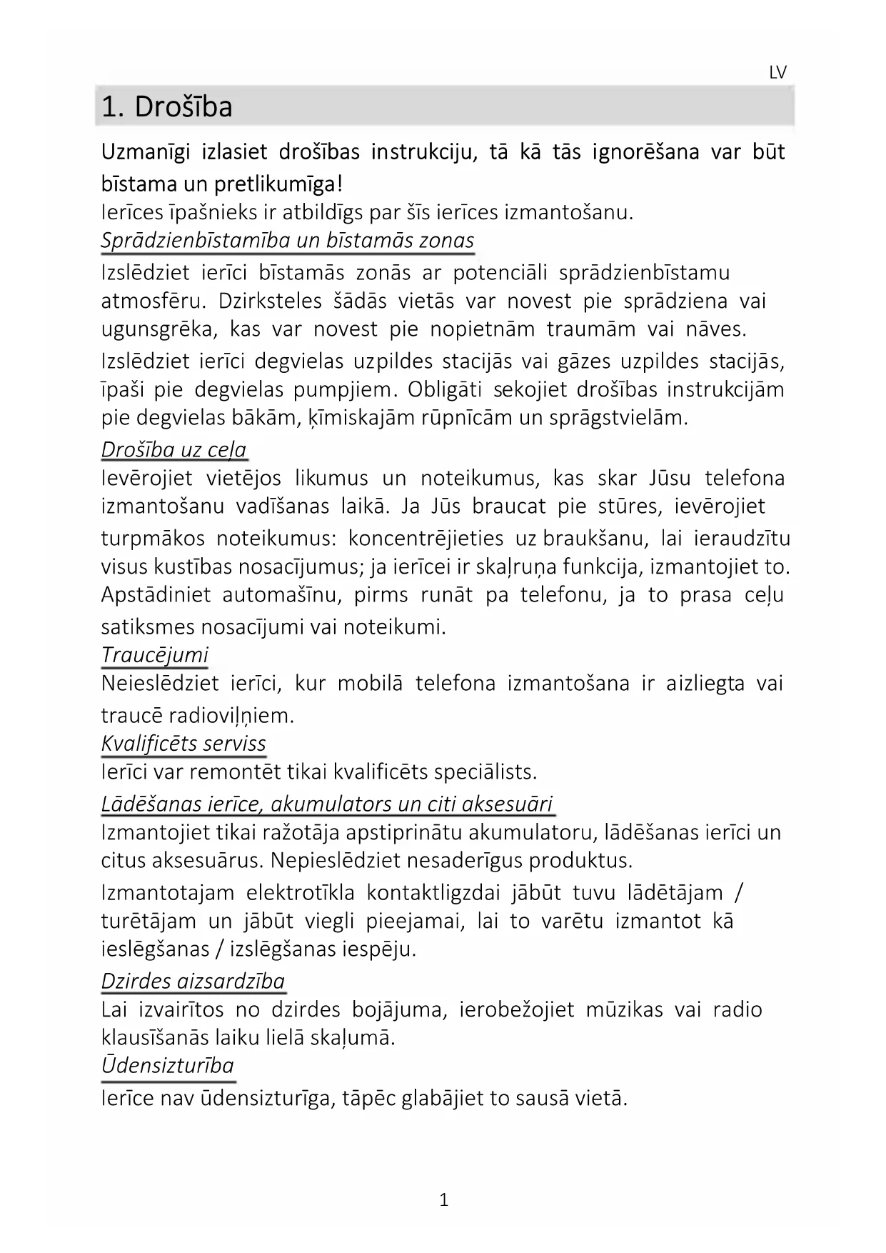 Uzmanīgi izlasiet drošības instrukciju, tā kā tās ignorēšana var būt bīstama un pretlikumīga! Ierīces īpašnieks ir atbildīgs par šīs ierīces izmantošanu. Sprādzienbīstamība un bīstamās zonas Izslēdziet ierīci bīstamās zonās ar potenciāli sprādzienbīstamu atmosfēru. Dzirksteles šādās vietās var novest pie sprādziena vai ugunsgrēka, kas var novest pie nopietnām traumām vai nāves. Izslēdziet ierīci degvielas uzpildes stacijās vai gāzes uzpildes stacijās, īpaši pie degvielas pumpjiem. Obligāti sekojiet drošības instrukcijām pie degvielas bākām, ķīmiskajām rūpnīcām un sprāgstvielām. Drošība uz ceļa Ievērojiet vietējos likumus un noteikumus, kas skar Jūsu telefona izmantošanu vadīšanas laikā. Ja Jūs braucat pie stūres, ievērojiet turpmākos noteikumus: koncentrējieties uz braukšanu, lai ieraudzītu visus kustības nosacījumus; ja ierīcei ir skaļruņa funkcija, izmantojiet to. Apstādiniet automašīnu, pirms runāt pa telefonu, ja to prasa ceļu satiksmes nosacījumi vai noteikumi. Traucējumi Neieslēdziet ierīci, kur mobilā telefona izmantošana ir aizliegta vai traucē radioviļņiem. Kvalificēts serviss Ierīci var remontēt tikai kvalificēts speciālists. Lādēšanas ierīce, akumulators un citi aksesuāri Izmantojiet tikai ražotāja apstiprinātu akumulatoru, lādēšanas ierīci un citus aksesuārus. Nepieslēdziet nesaderīgus produktus. Izmantotajam elektrotīkla kontaktligzdai jābūt tuvu lādētājam / turētājam un jābūt viegli pieejamai, lai to varētu izmantot kā ieslēgšanas / izslēgšanas iespēju. Dzirdes aizsardzība Lai izvairītos no dzirdes bojājuma, ierobežojiet mūzikas vai radio klausīšanās laiku lielā skaļumā. Ūdensizturība Ierīce nav ūdensizturīga, tāpēc glabājiet to sausā vietā.LV