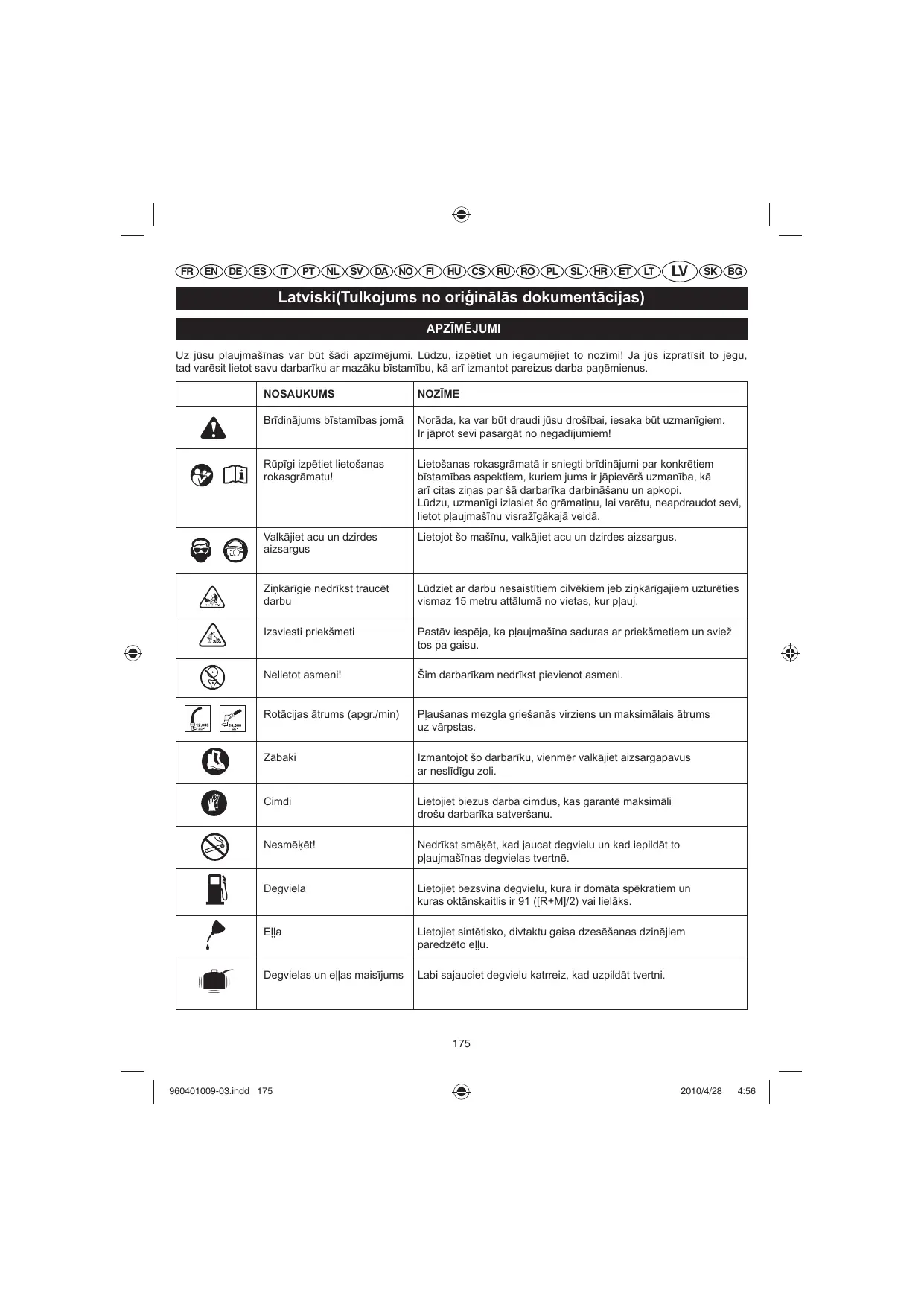 Uz jūsu pļaujmašīnas var būt šādi apzīmējumi. Lūdzu, izpētiet un iegaumējiet to nozīmi! Ja jūs izpratīsit to jēgu, tad varēsit lietot savu darbarīku ar mazāku bīstamību, kā arī izmantot pareizus darba paņēmienus. NOSAUKUMS NOZĪME Brīdinājums bīstamības jomā Norāda, ka var būt draudi jūsu drošībai, iesaka būt uzmanīgiem. Ir jāprot sevi pasargāt no negadījumiem! Rūpīgi izpētiet lietošanas rokasgrāmatu! Lietošanas rokasgrāmatā ir sniegti brīdinājumi par konkrētiem bīstamības aspektiem, kuriem jums ir jāpievērš uzmanība, kā arī citas ziņas par šā darbarīka darbināšanu un apkopi. Lūdzu, uzmanīgi izlasiet šo grāmatiņu, lai varētu, neapdraudot sevi, lietot pļaujmašīnu visražīgākajā veidā. Valkājiet acu un dzirdes aizsargus Lietojot šo mašīnu, valkājiet acu un dzirdes aizsargus. Ziņkārīgie nedrīkst traucēt darbu Lūdziet ar darbu nesaistītiem cilvēkiem jeb ziņkārīgajiem uzturēties vismaz 15 metru attālumā no vietas, kur pļauj. Izsviesti priekšmeti Pastāv iespēja, ka pļaujmašīna saduras ar priekšmetiem un sviež tos pa gaisu. Nelietot asmeni! Šim darbarīkam nedrīkst pievienot asmeni. Rotācijas ātrums (apgr./min) Pļaušanas mezgla griešanās virziens un maksimālais ātrums uz vārpstas. Zābaki Izmantojot šo darbarīku, vienmēr valkājiet aizsargapavus ar neslīdīgu zoli. Cimdi Lietojiet biezus darba cimdus, kas garantē maksimāli drošu darbarīka satveršanu. Nesmēķēt! Nedrīkst smēķēt, kad jaucat degvielu un kad iepildāt to pļaujmašīnas degvielas tvertnē. Degviela Lietojiet bezsvina degvielu, kura ir domāta spēkratiem un kuras oktānskaitlis ir 91 ([R+M]/2) vai lielāks. Eļļa Lietojiet sintētisko, divtaktu gaisa dzesēšanas dzinējiem paredzēto eļļu. Degvielas un eļļas maisījums Labi sajauciet degvielu katrreiz, kad uzpildāt tvertni.