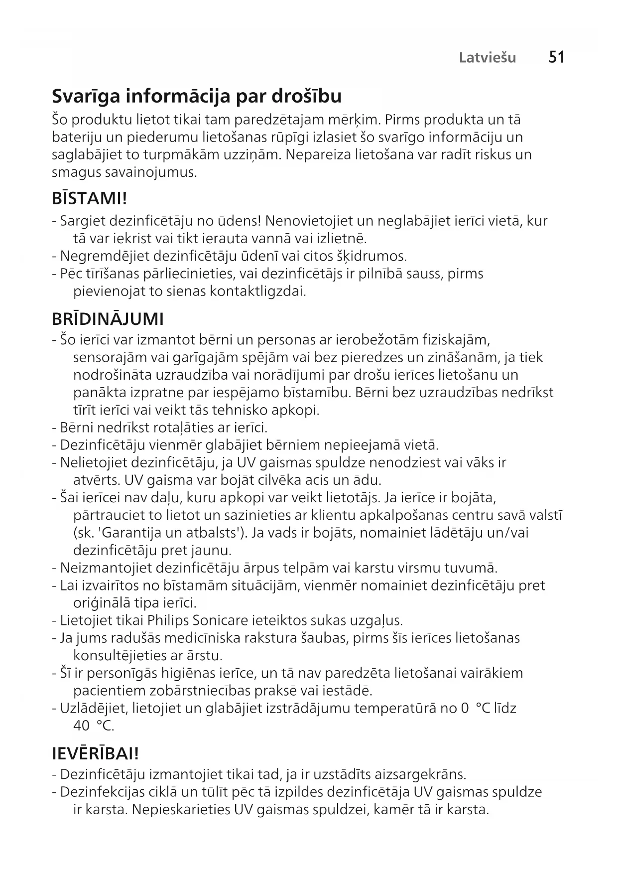 Latviešu Svarīga informācija par drošību Šo produktu lietot tikai tam paredzētajam mērķim. Pirms produkta un tā bateriju un piederumu lietošanas rūpīgi izlasiet šo svarīgo informāciju un saglabājiet to turpmākām uzziņām. Nepareiza lietošana var radīt riskus un smagus savainojumus. BĪSTAMI! - Sargiet dezinficētāju no ūdens! Nenovietojiet un neglabājiet ierīci vietā, kur tā var iekrist vai tikt ierauta vannā vai izlietnē. - Negremdējiet dezinficētāju ūdenī vai citos šķidrumos. - Pēc tīrīšanas pārliecinieties, vai dezinficētājs ir pilnībā sauss, pirms pievienojat to sienas kontaktligzdai.