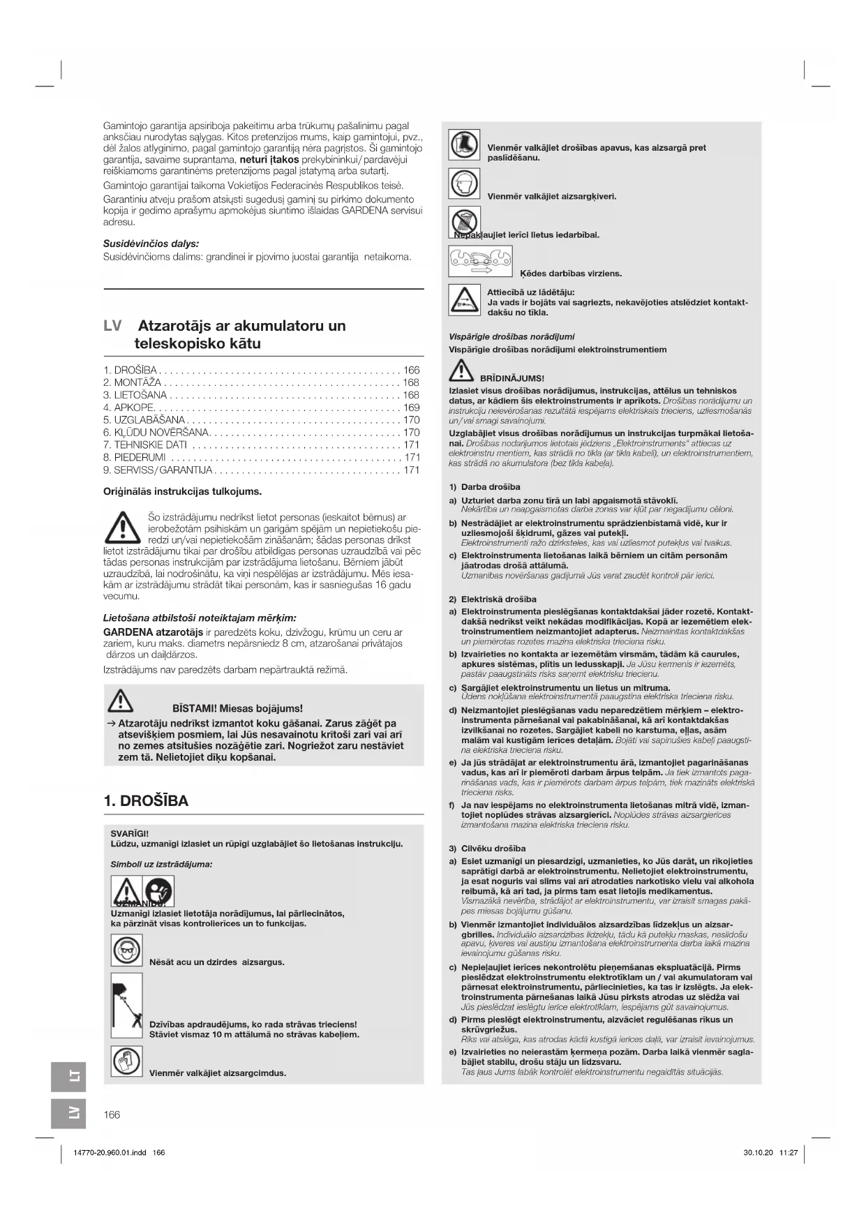 - Pirkuma čeka uzrādīšana. Garantija nav attiecināma uz detaļu un komponentu (piemēram, nažu, nažu stiprinājuma daļu, turbīnu, apgaismes līdzekļu, ķīļsiksnu un zobsiks- nu, darba ratu, gaisa filtru, aizdedzes sveču) normālu nodilumu, optiskām izmaiņām, kā arī uz dilstošajām un patērējamajām detaļām. Šī ražotāja garantija paredz vienīgi izstrādājuma apmaiņu un remontu saskaņā ar iepriekš minētajiem nosacījumiem. Citu mums kā ražotājam izvirzītu prasību apmierināšana, piemēram, zaudējumu atlīdzināšanu, ražotāja garantija neparedz. Šī ražotāja garantija neskar likumā un līgumā noteiktās garantijas prasības, ko lietotājs var izvirzīt pret veikalu / pārdevēju. Ražotāja garantijas spēkā esamību un darbību reglamentē Vācijas Federatīvās Republikas tiesību akti. Iestājoties garantijas gadījumam, lūdzam nosūtīt defektīvo izstrādājumu kopā ar pirkuma čeka kopiju un kļūmes aprakstu uz aizmugurē norādīto GARDENA servisa adresi, pilnībā apmaksājot pasta izdevumus. Dilstošas detaļas: Uz dilstošajām detaļām – ķēdi un tās turētāju garantija neattiecas. 14770-20.960.01.indd 171 30.10.20 11:27172 Produktbezeichnung: Description of the product: Désignation du produit : Beschrijving van het product: Beskrivning av produkten: Beskrivelse af produktet: Tuotteen kuvaus: Descrizione del prodotto: Descripción del producto: Descrição do produto: Opis produktu: A termék leírása: Popis výrobku: Popis produktu: Περιγραφή του προϊόντος: Opis izdelka: Opis proizvoda: Descrierea produsului: Описание на продукта: Toote kirjeldus: Gaminio aprašas: Izstrādājuma apraksts: Akku-Hochentaster Battery Pole Pruner Élagueuse sur perche sur accu Accu-telescoopkettingzaag Batteridriven Kvistsåg Akku-grensav til højtsiddende grene Accu-raivaussaha Potatore telescopico a batteria Sierra de pértiga telescópica conaccu Serra accu para poda em altura Akumulatorowa pilarka łańcuchowa z trzonkiem teleskopowym Akkumulátoros magassági ágvágó Akumulátorová teleskopická vyvětvovací pilka Akumulátorový teleskopický odvetvovač Τηλεσκοπικό αλυσοπρίονο μπαταρίας Akumulatorski obrezovalnik za veje Akumulatorska teleskopska pila Foarfecă cu acumulator pentru rărirea crengilor copacilor înalţi Телескопична акумулаторна кастрачка Akuga kõrglõikur Akumuliatorinė aukštapjovė Atzarotājs ar akumulatoru un teleskopisko kātu Produkttyp: Product type: Type de produit : Producttype: Produkttyp: Produkttype: Tuotetyyppi: Tipo adi prodotto: Tipo de producto: Tipo de produto: Typ produktu: Terméktípus: Druh výrobku: Typ produktu: Τύπος προϊόντος: Vrsta izdelka: Vrsta proizvoda: Tip produs: Тип продукт: Tootetüüp: Gaminio tipas: Produkta veids: