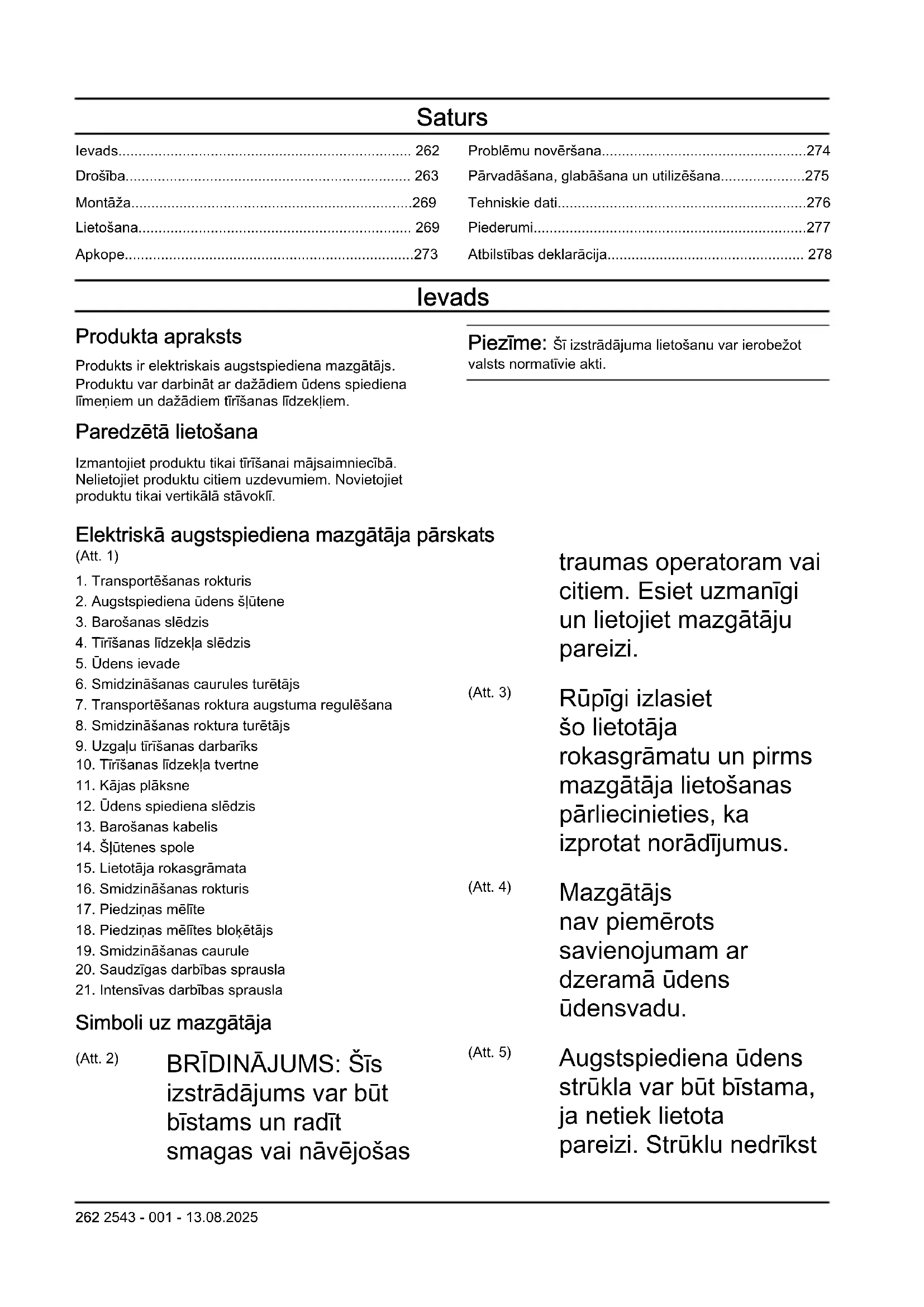 Simboli uz mazgātāja (Att. 2) BRĪDINĀJUMS: Šīs izstrādājums var būt bīstams un radīt smagas vai nāvējošas traumas operatoram vai citiem. Esiet uzmanīgi un lietojiet mazgātāju pareizi. (Att. 3) Rūpīgi izlasiet šo lietotāja rokasgrāmatu un pirms mazgātāja lietošanas pārliecinieties, ka izprotat norādījumus. (Att. 4) Mazgātājs nav piemērots savienojumam ar dzeramā ūdens ūdensvadu. (Att. 5) Augstspiediena ūdens strūkla var būt bīstama, ja netiek lietota pareizi. Strūklu nedrīkst 262 2543 - 001 - 13.08.2025vērst pret cilvēkiem, elektroaprīkojumu un mazgātāju. (Att. 6) Vides marķējums. Mazgātājs un tā iepakojums nav sadzīves atkritumi. Nododiet to pārstrādei apstiprinātā elektrisko un elektronisko ierīču savākšanas punktā. (Att. 7) II klases instruments. (Att. 8) Trokšņa emisijas vidē uzlīme atbilstoši ES un Apvienotās Karalistes direktīvām un noteikumiem, kā arī Jaundienvidvelsas tiesību aktam “Darba vides aizsardzības(trokšņa kontroles) regula(2017)”. Izstrādājuma garantētais skaņas jaudas līmenis ir norādīts šeit: Tehniskie dati lpp. 276 , kā arī uzlīmē. (Att. 9) Aizsargāts pret zema spiediena ūdens padevi jebkurā leņķī. (Att. 10) Sargiet no sala. (Att. 11) Šis izstrādājums atbilst spēkā esošajām EKdirektīvām. Piezīme: Pārējie uz mazgātāja norādītie simboli/ norādes atbilst atsevišķu reģionu sertifikācijas prasībām. Produkta bojājumi Mēs neatbildam par mūsu produkta bojājumiem, ja: