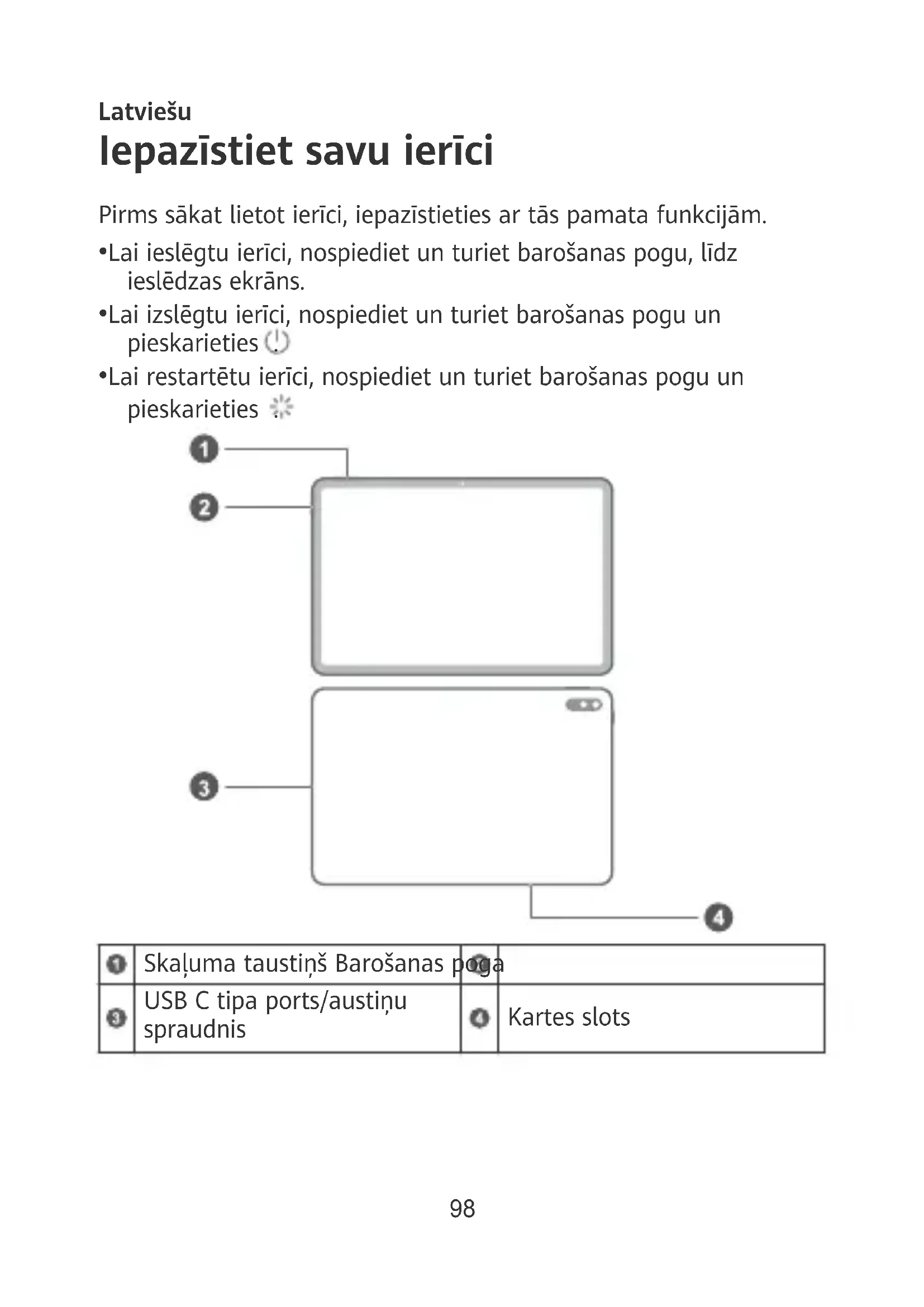 - Lai restartētu ierīci, nospiediet un turiet barošanas pogu un pieskarieties . Skaļuma taustiņš Barošanas poga USB C tipa ports/austiņu spraudnis Kartes slots 98Darba sākšana