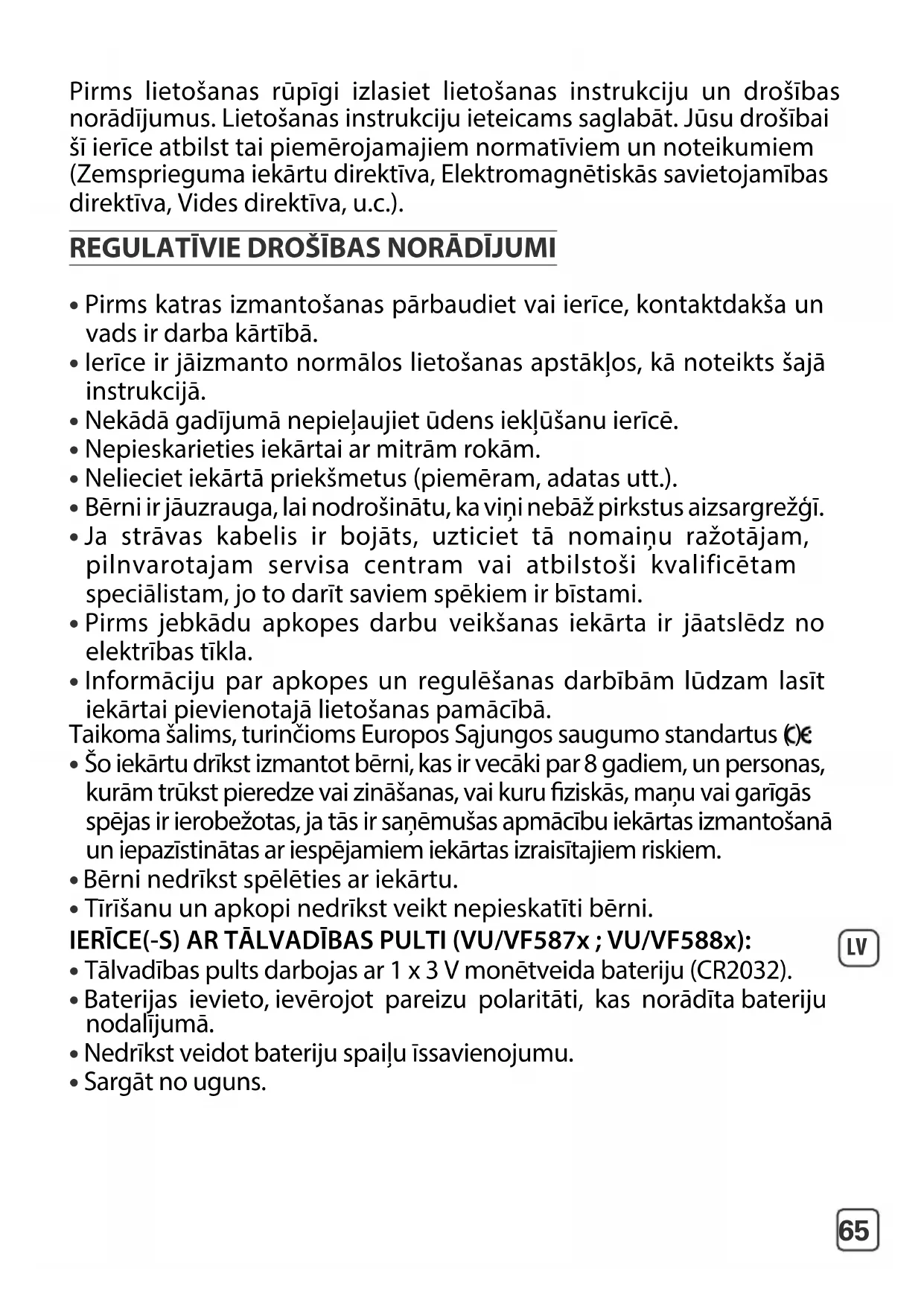 - Tīrīšanu un apkopi nedrīkst veikt nepieskatīti bērni. IERĪCE(-S) AR TĀLVADĪBAS PULTI (VU/VF587x ; VU/VF588x):