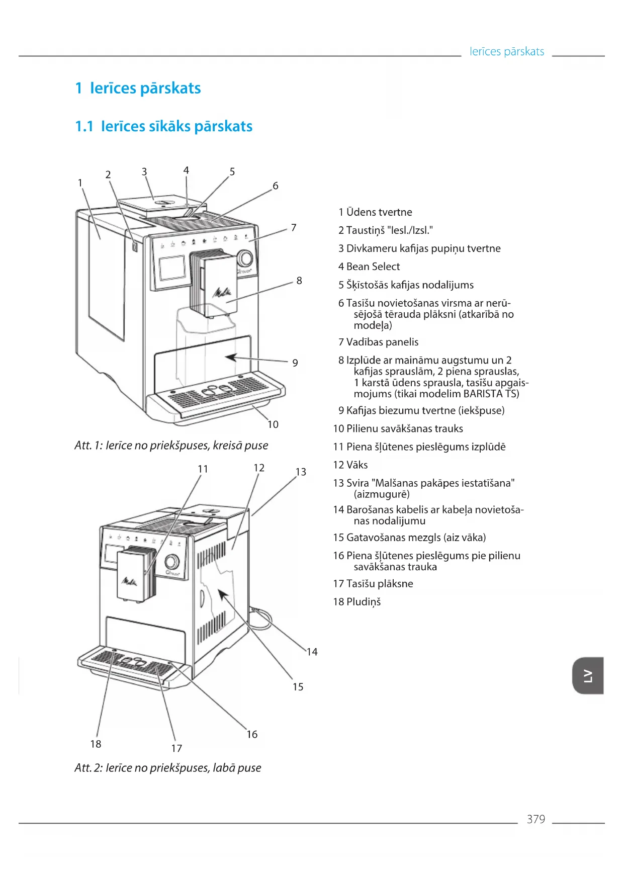 Att. 2: Ierīce no priekšpuses, labā puse 1 Ūdens tvertne 2 Taustiņš "Iesl./Izsl." 3 Divkameru kajas pupiņu tvertne 4 Bean Select 5 Šķīstošās kajas nodalījums 6 Tasīšu novietošanas virsma ar nerū- sējošā tērauda plāksni (atkarībā no modeļa) 7 Vadības panelis 8 Izplūde ar maināmu augstumu un 2 kajas sprauslām, 2 piena sprauslas, 1 karstā ūdens sprausla, tasīšu apgais- mojums (tikai modelim BARISTATS) 9 Kajas biezumu tvertne (iekšpuse) 10 Pilienu savākšanas trauks 11 Piena šļūtenes pieslēgums izplūdē 12 Vāks 13 Svira "Malšanas pakāpes iestatīšana" (aizmugurē) 14 Barošanas kabelis ar kabeļa novietoša- nas nodalījumu 15 Gatavošanas mezgls (aiz vāka) 16 Piena šļūtenes pieslēgums pie pilienu savākšanas trauka 17 Tasīšu plāksne 18 PludiņšIerīces pārskats