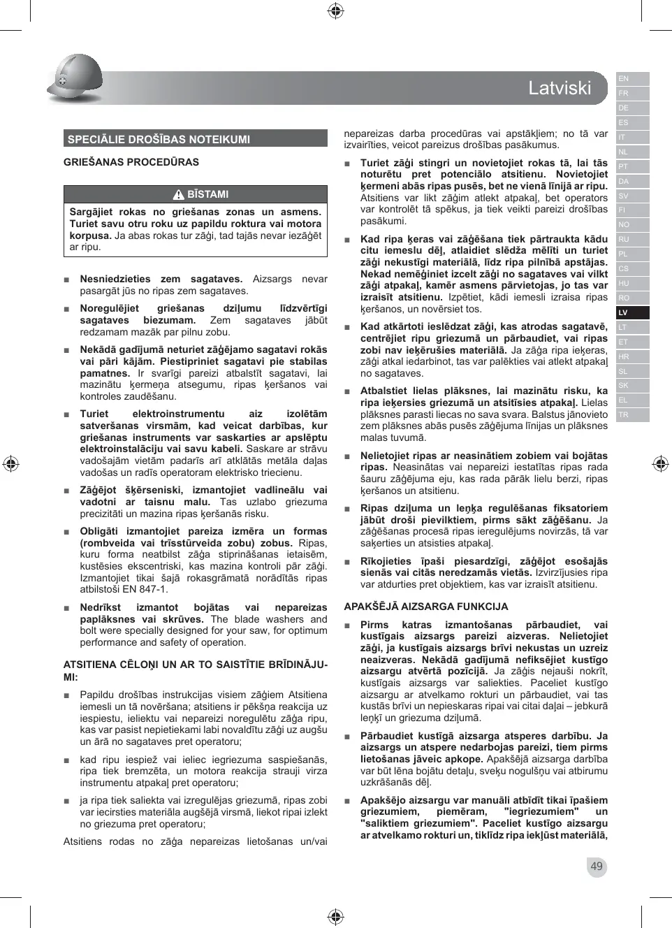 EN FR DE ES SPECIĀLIE DROŠĪBAS NOTEIKUMI GRIEŠANAS PROCEDŪRAS