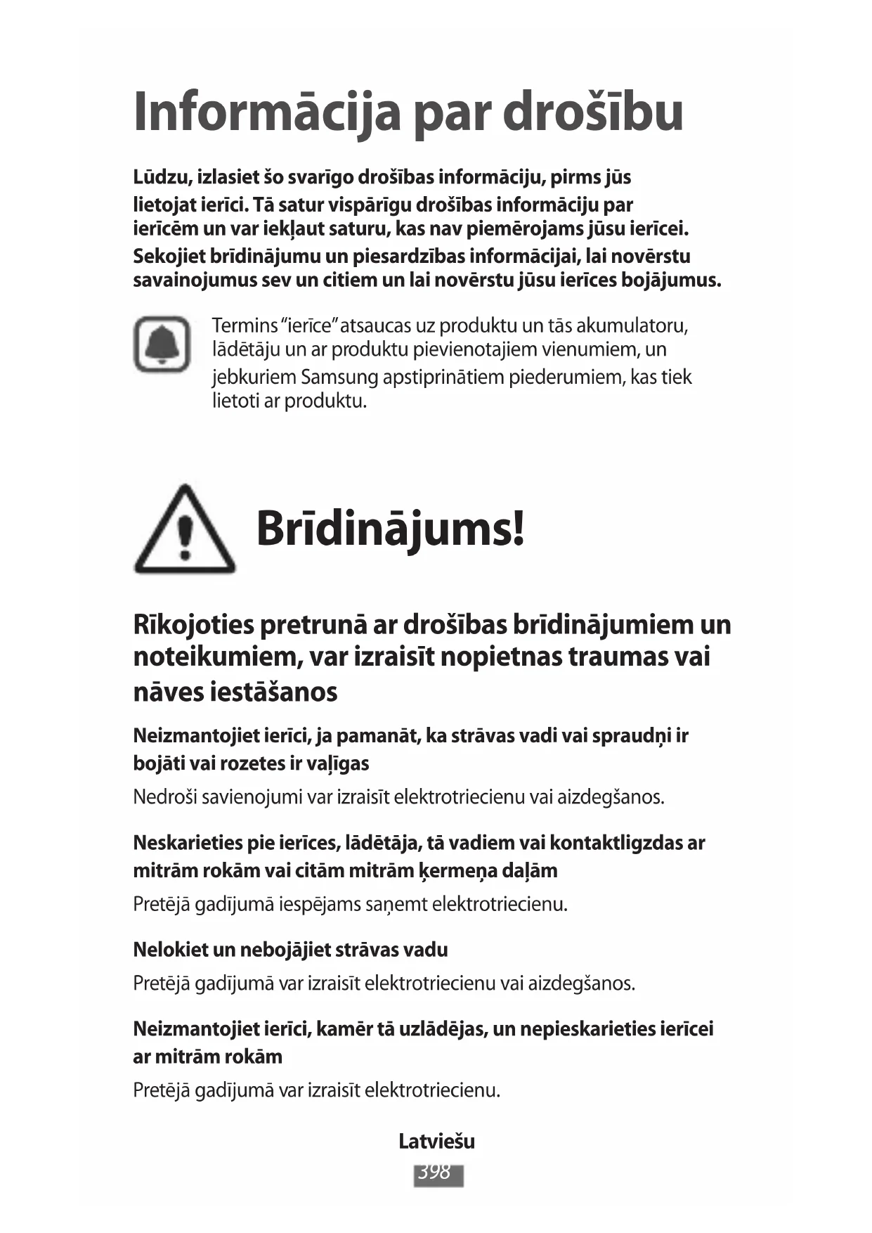 Informācija par drošību Lūdzu, izlasiet šo svarīgo drošības informāciju, pirms jūs lietojat ierīci. Tā satur vispārīgu drošības informāciju par ierīcēm un var iekļaut saturu, kas nav piemērojams jūsu ierīcei. Sekojiet brīdinājumu un piesardzības informācijai, lai novērstu savainojumus sev un citiem un lai novērstu jūsu ierīces bojājumus. Termins “ierīce” atsaucas uz produktu un tās akumulatoru, lādētāju un ar produktu pievienotajiem vienumiem, un jebkuriem Samsung apstiprinātiem piederumiem, kas tiek lietoti ar produktu. Brīdinājums! Rīkojoties pretrunā ar drošības brīdinājumiem un noteikumiem, var izraisīt nopietnas traumas vai nāves iestāšanos Neizmantojiet ierīci, ja pamanāt, ka strāvas vadi vai spraudņi ir bojāti vai rozetes ir vaļīgas Nedroši savienojumi var izraisīt elektrotriecienu vai aizdegšanos. Neskarieties pie ierīces, lādētāja, tā vadiem vai kontaktligzdas ar mitrām rokām vai citām mitrām ķermeņa daļām Pretējā gadījumā iespējams saņemt elektrotriecienu. Nelokiet un nebojājiet strāvas vadu Pretējā gadījumā var izraisīt elektrotriecienu vai aizdegšanos. Neizmantojiet ierīci, kamēr tā uzlādējas, un nepieskarieties ierīcei ar mitrām rokām Pretējā gadījumā var izraisīt elektrotriecienu.Latviešu