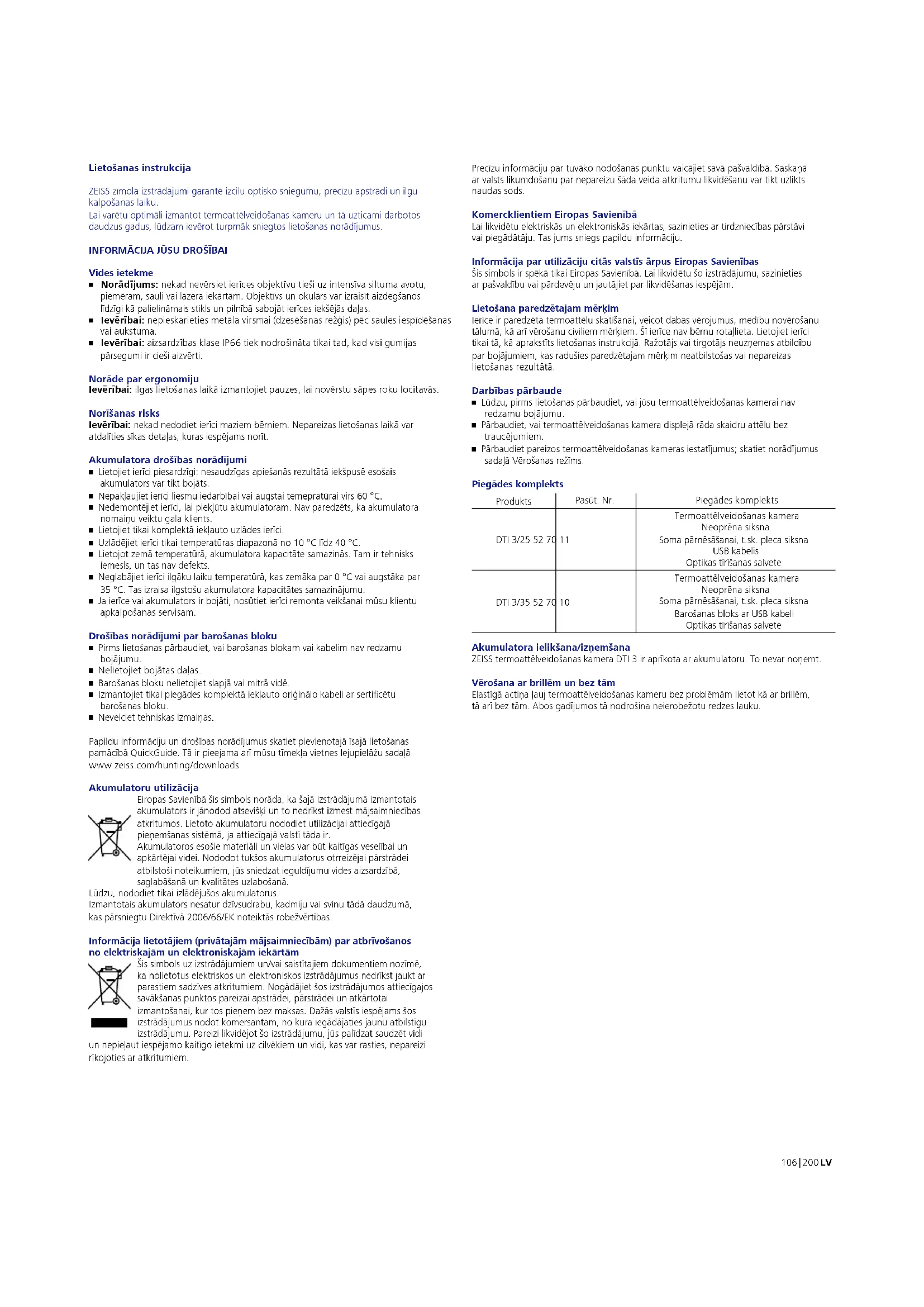 - Neveiciet tehniskas izmaiņas. Papildu informāciju un drošības norādījumus skatiet pievienotajā īsajā lietošanas pamācībā QuickGuide. Tā ir pieejama arī mūsu tīmekļa vietnes lejupielāžu sadaļā www.zeiss.com/hunting/downloads Akumulatoru utilizācija Eiropas Savienībā šis simbols norāda, ka šajā izstrādājumā izmantotais akumulators ir jānodod atsevišķi un to nedrīkst izmest mājsaimniecības atkritumos. Lietoto akumulatoru nododiet utilizācijai attiecīgajā pieņemšanas sistēmā, ja attiecīgajā valstī tāda ir. Akumulatoros esošie materiāli un vielas var būt kaitīgas veselībai un apkārtējai videi. Nododot tukšos akumulatorus otrreizējai pārstrādei atbilstoši noteikumiem, jūs sniedzat ieguldījumu vides aizsardzībā, saglabāšanā un kvalitātes uzlabošanā. Lūdzu, nododiet tikai izlādējušos akumulatorus. Izmantotais akumulators nesatur dzīvsudrabu, kadmiju vai svinu tādā daudzumā, kas pārsniegtu Direktīvā 2006/66/EK noteiktās robežvērtības. Informācija lietotājiem (privātajām mājsaimniecībām) par atbrīvošanos no elektriskajām un elektroniskajām iekārtām Šis simbols uz izstrādājumiem un/vai saistītajiem dokumentiem nozīmē, ka nolietotus elektriskos un elektroniskos izstrādājumus nedrīkst jaukt ar parastiem sadzīves atkritumiem. Nogādājiet šos izstrādājumos attiecīgajos savākšanas punktos pareizai apstrādei, pārstrādei un atkārtotai izmantošanai, kur tos pieņem bez maksas. Dažās valstīs iespējams šos izstrādājumus nodot komersantam, no kura iegādājaties jaunu atbilstīgu izstrādājumu. Pareizi likvidējot šo izstrādājumu, jūs palīdzat saudzēt vidi un nepieļaut iespējamo kaitīgo ietekmi uz cilvēkiem un vidi, kas var rasties, nepareizi rīkojoties ar atkritumiem. Precīzu informāciju par tuvāko nodošanas punktu vaicājiet savā pašvaldībā. Saskaņā ar valsts likumdošanu par nepareizu šāda veida atkritumu likvidēšanu var tikt uzlikts naudas sods. Komercklientiem Eiropas Savienībā Lai likvidētu elektriskās un elektroniskās iekārtas, sazinieties ar tirdzniecības pārstāvi vai piegādātāju. Tas jums sniegs papildu informāciju. Informācija par utilizāciju citās valstīs ārpus Eiropas Savienības Šis simbols ir spēkā tikai Eiropas Savienībā. Lai likvidētu šo izstrādājumu, sazinieties arpašvaldību vai pārdevēju un jautājiet par likvidēšanas iespējām. Lietošana paredzētajam mērķim Ierīce ir paredzēta termoattēlu skatīšanai, veicot dabas vērojumus, medību novērošanu tālumā, kā arī vērošanu civiliem mērķiem. Šī ierīce nav bērnu rotaļlieta. Lietojiet ierīci tikai tā, kā aprakstīts lietošanas instrukcijā. Ražotājs vai tirgotājs neuzņemas atbildību par bojājumiem, kas radušies paredzētajam mērķim neatbilstošas vai nepareizas lietošanas rezultātā. Darbības pārbaude