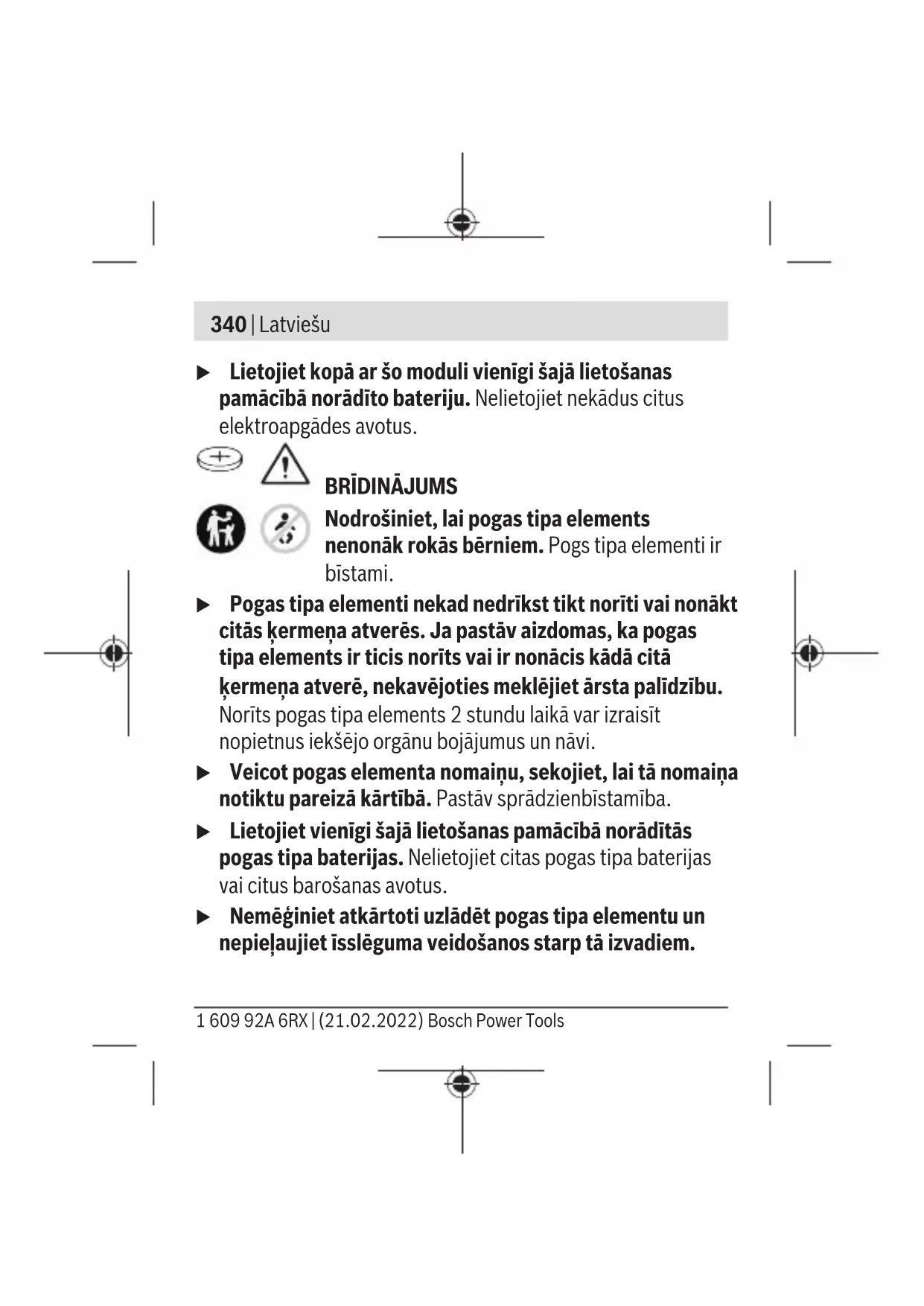 Nodrošiniet, lai pogas tipa elements nenonāk rokās bērniem. Pogs tipa elementi ir bīstami. u Pogas tipa elementi nekad nedrīkst tikt norīti vai nonākt citās ķermeņa atverēs. Ja pastāv aizdomas, ka pogas tipa elements ir ticis norīts vai ir nonācis kādā citā ķermeņa atverē, nekavējoties meklējiet ārsta palīdzību. Norīts pogas tipa elements 2 stundu laikā var izraisīt nopietnus iekšējo orgānu bojājumus un nāvi. u Veicot pogas elementa nomaiņu, sekojiet, lai tā nomaiņa notiktu pareizā kārtībā. Pastāv sprādzienbīstamība. u Lietojiet vienīgi šajā lietošanas pamācībā norādītās pogas tipa baterijas. Nelietojiet citas pogas tipa baterijas vai citus barošanas avotus. u Nemēģiniet atkārtoti uzlādēt pogas tipa elementu un nepieļaujiet īsslēguma veidošanos starp tā izvadiem. 1 609 92A 6RX | (21.02.2022) Bosch Power ToolsLatviešu | 341 Pogas tipa elements var zaudēt hermētiskumu, sprāgt, aizdegties un savainot cilvēkus. u Nolietotos pogas tipa elementus izņemiet un utilizējiet atbilstoši spēkā esošajiem noteikumiem. Nolietotie pogas tipa elementi var zaudēt hermētiskumu un šī iemesla dēļ bojāt izstrādājumu vai savainot cilvēkus. u Nepārkarsējiet pogas tipa elementu un nemetiet to ugunī. Pogas tipa elements var zaudēt hermētiskumu, sprāgt, aizdegties un savainot cilvēkus. u Nebojājiet un neizjauciet pogas tipa elementu. Pogas tipa elements var zaudēt hermētiskumu, sprāgt, aizdegties un savainot cilvēkus. u Neļaujiet bojātajam pogas tipa elementam nonākt saskarē ar ūdeni. Izplūdušajam litijam saskaroties ar ūdeni, var veidoties ūdeņradis, kas var izraisīt aizdegšanos, sprādzienu vai savainot cilvēkus. Vārdiskā zīme Bluetooth®, kā arī grafiskais attēlojums (logotips) ir uzņēmuma Bluetooth SIG, Inc. reģistrēta preču zīme un īpašums. Uzņēmums Robert Bosch Power Tools GmbH šo vārdisko zīmi/grafisko attēlojumu lieto licencēti. Bosch Power Tools 1 609 92A 6RX | (21.02.2022)342 | Latviešu u Pārtrauciet lietot Bluetooth® moduli, ja tā vāciņu vairs nav iespējams aizvērt; šādā gadījumā izņemiet pogas tipa elementu un nodrošiniet modulim nepieciešamo remontu. Izstrādājuma un tā funkciju apraksts Pielietojums Bluetooth® Low Energy Module GCY42dod iespēju personalizēt elektroinstrumentu un pārbaudīt tā statusu, kā arī pārsūtīt iestatījumus un datus, izmantojot Bluetooth® radio tehnoloģiju. Datu pārsūtīšana jāsaskaņo ar instrumenta lietotāju. Informācija par piedāvājamo savienojamības funkciju ir atrodama lietotnē Bosch Toolbox, kā arī izmantojamā elektroinstrumenta lietošanas pamācībā. Attēlotās sastāvdaļas Attēloto sastāvdaļu numerācija atbilst grafiskajās lappusēs sniegtajiem attēliem. (1) Pogas tipa baterija (2) Bluetooth® Low Energy Module GCY 42 1 609 92A 6RX | (21.02.2022) Bosch Power ToolsLatviešu | 343 (3) Vietturis