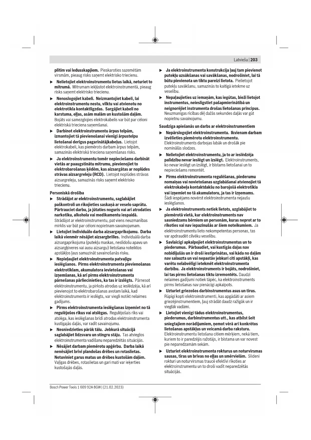 (2608000766) – universālai lietošanai uz līdzenām un izliektām virsmām – Komplekts sastāv no mīkstas slīpēšanas pamatnes un porainā paliktņa (2608000765). Slīpēšanas pamatni drīkst lietot tikai kopā ar poraino paliktni. Slīpēšanas pamatne, vidēji cieta (2608000764) – liels slīpēšanas ātrums, ideāls cietu materiālu slīpēšanai un vecu sienas krāsu noņemšanai – lietošanai uz līdzenām virsmām – Optimāls uzsūkšanas atbalsts atvieglo darbu ar putekļu uzsūcēja palīdzību. A) Standarta piegādes komplekts Porainā paliktņa nomaiņa (skat.attēluA) Izmantojot mīksto slīpēšanas pamatni (standarta piegādes komplekts), vienmēr ir jāizmanto porainais paliktnis(14). Lai noņemtu poraino paliktni(14), paceliet to no sāniem un novelciet to no slīpēšanas pamatnes(16). Pirms jauna porainā paliktņa iestiprināšanas notīriet netīrumus un putekļus no slīpēšanas pamatnes(16), piemēram, ar otu. Porainā paliktņā virsma(16) ir izveidota no līpoša materiāla , lai poraino paliktni būtu iespējams ātri un vienkārši piestiprināt. Poraino paliktni(14) cieši piespiediet pie slīpēšanas pamatnes(16) apakšpuses. Bosch Power Tools 1 609 92A 8GW | (21.02.2023)206 | Latviešu Lai panāktu efektīvu putekļu uzsūkšanu, sekojiet, lai porainajā paliktnī(14) ieštancētie atvērumi precīzi sakristu ar urbumiem slīpēšanas pamatnē(16). Slīpēšanas pamatnes nomaiņa (skat.attēluB) Norāde: bojātu slīpēšanas pamatni (16) nomainiet nekavējoties. Novelciet slīploksni(13) un poraino paliktni(14). Pilnībā izskrūvējiet skrūvi (15) un noņemiet slīpēšanas pamatni (16). Uzlieciet jaunu slīpēšanas pamatni (16) un stingri pievelciet skrūvi. Norāde: uzliekot slīpēšanas pamatni, raugieties, lai līdzņēmēja zobrievojums saķertos ar slīpēšanas pamatnes ierobiem. Norāde: bojātu slīpēšanas pamatnes turētāju drīkst nomainīt tikai Bosch pilnvarotā elektroinstrumentu remonta darbnīcā. Pagarinošās caurules ievietošana/izņemšana (skat.attēlusC−D) Izmantojiet pagarinošo cauruli(9) tikai nepieciešamības gadījumā: strādājot bez pagarinošās caurules, būtiski samazinās slīpēšanai nepieciešamais spēks. Norāde: drīkst uzstādīt maks. 2pagarināšanas caurules. Atvienot savienojumu starp slīpēšanas galvu/rokturi/ pagarināšanas cauruli (skat. attēluC): – ➊ Atbrīvojiet fiksēšanas sviru (8). – ➋ Atbrīvojiet fiksācijas āķi (7). – ➌ Novelciet līdz šim savienotās daļas vienu no otras. Nostiprināt savienojumu starp slīpēšanas galvu/roktura daļu/pagarināšanas cauruli (skat. attēluD): – ➍ Atkarībā no vēlamā savienojuma veida, ievietojiet slīpēšanas galvu(10), roktura daļu(6) vai pagarināšanas cauruli(9) vienu otrā. – ➎ Aizvērt fiksācijas āķi(7). – ➏ Nospiediet fiksēšanas sviru(8) tik tālu, līdz tā atrodas pareizā leņķī pret slīpēšanas galvu(10), roktura daļu(6) vai arī pagarinošo cauruli(9). – ➐ Stingri pieskrūvējiet ekscentra skrūvi (20). – ➑ Novelciet fiksēšanas sviru(8). Vienmēr pārbaudiet, vai savienojošās daļas ir nofiksētas un stingri savienotas, izmantojot fiksācijas āķus (7) un fiksēšanas sviru (8). Putekļu un skaidu uzsūkšana Materiālu putekļi var būt kaitīgi veselībai. Pieskaršanās šādiem putekļiem vai to ieelpošana var izraisīt alerģiskas reakcijas vai elpošanas ceļu saslimšanu elektroinstrumenta lietotājam vai darba vietai tuvumā esošajām personām. Atsevišķi putekļu veidi uzskatāmi par vēža izraisītājiem. – Pielietojiet apstrādājamajam materiālam vispiemērotāko putekļu uzsūkšanas metodi. – Darba vietai jābūt labi ventilējamai. – Vienmēr izmantojiet masku elpošanas ceļu aizsardzībai ar filtrēšanas klasi P2. Putekļu nosūkšanas ierīces pievienošana (skatītattēluE) Atkarībā no izmantojamā vakuumsūcēja, izmantojiet vienu no abām pieslēgšanas iespējām: – Ievietojiet uzsūkšanas šļūteni(21) uzsūkšanas īscaurulē(5) uz roktura daļas(6). Pievienojiet uzsūkšanas šļūteni(21) vakuumsūcējam. – Ievietojiet adapteri(22) uzsūkšanas īscaurulē(5) un ļaujiet tam nofiksēties. Ievietojiet vakuumsūcēja sprauslu(23) adapterī(22). Putekļsūcējam jābūt piemērotam, lai sūktu apstrādājamā materiāla putekļus. Veselībai īpaši kaitīgus, kancerogēnus vai saususputekļus savāciet ar speciālu putekļsūcēju. Lielām virsmām izmantojiet uzsūkšanas ierīci GAS35L/ MAFC vai GAS55L/MAFC, jo tās nodrošina nepieciešamo nepārtraukto uzsūkšanas jaudu. Apstrādājot vertikālas virsmas, turiet elektroinstrumentu tā, lai nosūkšanas šļūtene būtu vērsta lejup. Šļūtenes/kabeļa klipša montāža/demontāža (skat.attēluF) Uzlieciet šļūtenes/kabeļa klipsi (24) virs nosūkšanas šļūtenes (21). Ievietojiet tīkla kabeli šļūtenes/kabeļa klipša gropē. Lai veiktu demontāžu, noņemiet šļūtenes/kabeļa klipsi (24) no nosūkšanas šļūtenes (21) un izņemiet tīkla kabeli no šļūtenes/kabeļa klipša. Lietošana Lietošanas sākšana u Pievadiet elektroinstrumentam pareizu spriegumu! Elektrobarošanas avota spriegumam jāatbilst vērtībai, kas ir norādīta uz elektroinstrumenta marķējuma plāksnītes. Elektroinstrumenti, kas paredzēti 230V spriegumam, var darboties arī no 220V elektrotīkla. Griešanās ātruma izvēle Griešanās ātruma regulēšanas pirkstrats(2) ļauj jums veikt nepieciešamā griešanās ātruma priekšatlasi arī darbības laikā. Lielāki skaitļi norāda uz lielu griešanās ātrumu, savukārt mazi skaitļi norāda uz mazu griešanās ātrumu. Elektroniskais gaitas stabilizators dod iespēju uzturēt gandrīz nemainīgu darbvārpstas griešanās ātrumu, slodzei mainoties no brīvgaitas līdz maksimālajai vērtībai, kas ļauj stabilizēt apstrādes režīmu. Instrumenta ieskrējiena laikā tā griezes moments tiek elektroniski ierobežots, šādi p