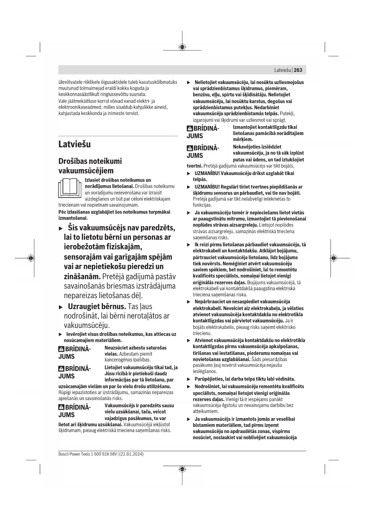 Klienditeenindus ja kasutusalane nõustamine Klienditeeninduse töötajad vastavad teie küsimustele teie toote remondi ja hoolduse ning varuosade kohta. Joonised ja info varuosade kohta leiate ka veebisaidilt: www.bosch-pt.com Boschi nõustajad on meeleldi abiks, kui teil on küsimusi toodete ja lisatarvikute kasutamise kohta. Päringute esitamisel ja varuosade tellimisel teatage meile kindlasti toote tüübisildil olev 10‑kohaline tootenumber. Eesti Vabariik Teeninduskeskus Tel.: (+372) 6549 575 Faks: (+372) 6549 576 E-posti: service-pt@lv.bosch.com Muud teeninduse aadressid leiate jaotisest: www.bosch-pt.com/serviceaddresses Kasutuskõlbmatuks muutunud seadmete käitlus Tolmuimeja, tarvikud ja pakendid tuleb suunata keskkonnasäästlikult ringlussevõttu. Ärge visake tolmuimejat olmejäätmete hulka! Üksnes ELliikmesriikidele: Vastavalt Euroopa direktiivile 2012/19/EL elektri- ja elektroonikaseadmete jäätmete kohta ning direktiivi 1 609 92A 98V | (22.01.2024) Bosch Power ToolsLatviešu | 263 ülevõtvatele riiklikele õigusaktidele tuleb kasutuskõlbmatuks muutunud tolmuimejad eraldi kokku koguda ja keskkonnasäästlikult ringlussevõttu suunata. Vale jäätmekäitluse korral võivad vanad elektri- ja elektroonikaseadmed, milles sisaldub kahjulikke aineid, kahjustada keskkonda ja inimeste tervist. Latviešu Drošības noteikumi vakuumsūcējiem Izlasiet drošības noteikumus un norādījumus lietošanai. Drošības noteikumu un norādījumu neievērošana var izraisīt aizdegšanos un būt par cēloni elektriskajam triecienam vai nopietnam savainojumam. Pēc izlasīšanas uzglabājiet šos noteikumus turpmākai izmantošanai. u Šis vakuumsūcējs nav paredzēts, lai to lietotu bērni un personas ar ierobežotām fiziskajām, sensorajām vai garīgajām spējām vai ar nepietiekošu pieredzi un zināšanām. Pretējā gadījumā pastāv savainošanās briesmas izstrādājuma nepareizas lietošanas dēļ. u Uzraugiet bērnus. Tas ļaus nodrošināt, lai bērni nerotaļātos ar vakuumsūcēju. u Ievērojiet visus drošības noteikumus, kas attiecas uz nosūcamajiem materiāliem. BRĪDINĀ- JUMS Neuzsūciet azbestu saturošas vielas. Azbestam piemīt kancerogēnas īpašības. BRĪDINĀ- JUMS Lietojiet vakuumsūcēju tikai tad, ja Jūsu rīcībā ir pietiekoši daudz informācijas par tā lietošanu, par uzsūcamajām vielām un par šo vielu drošu utilizēšanu. Rūpīgi iepazīstoties ar izstrādājumu, samazinās nepareizas apiešanās un savainošanās risks. BRĪDINĀ- JUMS Vakuumsūcējs ir paredzēts sausu vielu uzsūkšanai, taču, veicot vajadzīgus pasākumus, to var lietot arī šķidrumu uzsūkšanai. Vakuumsūcējā iekļūstot šķidrumam, pieaug elektriskā trieciena saņemšanas risks. u Nelietojiet vakuumsūcēju, lai nosūktu uzliesmojošus vai sprādzienbīstamus šķidrumus, piemēram, benzīnu, eļļu, spirtu vai šķīdinātāju. Nelietojiet vakuumsūcēju, lai nosūktu karstus, degošus vai sprādzienbīstamus putekļus. Nedarbiniet vakuumsūcēju sprādzienbīstamās telpās. Putekļi, izgarojumi vai šķidrumi var uzliesmot vai sprāgt. BRĪDINĀ- JUMS Izmantojiet kontaktligzdu tikai lietošanas pamācībā norādītajiem mērķiem. BRĪDINĀ- JUMS Nekavējoties izslēdziet vakuumsūcēju, ja no tā sāk izplūst putas vai ūdens, un tad iztukšojiet tvertni. Pretējā gadījumā vakuumsūcējs var tikt bojāts. u UZMANĪBU! Vakuumsūcēju drīkst uzglabāt tikai telpās. u UZMANĪBU! Regulāri tīriet tvertnes piepildīšanās ar šķidrumu sensorus un pārbaudiet, vai tie nav bojāti. Pretējā gadījumā var tikt nelabvēlīgi ietekmētas to funkcijas. u Ja vakuumsūcēju tomēr ir nepieciešams lietot vietās ar paaugstinātu mitrumu, izmantojiet tā pievienošanai noplūdes strāvas aizsargreleju. Lietojot noplūdes strāvas aizsargreleju, samazinās elektriskā trieciena saņemšanas risks. u Ik reizi pirms lietošanas pārbaudiet vakuumsūcēju, tā elektrokabeli un kontaktdakšu. Atklājot bojājumu, pārtrauciet vakuumsūcēja lietošanu, līdz bojājums tiek novērsts. Nemēģiniet atvērt vakuumsūcēju saviem spēkiem, bet nodrošiniet, lai to remontētu kvalificēts speciālists, nomaiņai lietojot vienīgi oriģinālās rezerves daļas. Bojājums vakuumsūcējā, tā elektrokabelī vai kontaktdakšā paaugstina elektriskā trieciena saņemšanas risku. u Nepārbrauciet un nesaspiediet vakuumsūcēja elektrokabeli. Nevelciet aiz elektrokabeļa, ja vēlaties atvienot vakuumsūcēja kontaktdakšu no elektrotīkla kontaktligzdas vai pārvietot vakuumsūcēju. Ja ir bojāts elektrokabelis, pieaug risks saņemt elektrisko triecienu. u Atvienot vakuumsūcēja kontaktdakšu no elektrotīkla kontaktligzdas pirms vakuumsūcēja apkalpošanas, tīrīšanas vai iestatīšanas, piederumu nomaiņas vai novietošanas uzglabāšanai. Šāds piesardzības pasākums ļauj novērst vakuumsūcēja nejaušu ieslēgšanos. u Parūpējieties, lai darba telpa tiktu labi vēdināta.u Nodrošiniet, lai vakuumsūcēju remontētu kvalificēts speciālists, nomaiņai lietojot vienīgi oriģinālās rezerves daļas. Vienīgi tā ir iespējams panākt vakuumsūcēja ilgstošu un nevainojamu darbību bez atteikumiem. u Ja vakuumsūcējs ir izmantots jomās ar veselībai bīstamiem materiāliem, tad pirms izņemt vakuumsūcēju no apdraudētās zonas, vispirms nosūciet, noslaukiet vai noblīvējiet vakuumsūcēja Bosch Power Tools 1 609 92A 98V | (22.01.2024)264 | Latviešu ārējo korpusu. Visas vakuumsūcēja daļas tiek uzskatītas par kontaminētām, un jums ir jāveic nepieciešamie pasākumi, lai nodrošinātu, ka veselībai bīstamie materiāli nevar izplatīties. BRĪDINĀ- JUMS Vakuumsūcējs satur veselībai kaitīgus putekļus. Nodrošiniet, lai vakuumsūcēja iztukšošanu un apkopi, tai skaitā putekļu savācējtvertnes noņemšanu veiktu vienīgi kvalificēts personāls. Strādājot ar vakuumsūcēju, nepieciešams lietot atbilstošu aizsargaprīkojumu. Nedar