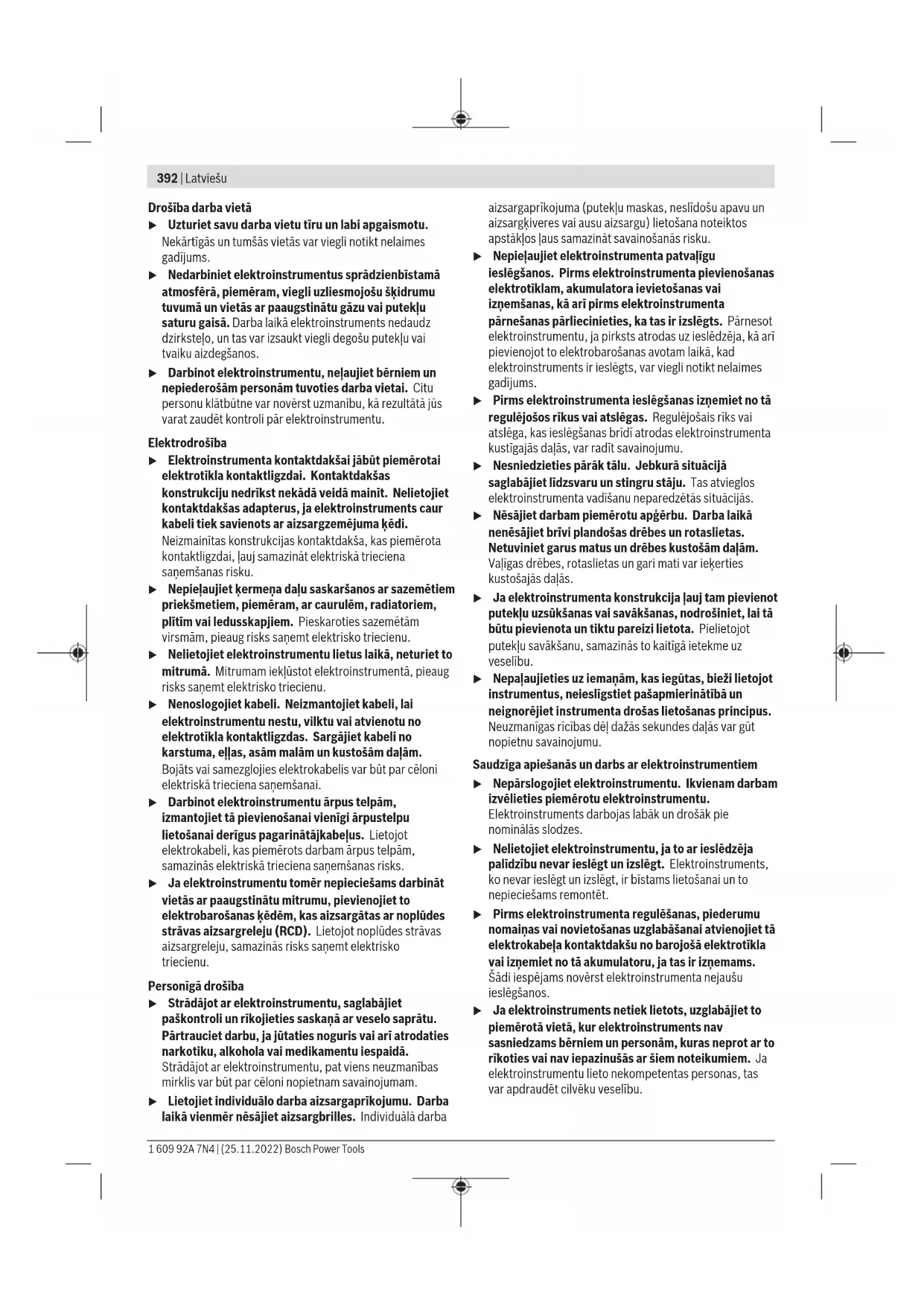Kehtib järgmistele tüüpidele: 3 601 M27 00/... 03/... 07/... 06. Saekettad puidule ja plaatmaterjalidele, paneelidele ja liistudele Saeketas 254x30mm, 40hammast 2608642530 Saekettad kõvale puidule, komposiitmaterjalidele, plastile ja mitteraudmetallidele Saeketas 254 x 30 mm, 80 hammast 2608642528 Klienditeenindus ja kasutusalane nõustamine Klienditeeninduse töötajad vastavad teie küsimustele teie toote remondi ja hoolduse ning varuosade kohta. Joonised ja info varuosade kohta leiate ka veebisaidilt: www.bosch-pt.com Boschi nõustajad on meeleldi abiks, kui teil on küsimusi toodete ja lisatarvikute kasutamise kohta. Päringute esitamisel ja varuosade tellimisel teatage meile kindlasti toote tüübisildil olev 10‑kohaline tootenumber. Eesti Vabariik Teeninduskeskus Tel.: (+372) 6549 575 Faks: (+372) 6549 576 E-posti: service-pt@lv.bosch.com Muud teeninduse aadressid leiate jaotisest: www.bosch-pt.com/serviceaddresses Kasutuskõlbmatuks muutunud seadmete käitlus Elektriseadmed, lisatarvikud ja pakendid tuleks keskkonnasäästlikult ringlusse võtta. Ärge visake kasutusressursi ammendanud elektrilisi tööriistu olmejäätmete hulka! Üksnes ELliikmesriikidele: Vastavalt Euroopa Parlamendi ja nõukogu direktiivile 2012/19/EL elektri- ja elektroonikaseadmete jäätmete kohta ning direktiivi ülevõtvatele riiklikele õigusaktidele tuleb kasutuskõlbmatuks muutunud elektrilised tööriistad eraldi kokku koguda ja keskkonnasäästlikult korduskasutada või ringlusse võtta. Vale jäätmekäitluse korral võivad vanad elektri- ja elektroonikaseadmed, milles sisaldub kahjulikke aineid, kahjustada keskkonda ja inimeste tervist. Latviešu Drošības noteikumi Vispārējie drošības noteikumi darbam ar elektroinstrumentiem BRĪDINĀ- JUMS Izlasiet visus drošības noteikumus un instrukcijas, aplūkojiet ilustrācijas un iepazīstieties ar specifikācijām, kas tiek piegādātas kopā ar šo elektroinstrumentu. Šeit sniegto drošības noteikumu un instrukciju neievērošana var izraisīt aizdegšanos un būt par cēloni elektriskajam triecienam vai nopietnam savainojumam. Pēc izlasīšanas uzglabājiet šos noteikumus turpmākai izmantošanai. Drošības noteikumos lietotais apzīmējums "elektroinstruments" attiecas gan uz Jūsu tīkla elektroinstrumentiem (ar elektrokabeli), gan arī uz akumulatora elektroinstrumentiem (bez elektrokabeļa). Bosch Power Tools 1 609 92A 7N4 | (25.11.2022)392 | Latviešu Drošība darba vietā u Uzturiet savu darba vietu tīru un labi apgaismotu. Nekārtīgās un tumšās vietās var viegli notikt nelaimes gadījums. u Nedarbiniet elektroinstrumentus sprādzienbīstamā atmosfērā, piemēram, viegli uzliesmojošu šķidrumu tuvumā un vietās ar paaugstinātu gāzu vai putekļu saturu gaisā. Darba laikā elektroinstruments nedaudz dzirksteļo, un tas var izsaukt viegli degošu putekļu vai tvaiku aizdegšanos. u Darbinot elektroinstrumentu, neļaujiet bērniem un nepiederošām personām tuvoties darba vietai. Citu personu klātbūtne var novērst uzmanību, kā rezultātā jūs varat zaudēt kontroli pār elektroinstrumentu. Elektrodrošība u Elektroinstrumenta kontaktdakšai jābūt piemērotai elektrotīkla kontaktligzdai. Kontaktdakšas konstrukciju nedrīkst nekādā veidā mainīt. Nelietojiet kontaktdakšas adapterus, ja elektroinstruments caur kabeli tiek savienots ar aizsargzemējuma ķēdi. Neizmainītas konstrukcijas kontaktdakša, kas piemērota kontaktligzdai, ļauj samazināt elektriskā trieciena saņemšanas risku. u Nepieļaujiet ķermeņa daļu saskaršanos ar sazemētiem priekšmetiem, piemēram, ar caurulēm, radiatoriem, plītīm vai ledusskapjiem. Pieskaroties sazemētām virsmām, pieaug risks saņemt elektrisko triecienu. u Nelietojiet elektroinstrumentu lietus laikā, neturiet to mitrumā. Mitrumam iekļūstot elektroinstrumentā, pieaug risks saņemt elektrisko triecienu. u Nenoslogojiet kabeli. Neizmantojiet kabeli, lai elektroinstrumentu nestu, vilktu vai atvienotu no elektrotīkla kontaktligzdas. Sargājiet kabeli no karstuma, eļļas, asām malām un kustošām daļām. Bojāts vai samezglojies elektrokabelis var būt par cēloni elektriskā trieciena saņemšanai. u Darbinot elektroinstrumentu ārpus telpām, izmantojiet tā pievienošanai vienīgi ārpustelpu lietošanai derīgus pagarinātājkabeļus. Lietojot elektrokabeli, kas piemērots darbam ārpus telpām, samazinās elektriskā trieciena saņemšanas risks. u Ja elektroinstrumentu tomēr nepieciešams darbināt vietās ar paaugstinātu mitrumu, pievienojiet to elektrobarošanas ķēdēm, kas aizsargātas ar noplūdes strāvas aizsargreleju (RCD). Lietojot noplūdes strāvas aizsargreleju, samazinās risks saņemt elektrisko triecienu. Personīgā drošība u Strādājot ar elektroinstrumentu, saglabājiet paškontroli un rīkojieties saskaņā ar veselo saprātu. Pārtrauciet darbu, ja jūtaties noguris vai arī atrodaties narkotiku, alkohola vai medikamentu iespaidā. Strādājot ar elektroinstrumentu, pat viens neuzmanības mirklis var būt par cēloni nopietnam savainojumam. u Lietojiet individuālo darba aizsargaprīkojumu. Darba laikā vienmēr nēsājiet aizsargbrilles. Individuālā darba aizsargaprīkojuma (putekļu maskas, neslīdošu apavu un aizsargķiveres vai ausu aizsargu) lietošana noteiktos apstākļos ļaus samazināt savainošanās risku. u Nepieļaujiet elektroinstrumenta patvaļīgu ieslēgšanos. Pirms elektroinstrumenta pievienošanas elektrotīklam, akumulatora ievietošanas vai izņemšanas, kā arī pirms elektroinstrumenta pārnešanas pārliecinieties, ka tas ir izslēgts. Pārnesot elektroinstrumentu, ja pirksts atrodas uz ieslēdzēja, kā arī pievienojot to elektrobarošanas avotam laikā, kad elektroinstruments ir ieslēgts, var viegli notikt nelaimes gadījums. u Pirms elektroinstrumenta ieslēgšanas izņemiet no tā regulējošos rīkus vai atslēgas. Regulējošais rīks vai atslēga, kas ieslēgšanas brīdī atrodas elek