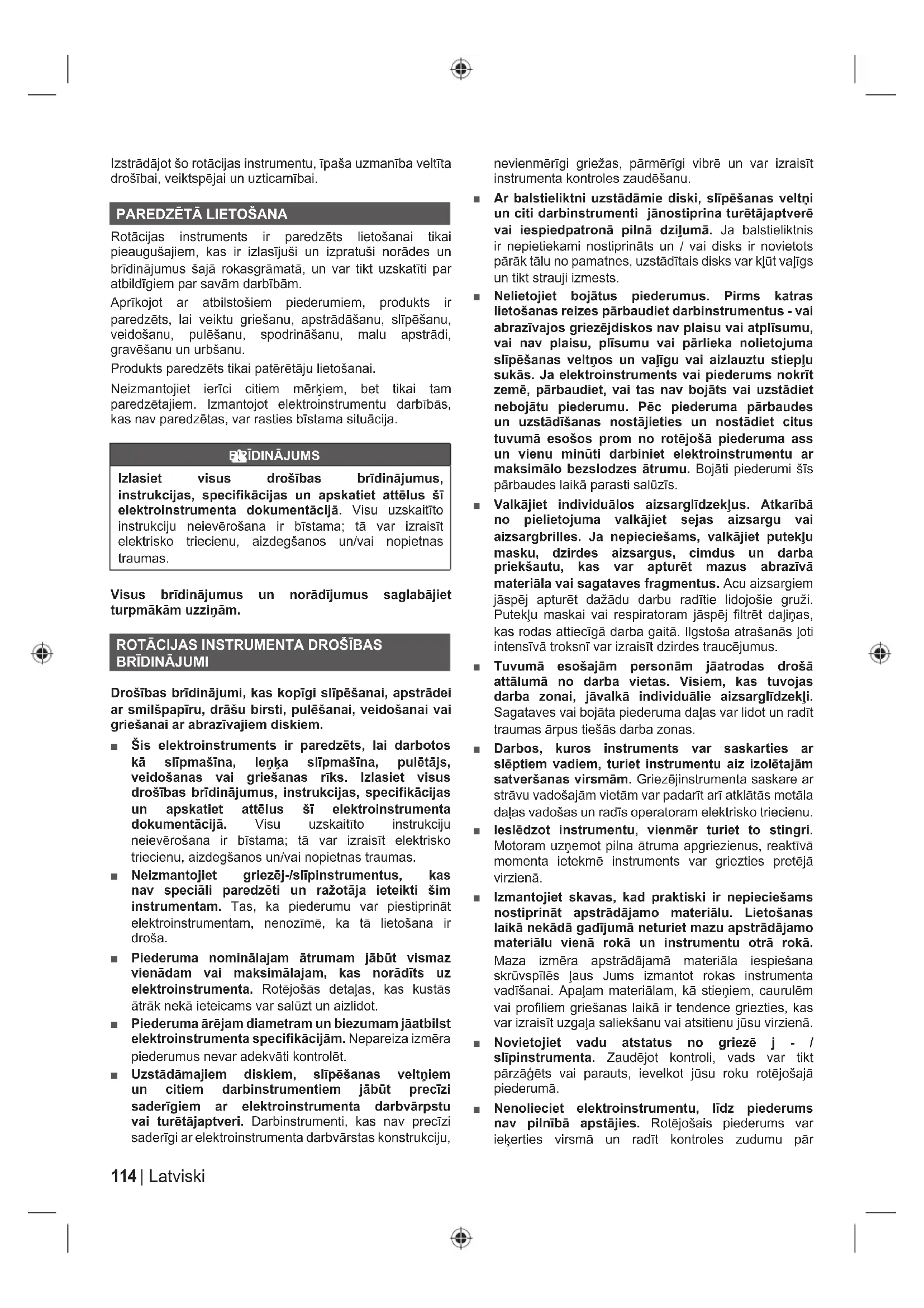 Rotācijas instruments ir paredzēts lietošanai tikai pieaugušajiem, kas ir izlasījuši un izpratuši norādes un brīdinājumus šajā rokasgrāmatā, un var tikt uzskatīti par atbildīgiem par savām darbībām. Aprīkojot ar atbilstošiem piederumiem, produkts ir paredzēts, lai veiktu griešanu, apstrādāšanu, slīpēšanu, veidošanu, pulēšanu, spodrināšanu, malu apstrādi, gravēšanu un urbšanu. Produkts paredzēts tikai patērētāju lietošanai. Neizmantojiet ierīci citiem mērķiem, bet tikai tam paredzētajiem. Izmantojot elektroinstrumentu darbībās, kas nav paredzētas, var rasties bīstama situācija.