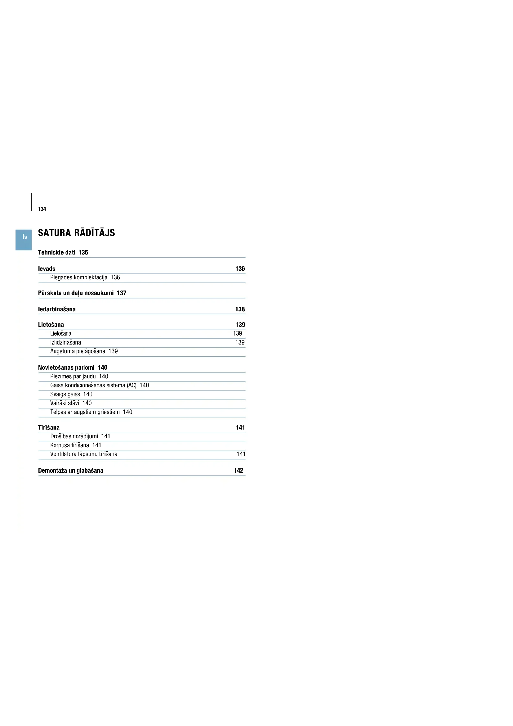 Tehniskie dati 135 Ievads 136 Piegādes komplektācija 136 Pārskats un daļu nosaukumi 137 Iedarbināšana 138 Lietošana 139 Lietošana 139 Izlīdzināšana 139 Augstuma pielāgošana 139 Novietošanas padomi 140 Piezīmes par jaudu 140 Gaisa kondicionēšanas sistēma (AC) 140 Svaigs gaiss 140 Vairāki stāvi 140 Telpas ar augstiem griestiem 140 Tīrīšana 141 Drošības norādījumi 141 Korpusa tīrīšana 141 Ventilatora lāpstiņu tīrīšana 141 Demontāža un glabāšana 142135