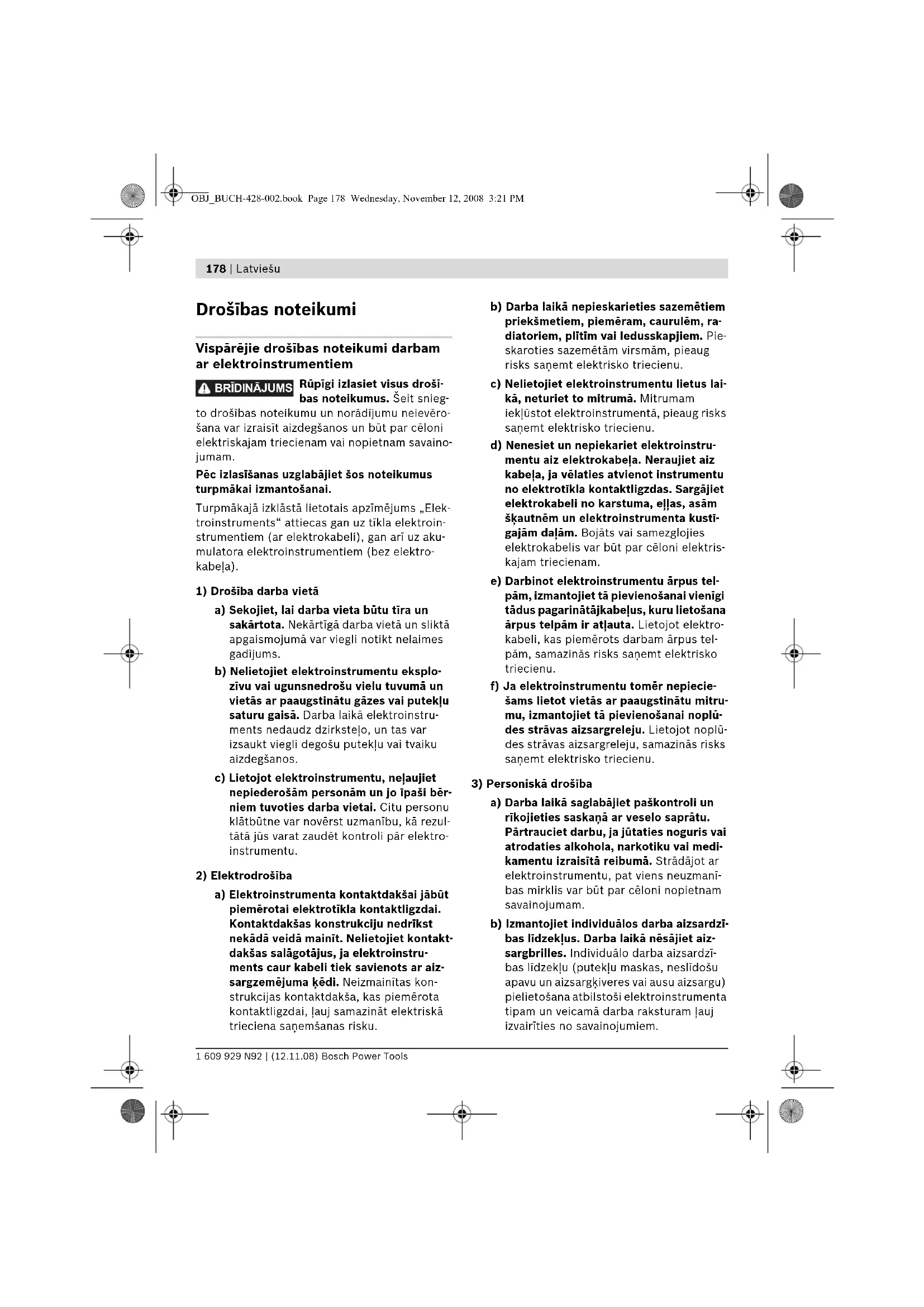 OBJ_BUCH-428-002.book Page 178 Wednesday, November 12, 2008 3:21 PMLatviešu | 179 Bosch Power Tools 1 609 929 N92 | (12.11.08) c) Nepieļaujiet elektroinstrumenta patvaļī- gu ieslēgšanos. Pirms elektroinstrumen- ta pievienošanas elektrotīklam, akumu- latora ievietošanas vai izņemšanas, kā arī pirms elektroinstrumenta pārnešanas pārliecinieties, ka tas ir izslēgts. Pārne- sot elektroinstrumentu, ja pirksts atrodas uz ieslēdzēja, kā arī pievienojot to elektro- barošanas avotam laikā, kad elektro- instruments ir ieslēgts, var viegli notikt nelaimes gadījums. d) Pirms elektroinstrumenta ieslēgšanas neaizmirstiet izņemt no tā regulējošos instrumentus vai atslēgas. Regulējošais instruments vai atslēga, kas ieslēgšanas brīdī atrodas elektroinstrumenta kustīga- jās daļās, var radīt savainojumu. e) Darba laikā izvairieties ieņemt neērtu vai nedabisku ķermeņa stāvokli. Vienmēr ieturiet stingru stāju un centieties sagla- bāt līdzsvaru. Tas atvieglo instrumenta vadību neparedzētās situācijās. f) Izvēlieties darbam piemērotu apģērbu. Darba laikā nenēsājiet brīvi plandošas drēbes un rotaslietas. Netuviniet matus, apģērbu un aizsargcimdus instrumenta kustīgajām daļām. Vaļīgas drēbes, rotas- lietas un gari mati var ieķerties instrumen- ta kustīgajās daļās. g) Ja elektroinstrumenta konstrukcija ļauj tam pievienot ārējo putekļu uzsūkšanas vai savākšanas/uzkrāšanas ierīci, seko- jiet, lai tā būtu pievienota un pareizi dar- botos. Pielietojot putekļu uzsūkšanu vai savākšanu/uzkrāšanu, samazinās to kaitīgā ietekme uz strādājošās personas veselību.