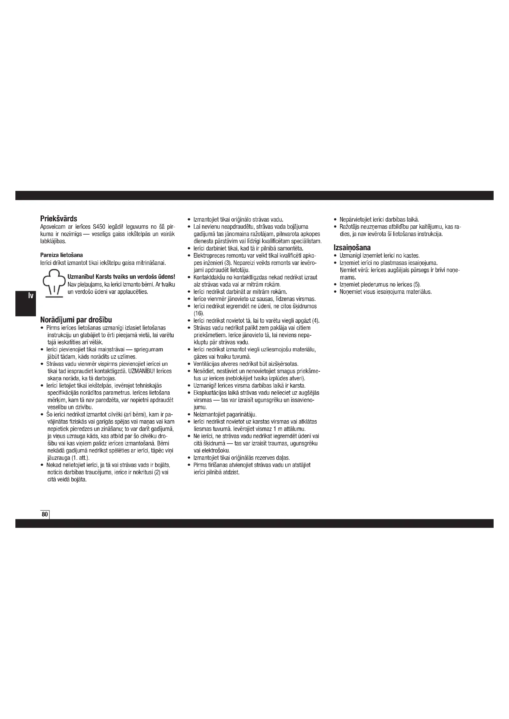 Priekšvārds Apsveicam ar ierīces S450 iegādi! Ieguvums no šā pir- kuma ir nozīmīgs— veselīgs gaiss iekštelpās un vairāk labklājības. Pareiza lietošana Ierīci drīkst izmantot tikai iekštelpu gaisa mitrināšanai. Uzmanību! Karsts tvaiks un verdošs ūdens! Nav pieļaujams, ka ierīci izmanto bērni. Ar tvaiku un verdošo ūdeni var applaucēties. Norādījumi par drošību