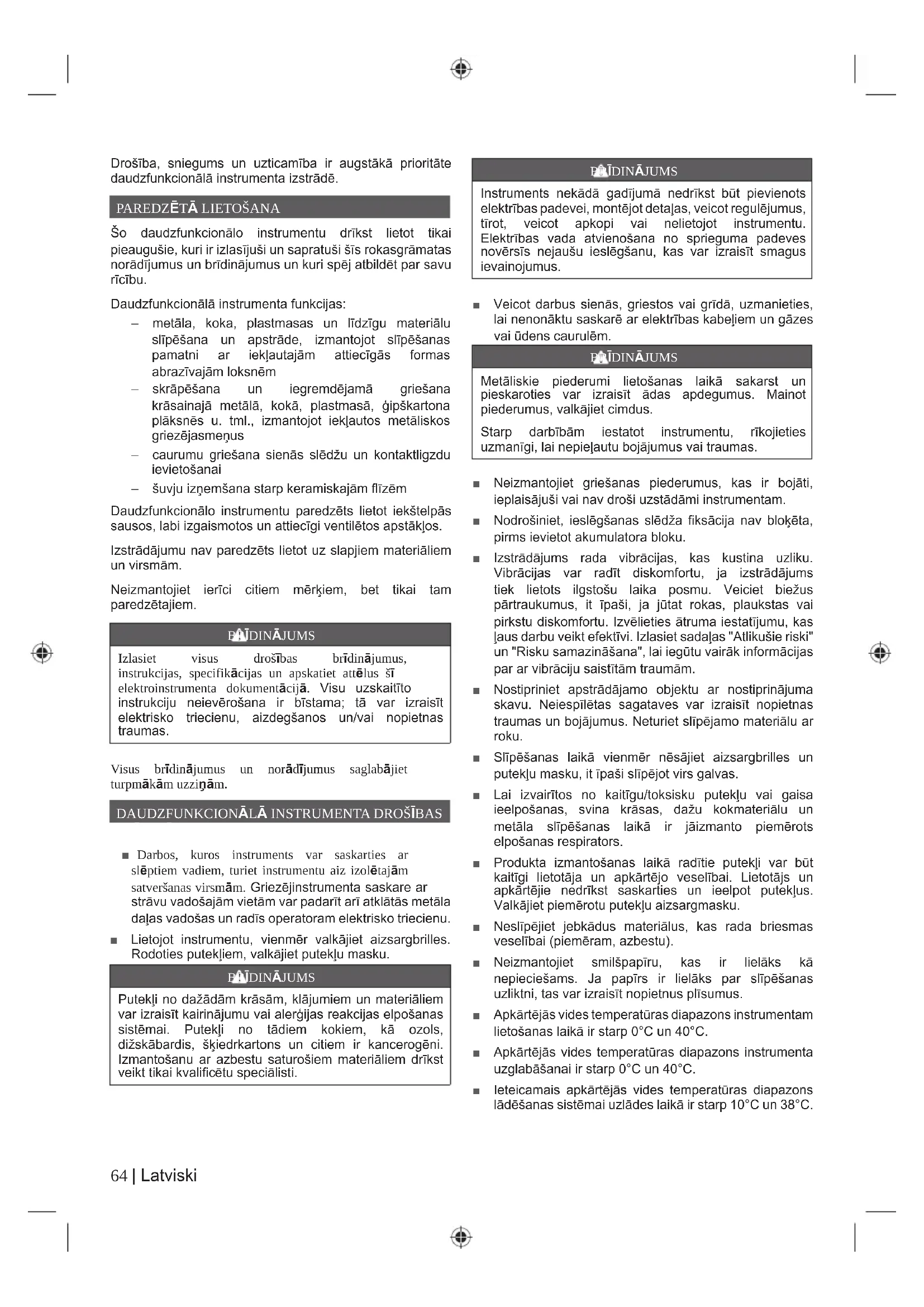 Metāliskie piederumi lietošanas laikā sakarst un pieskaroties var izraisīt ādas apdegumus. Mainot piederumus, valkājiet cimdus. Starp darbībām iestatot instrumentu, rīkojieties uzmanīgi, lai nepieļautu bojājumus vai traumas. ■ Neizmantojiet griešanas piederumus, kas ir bojāti, ieplaisājuši vai nav droši uzstādāmi instrumentam. ■ Nodrošiniet, ieslēgšanas slēdža fiksācija nav bloķēta, pirms ievietot akumulatora bloku. ■ Izstrādājums rada vibrācijas, kas kustina uzliku. Vibrācijas var radīt diskomfortu, ja izstrādājums tiek lietots ilgstošu laika posmu. Veiciet biežus pārtraukumus, it īpaši, ja jūtat rokas, plaukstas vai pirkstu diskomfortu. Izvēlieties ātruma iestatījumu, kas ļaus darbu veikt efektīvi. Izlasiet sadaļas "Atlikušie riski" un "Risku samazināšana", lai iegūtu vairāk informācijas par ar vibrāciju saistītām traumām. ■ Nostipriniet apstrādājamo objektu ar nostiprinājuma skavu. Neiespīlētas sagataves var izraisīt nopietnas traumas un bojājumus. Neturiet slīpējamo materiālu ar roku. ■ Slīpēšanas laikā vienmēr nēsājiet aizsargbrilles un putekļu masku, it īpaši slīpējot virs galvas. ■ Lai izvairītos no kaitīgu/toksisku putekļu vai gaisa ieelpošanas, svina krāsas, dažu kokmateriālu un metāla slīpēšanas laikā ir jāizmanto piemērots elpošanas respirators. ■ Produkta izmantošanas laikā radītie putekļi var būt kaitīgi lietotāja un apkārtējo veselībai. Lietotājs un apkārtējie nedrīkst saskarties un ieelpot putekļus. Valkājiet piemērotu putekļu aizsargmasku. ■ Neslīpējiet jebkādus materiālus, kas rada briesmas veselībai (piemēram, azbestu). ■ Neizmantojiet smilšpapīru, kas ir lielāks kā nepieciešams. Ja papīrs ir lielāks par slīpēšanas uzliktni, tas var izraisīt nopietnus plīsumus. ■ Apkārtējās vides temperatūras diapazons instrumentam lietošanas laikā ir starp 0°C un 40°C. ■ Apkārtējās vides temperatūras diapazons instrumenta uzglabāšanai ir starp 0°C un 40°C. ■ Ieteicamais apkārtējās vides temperatūras diapazons lādēšanas sistēmai uzlādes laikā ir starp 10°C un 38°C. 64 | LatviskiPAPILDU AKUMULATORU BLOKA DROŠĪBAS