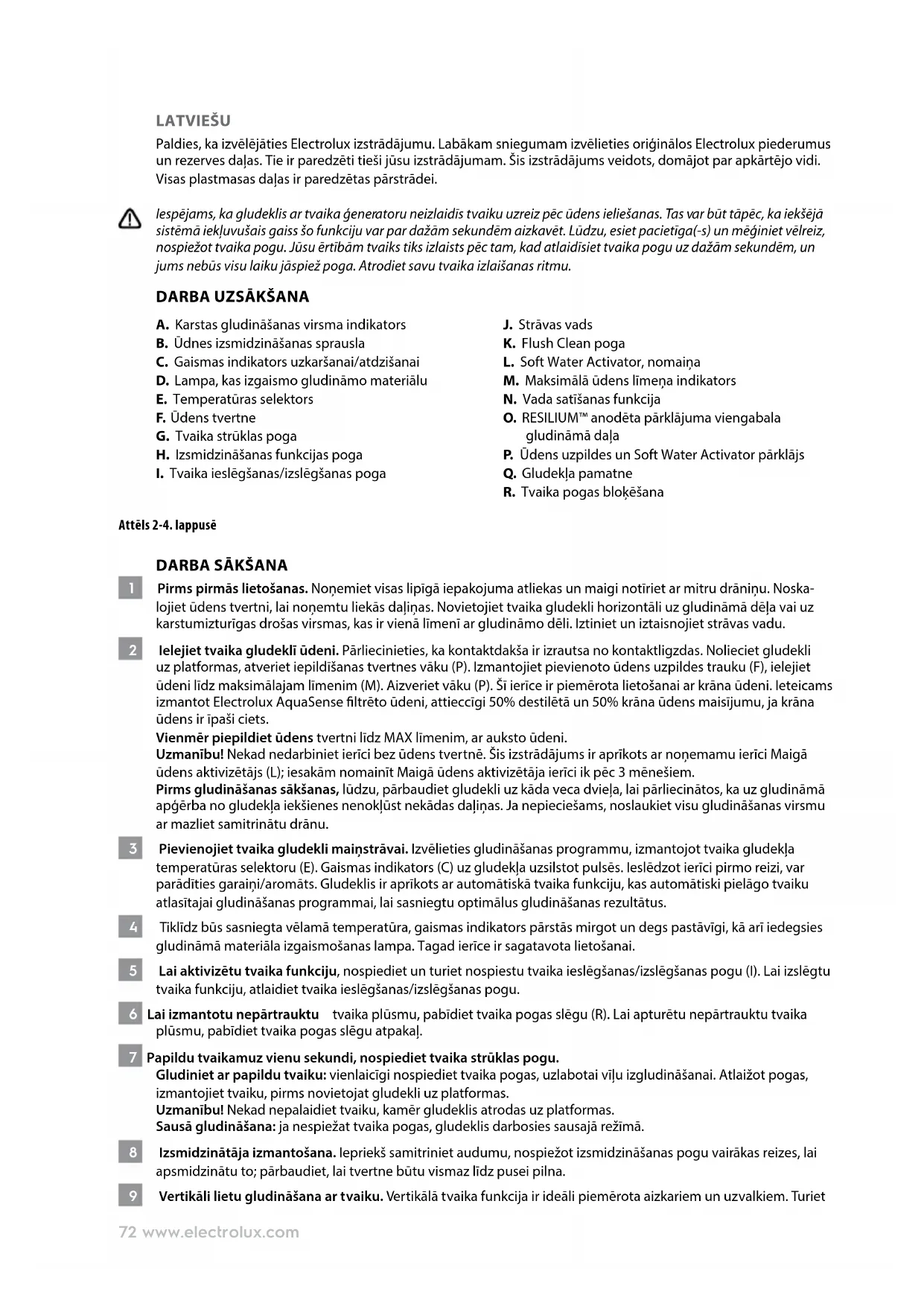 - Šī ierīce ir piemērota lietošanai ar krāna ūdeni. Ieteicams izmantot Electrolux74 www.electrolux.com AquaSense ltrēto ūdeni, kas nesatur piemaisījumus un neveido kaļķakmeni. Ja krāna ūdens ir īpaši ciets, izmantojiet jauktu ūdeni, kas sastāv no 50% destilēta ūdens un 50% krāna ūdens.