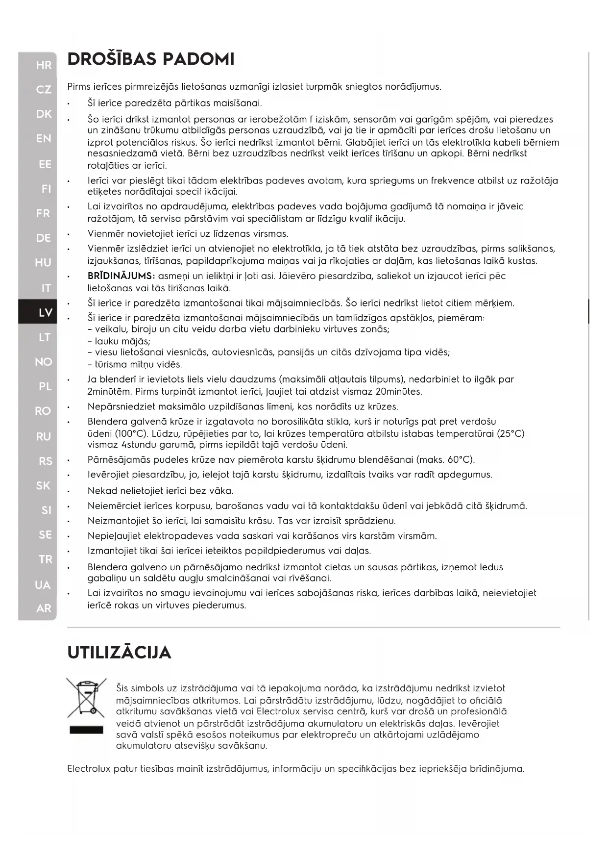 UTILIZĀCIJA Šis simbols uz izstrādājuma vai tā iepakojuma norāda, ka izstrādājumu nedrīkst izvietot mājsaimniecības atkritumos. Lai pārstrādātu izstrādājumu, lūdzu, nogādājiet to oficiālā atkritumu savākšanas vietā vai Electrolux servisa centrā, kurš var drošā un profesionālā veidā atvienot un pārstrādāt izstrādājuma akumulatoru un elektriskās daļas. Ievērojiet savā valstī spēkā esošos noteikumus par elektropreču un atkārtojami uzlādējamo akumulatoru atsevišķu savākšanu. Electrolux patur tiesības mainīt izstrādājumus, informāciju un specifikācijas bez iepriekšēja brīdinājuma. Pirms ierīces pirmreizējās lietošanas uzmanīgi izlasiet turpmāk sniegtos norādījumus.