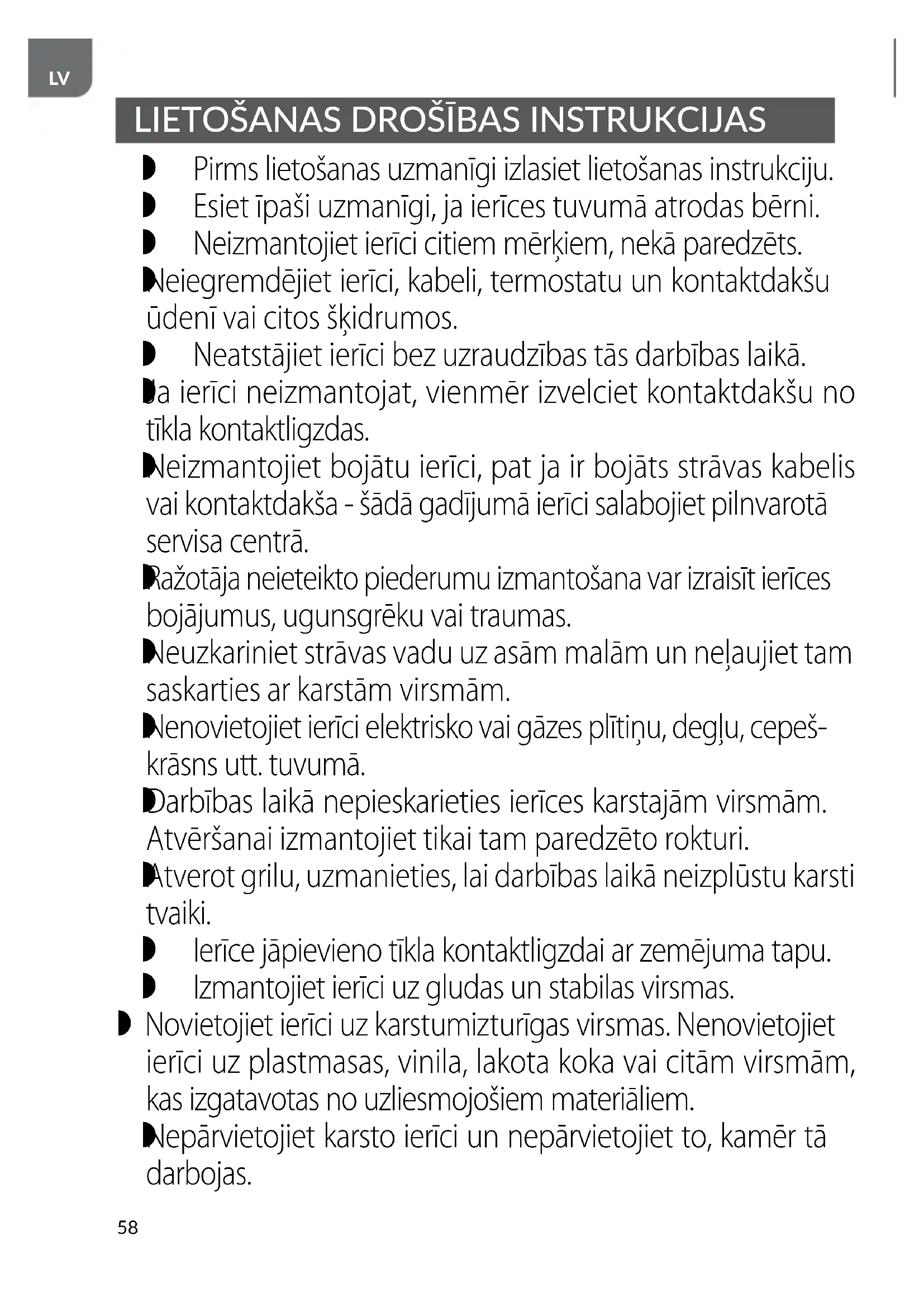 Kad esat pabeidzis darbu un ierīce ir atdzisusi, un pirms tīrīša- nas uzsākšanas vispirms izņemiet kontaktdakšu no elektriskās rozetes un pēc tam iztukšojiet tauku pilienu tvertni. Ierīce nav piemērota lietošanai ārpus telpām.
