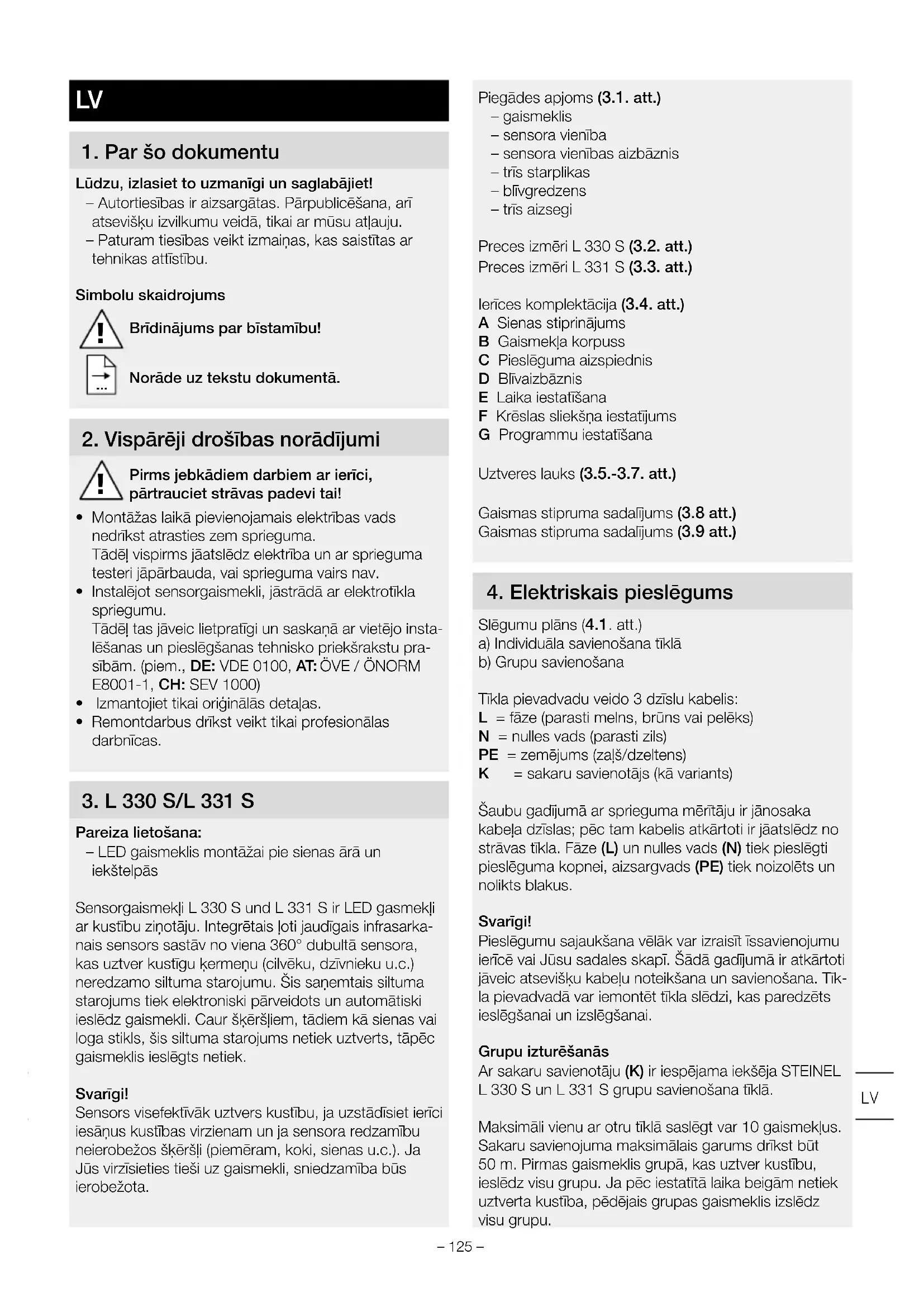 Pareiza lietošana: – LED gaismeklis montāžai pie sienas ārā un iekštelpās Sensorgaismekļi L330 S und L331 S ir LED gasmekļi ar kustību ziņotāju. Integrētais ļoti jaudīgais infrasarka- nais sensors sastāv no viena 360° dubultā sensora, kas uztver kustīgu ķermeņu (cilvēku, dzīvnieku u.c.) neredzamo siltuma starojumu. Šis saņemtais siltuma starojums tiek elektroniski pārveidots un automātiski ieslēdz gaismekli. Caur šķēršļiem, tādiem kā sienas vai loga stikls, šis siltuma starojums netiek uztverts, tāpēc gaismeklis ieslēgts netiek. Svarīgi! Sensors visefektīvāk uztvers kustību, ja uzstādīsiet ierīci iesāņus kustības virzienam un ja sensora redzamību neierobežos šķēršļi (piemēram, koki, sienas u.c.). Ja Jūs virzīsieties tieši uz gaismekli, sniedzamība būs ierobežota. Piegādes apjoms (3.1. att.) – gaismeklis – sensora vienība – sensora vienības aizbāznis – trīs starplikas – blīvgredzens – trīs aizsegi Preces izmēri L330 S (3.2. att.) Preces izmēri L331 S (3.3. att.) Ierīces komplektācija (3.4. att.) A Sienas stiprinājums B Gaismekļa korpuss C Pieslēguma aizspiednis D Blīvaizbāznis E Laika iestatīšana F Krēslas sliekšņa iestatījums G Programmu iestatīšana Uztveres lauks (3.5.-3.7. att.) Gaismas stipruma sadalījums (3.8 att.) Gaismas stipruma sadalījums (3.9 att.)