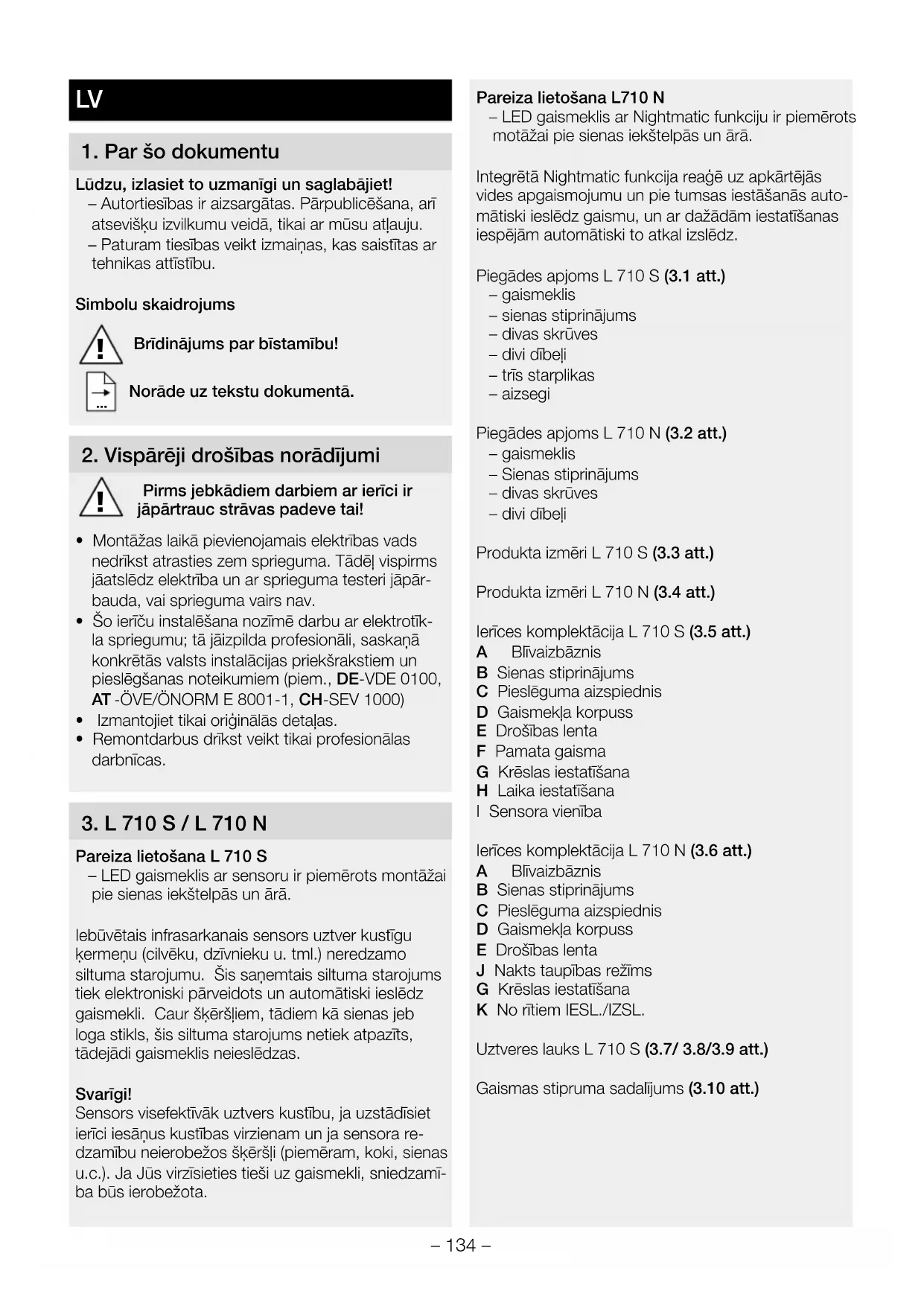 Pareiza lietošana L 710 S – LED gaismeklis ar sensoru ir piemērots montāžai pie sienas iekštelpās un ārā. Iebūvētais infrasarkanais sensors uztver kustīgu ķermeņu (cilvēku, dzīvnieku u. tml.) neredzamo siltuma starojumu. Šis saņemtais siltuma starojums tiek elektroniski pārveidots un automātiski ieslēdz gaismekli. Caur šķēršļiem, tādiem kā sienas jeb loga stikls, šis siltuma starojums netiek atpazīts, tādejādi gaismeklis neieslēdzas. Svarīgi! Sensors visefektīvāk uztvers kustību, ja uzstādīsiet ierīci iesāņus kustības virzienam un ja sensora re- dzamību neierobežos šķēršļi (piemēram, koki, sienas u.c.). Ja Jūs virzīsieties tieši uz gaismekli, sniedzamī- ba būs ierobežota. Pareiza lietošana L710 N – LED gaismeklis ar Nightmatic funkciju ir piemērots motāžai pie sienas iekštelpās un ārā. Integrētā Nightmatic funkcija reaģē uz apkārtējās vides apgaismojumu un pie tumsas iestāšanās auto- mātiski ieslēdz gaismu, un ar dažādām iestatīšanas iespējām automātiski to atkal izslēdz. Piegādes apjoms L 710 S (3.1 att.) – gaismeklis – sienas stiprinājums – divas skrūves – divi dībeļi – trīs starplikas – aizsegi Piegādes apjoms L 710 N (3.2 att.) – gaismeklis – Sienas stiprinājums – divas skrūves – divi dībeļi Produkta izmēri L710S (3.3 att.) Produkta izmēri L710N (3.4 att.) Ierīces komplektācija L 710 S (3.5 att.) A Blīvaizbāznis B Sienas stiprinājums C Pieslēguma aizspiednis D Gaismekļa korpuss E Drošības lenta F Pamata gaisma G Krēslas iestatīšana H Laika iestatīšana I Sensora vienība Ierīces komplektācija L 710 N (3.6 att.) A Blīvaizbāznis B Sienas stiprinājums C Pieslēguma aizspiednis D Gaismekļa korpuss E Drošības lenta J Nakts taupības režīms G Krēslas iestatīšana K No rītiem IESL./IZSL. Uztveres lauks L 710 S (3.7/ 3.8/3.9 att.) Gaismas stipruma sadalījums (3.10 att.)– 135 –