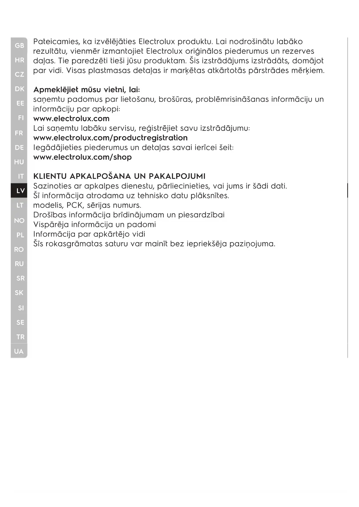 Pateicamies, ka izvēlējāties Electrolux produktu. Lai nodrošinātu labāko rezultātu, vienmēr izmantojiet Electrolux oriģinālos piederumus un rezerves daļas. Tie paredzēti tieši jūsu produktam. Šis izstrādājums izstrādāts, domājot par vidi. Visas plastmasas detaļas ir marķētas atkārtotās pārstrādes mērķiem. Apmeklējiet mūsu vietni, lai: saņemtu padomus par lietošanu, brošūras, problēmrisināšanas informāciju un informāciju par apkopi: www.electrolux.com Lai saņemtu labāku servisu, reģistrējiet savu izstrādājumu: www.electrolux.com/productregistration Iegādājieties piederumus un detaļas savai ierīcei šeit: www.electrolux.com/shop