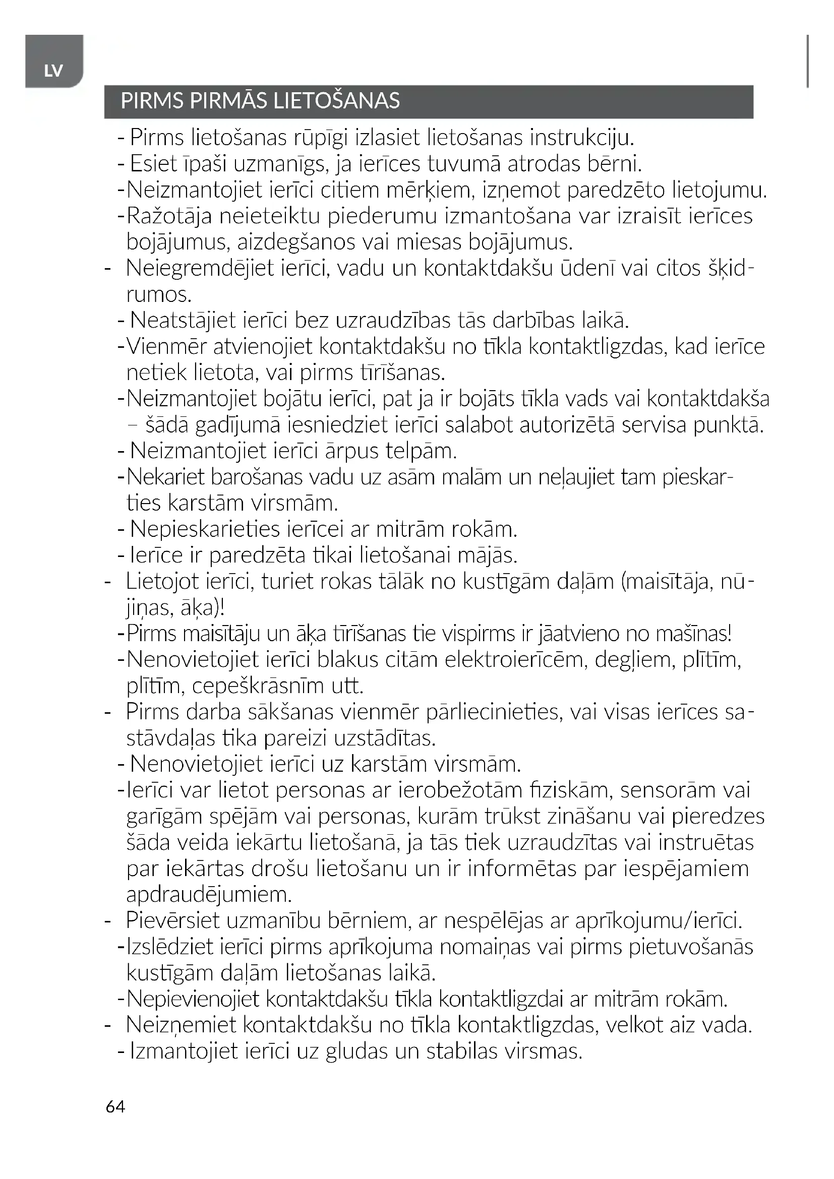 - Pirms lietošanas rūpīgi izlasiet lietošanas instrukciju. - Esiet īpaši uzmanīgs, ja ierīces tuvumā atrodas bērni.