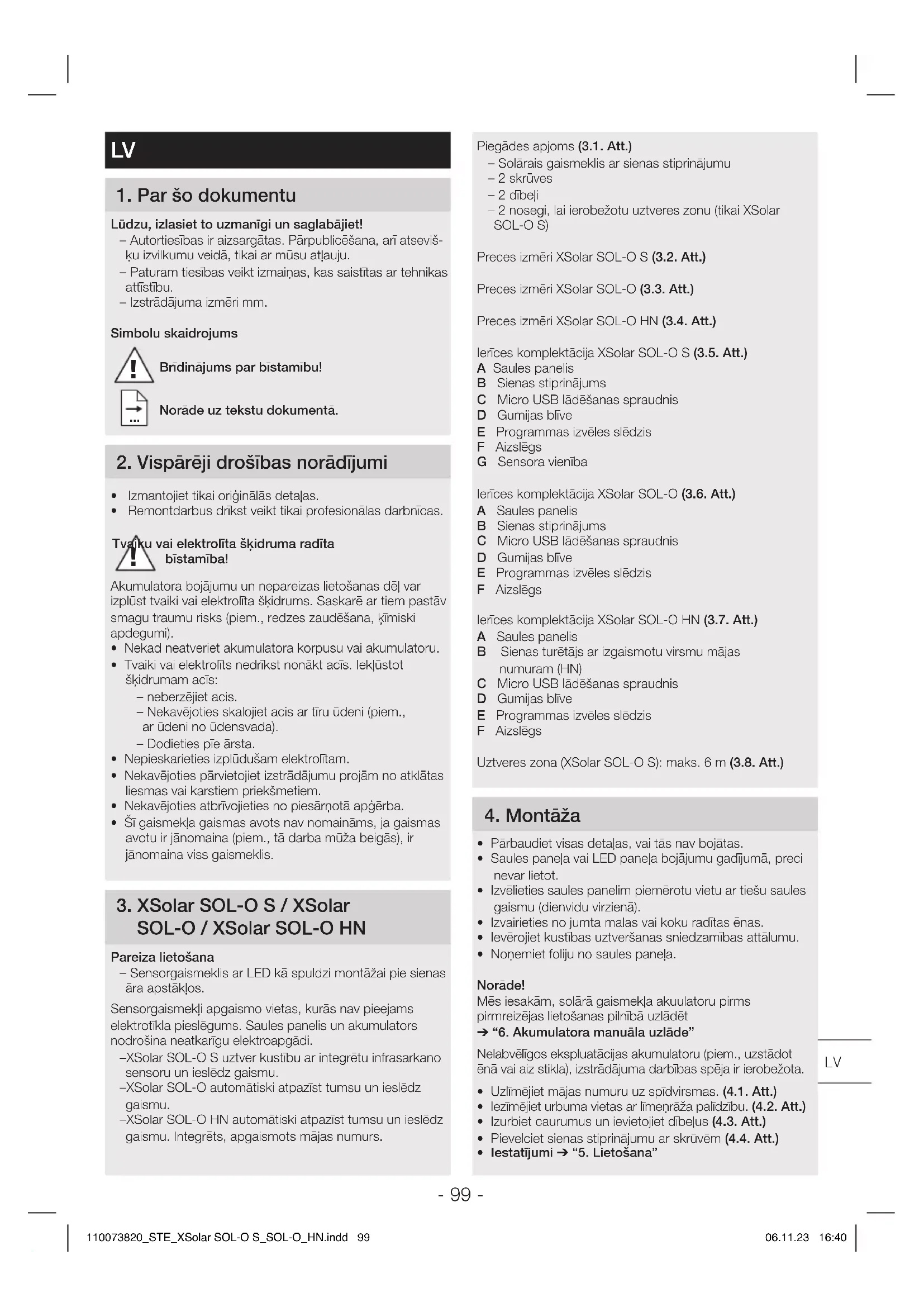 - Notīriet saules paneli ar mīkstu drānu un maigu tīrīšanas līdzekli. 110073820_STE_XSolar SOL-O S_SOL-O_HN.indd 100110073820_STE_XSolar SOL-O S_SOL-O_HN.indd 100 06.11.23 16:4006.11.23 16:40- 101 - 8 Utilizācija Elektroierīces, piederumi un iepakojumi jānodod dabai draudzīgai atkārtotai pārstrādei.Nemetiet elektroierīces parastajos atkritumos!Tikai ES valstīmAtbilstoši Eiropas vadlīnijām par vecām elektroierīcēm un elektroniskām ierīcēm, un to lietojumam nacionālās tiesī-bās, nefunkcējošas elektroierīces jāsavāc atsevišķi un tās jānodod dabai draudzīgai atkārtotai pārstrādei. Neizmetiet vecas ierīces, akumulatorus un baterijas sadzīves atkritumos, ugunī vai ūdenī. Akumulatori/baterijas ir jāsavāc, jāpārstrādā vai jāutilizē videi draudzīgā veidā.Tikai ES valstīmSaskaņā ar Eiropas Parlamenta un Padomes Direktīvu 2006/66/EK bojātie vai izlietotie akumulatori/baterijas ir jāpārstrādā. Neizmantojamus akumulatorus/baterijas var nodot tirdzniecības vietās vai kaitīgi vielu savākšanas punktos. 9 Ražotāja garantija Ražotāja garantija STEINEL GmbH, Dieselstraße 80-84, DE-33442 Herzebrock-Clarholz, VācijaŠis Steinel produkts ir izgatavots ar vislielāko rūpību, tā dar-bība un drošība ir pārbaudīta saskaņā ar spēkā esošajiem priekšrakstiem, un noslēgumā tas pakļauts izlases veida pārbaudei. Steinel garantē nevainojamas produkta īpašības un darbību. Garantijas laiks ir 36mēneši un tā stājas spēkā ar ierīces pārdošanas dienu lietotājam. Mēs novēršam trūkumus, kas radušies materiālu vai rūpnīcas kļūdu dēļ, garantijas serviss ietver sevī bojāto daļu remontu vai apmaiņu pēc mūsu izvēles. Garantijas serviss neattiecas uz nodilumam pakļauto daļu bojājumiem, kā arī uz bojājumiem un trūkumiem, kas radušies nelietpratīgas lietošanas vai apkopes, kā arī kritiena rezultātā. Garantijas saistības neattiecas uz citiem objektiem, kas varētu tikt bojāti ierīces darbības rezultātā. Garantija ir spēkā tikai tad, ja neizjaukta ierīce kopā ar īsu problēmas aprakstu, kases čeku vai rēķinu (ar pirkšanas datumu un tirgotāja zīmogu), labi iepakota, tiek nosūtīta attiecīgajai servisa nodaļai.Remonta serviss: Pēc garantijas laika beigām vai tādu bojājumu gadījumā, uz kuriem neattiecas garantijas tiesības, vērsieties tuvākajā klientu apkalpošanas centrā, lai novērstu bojājumus. 10 Tehniskie dati Solārgaismekļa tehniskie dati XSolarSOL-OS XSolarSOL-O XSolarSOL-OHN Izmēri (PxAxDzmm) 242×53×91 242×38×91 242×183×91Jauda maks.3,3W maks.0,1W maks.0,1WUztveres leņķis 360° - -Uztveres sniedzamība maks. 6m - -Krēslas sliekšņa iestatījums 2luksi Laika iestatīšana 10 – 30s automātiski - - Nakts apgaismojums 3% - - Gaismas plūsma maks. 273lm maks.7,5lm maks.7,5lm Efektivitāte 83lm/W 75lm/W 75lm/W Krāsas temperatūra 3.000KLED mūža ilgums 50.000hAizsardzības veids IP44Aizsargklase IIITemperatūras amplitūda -20°Clīdz+40°CAkumulatora tehniskie dati XSolarSOL-OSXSolarSOL-O XSolarSOL-OHNTips Litijs, dzelzs fosfāts (LiFePO4)Kapacitāte 2×2.000mAH 2.000mAH 2.000mAHmaks. mūža ilgums 20dienas, ieslēdzoties 20reizes naktīMicro USB lādēšanas spraudnis 5V,maks.1A