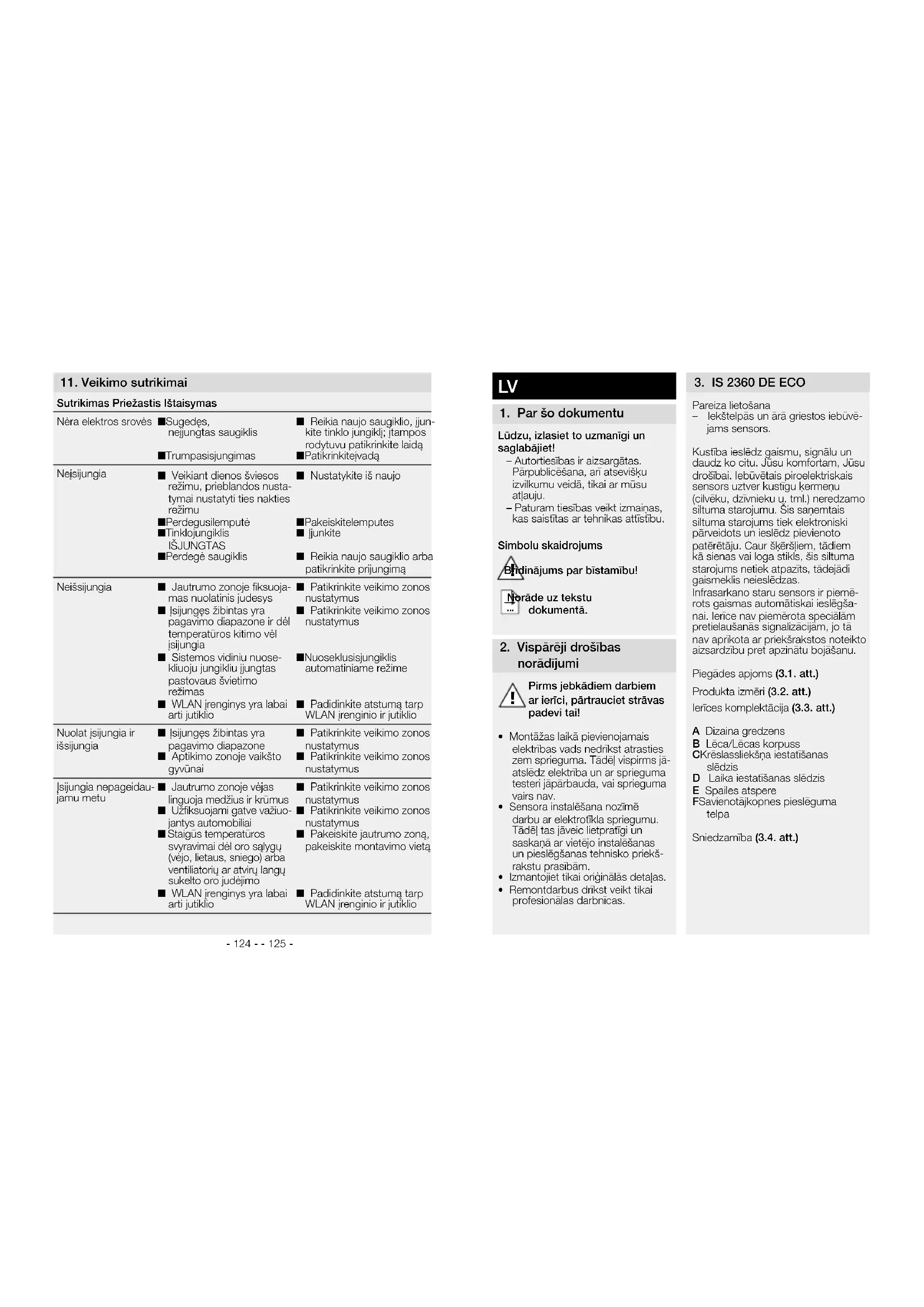 Traucējumi Cēlonis RisinājumsNetiek pievadīta strāva n bojāts drošinātājs, sensors nav ieslēgtsn Īssavienojums n jauns drošinātājs, ieslēdziet tīkla slēdzi; pār-baudiet vadu ar sprieguma testerin pārbaudiet pieslēgumusNeieslēdzasn dienas gaismas režīmā, krēslas slieksnis iestatīts nakts režīmān izdegusi kvēlspuldzen IZSLĒGTS tīkla slēdzis n bojāts drošinātājs n iestatiet no jaunan nomainiet kvēlspuldzesn ieslēdziet n jauns drošinātājs, pēc vajadzības pārbaudiet pieslēgumuNeizslēdzasn nepārtraukta kustība uztveres laukān kāds cits gaismas avots atrodas uztveres laukā un temperatūras izmaiņu dēļ ieslēdz gaismeklin ar dubulto slēdzi ieslēgts ilgstošā apgaismojuma režīmsn bezvadu interneta ierīce ir pozicionēta ļoti tuvu sensoram n jāpārbauda uztveres zona n jāpārbauda uztveres zona n dubulto slēdzi ieslēdziet automātikas režīmān palieliniet atstatumu starp bezvadu interneta ierīci un sensoruVienmēr ieslēdzas un izslēdzasn pieslēgts gaismeklis atrodas uztveres laukān dzīvnieki kustas uztverša-nas diapazonā n jāpārbauda uztveres zona n jāpārbauda uztveres zona Ieslēdzas nevajadzīgin vējš uztveres laukā kustina kokus un krūmusn tiek uztvertas uz ielas esošās automašīnas n negaidītas temperatūras izmaiņas, negaisa (vēja, lietus, sniega) vai gaisa plūsmas no ventilatoriem, atvērtiem logiem dēļn bezvadu interneta ierīce ir pozicionēta ļoti tuvu sensoram n jāpārbauda uztveres zona n jāpārbauda uztveres zona n izmainiet lauku, izmainiet montāžas vietun palieliniet atstatumu starp bezvadu interneta ierīci un sensoru