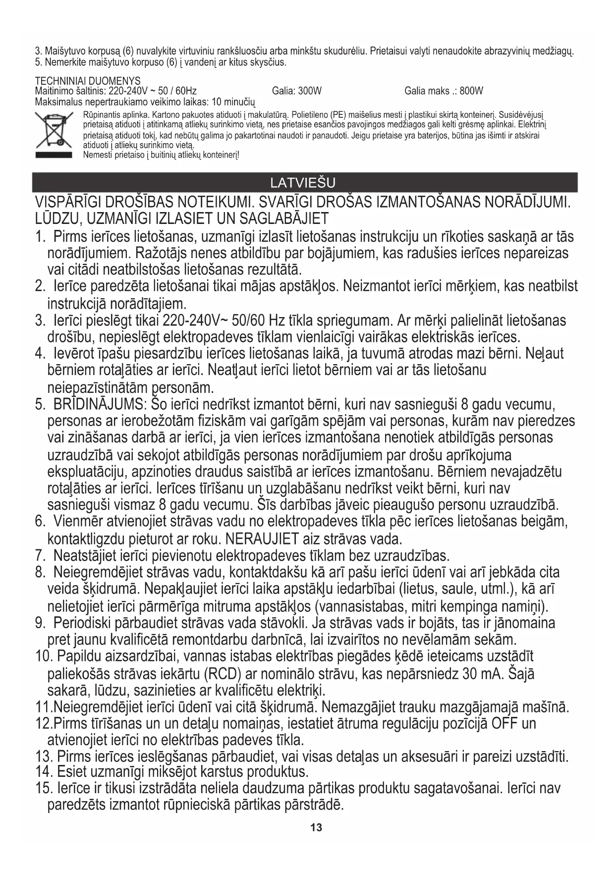 TEHNISKIE DATI Barošanas avots: 220-240V ~ 50 / 60Hz Jauda: 300W Jauda Max: 800W Maksimālais nepārtrauktās darbības laiks: 10 minūtes Apkārtējās vides aizsardzība. Kartona iepakojumu, lūdzu, nododiet otreizējai pārstrādei. Polietilēna maisiņus (PE) izmest plastmasas izstrādājumiem paredzētajos konteineros. Lietotās elektropreces nododiet attiecīgajos pieņemšanas punktos. Ierīcē satur bīstamas sastāvdaļas, kas var izraisīt draudus apkārtējai videi. Elektroierīce jānodod tā, lai ierobežotu tās atkārtotu izmantošanu. Ja ierīcē atrodas baterijas, izņemiet tās un nododiet pieņemšanas punktā atsevišķi. Produktu neizmest sadzīves atkritumu konteinerā! EESTI