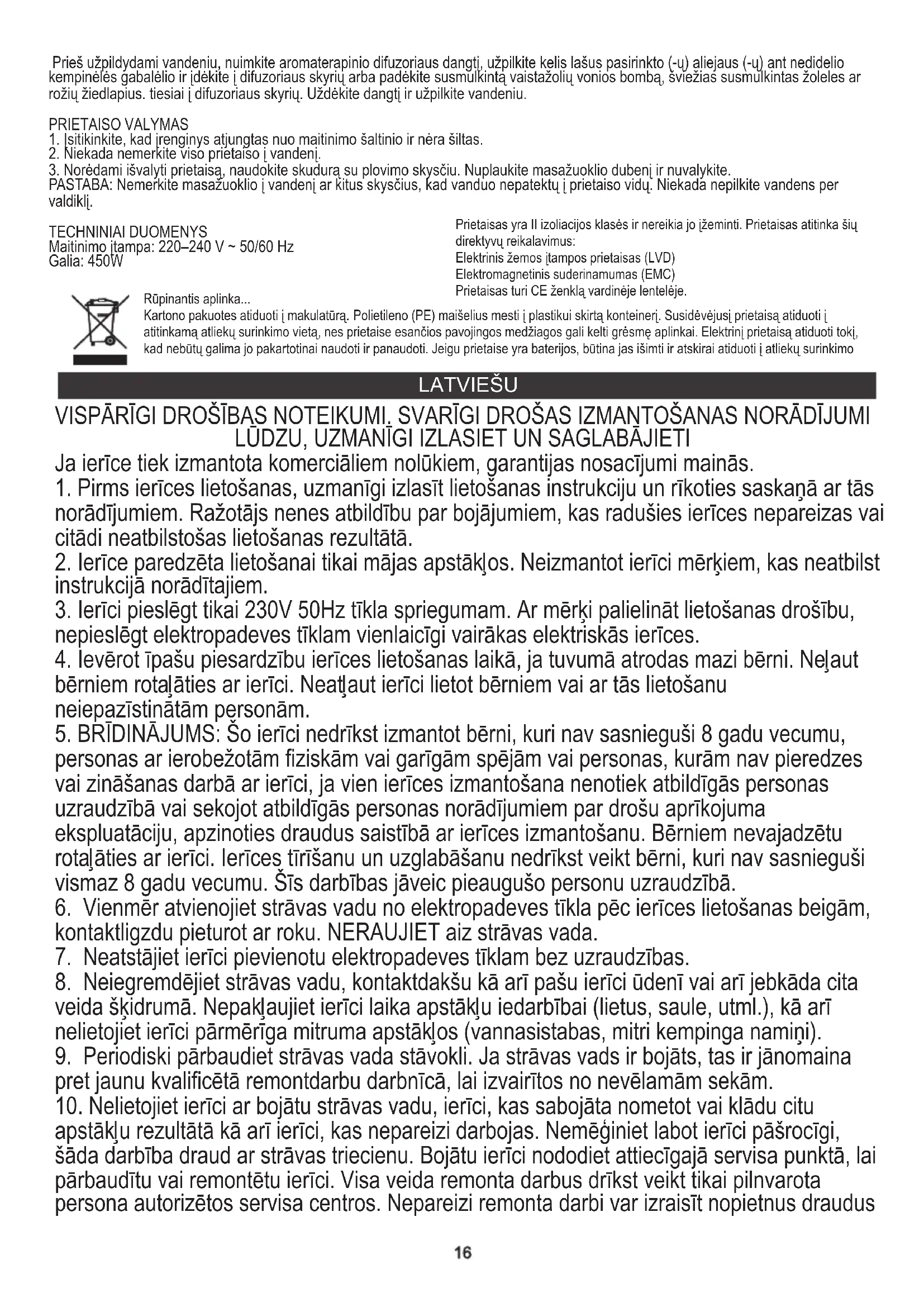 PAZIŅOJUMS: Nemetiet masieri ūdenī vai citos šķidrumos, lai izvairītos no ūdens iekļūšanas ierīces iekšpusē. Nekad neliet ūdeni virs vadības ierīces. TEHNISKIE DATI Barošanas spriegums: 220-240V ~ 50/60 Hz Jauda: 450W Ierīce ir izstrādāta II izolācijas klasē un atbilst nepieciešamajām direktīvām: zema sprieguma direktīva (LVD), elektromagnētiskā saderība (EMC), izstrādājums ir atzīmēts ar CE marķējumu. Apkārtējās vides aizsardzība Kartona iepakojumu, lūdzu, nododiet otreizējai pārstrādei. Polietilēna maisiņus (PE) izmest plastmasas izstrādājumiem paredzētajos konteineros. Lietotās elektropreces nododiet attiecīgajos pieņemšanas punktos. Ierīcē satur bīstamas sastāvdaļas, kas var izraisīt draudus apkārtējai videi. Elektroierīce jānodod tā, lai ierobežotu tās atkārtotu izmantošanu. Ja ierīcē atrodas baterijas, izņemiet tās un nododiet pieņemšanas punktā atsevišķi. Produktu neizmest sadzīves atkritumu konteinerā! EESTI