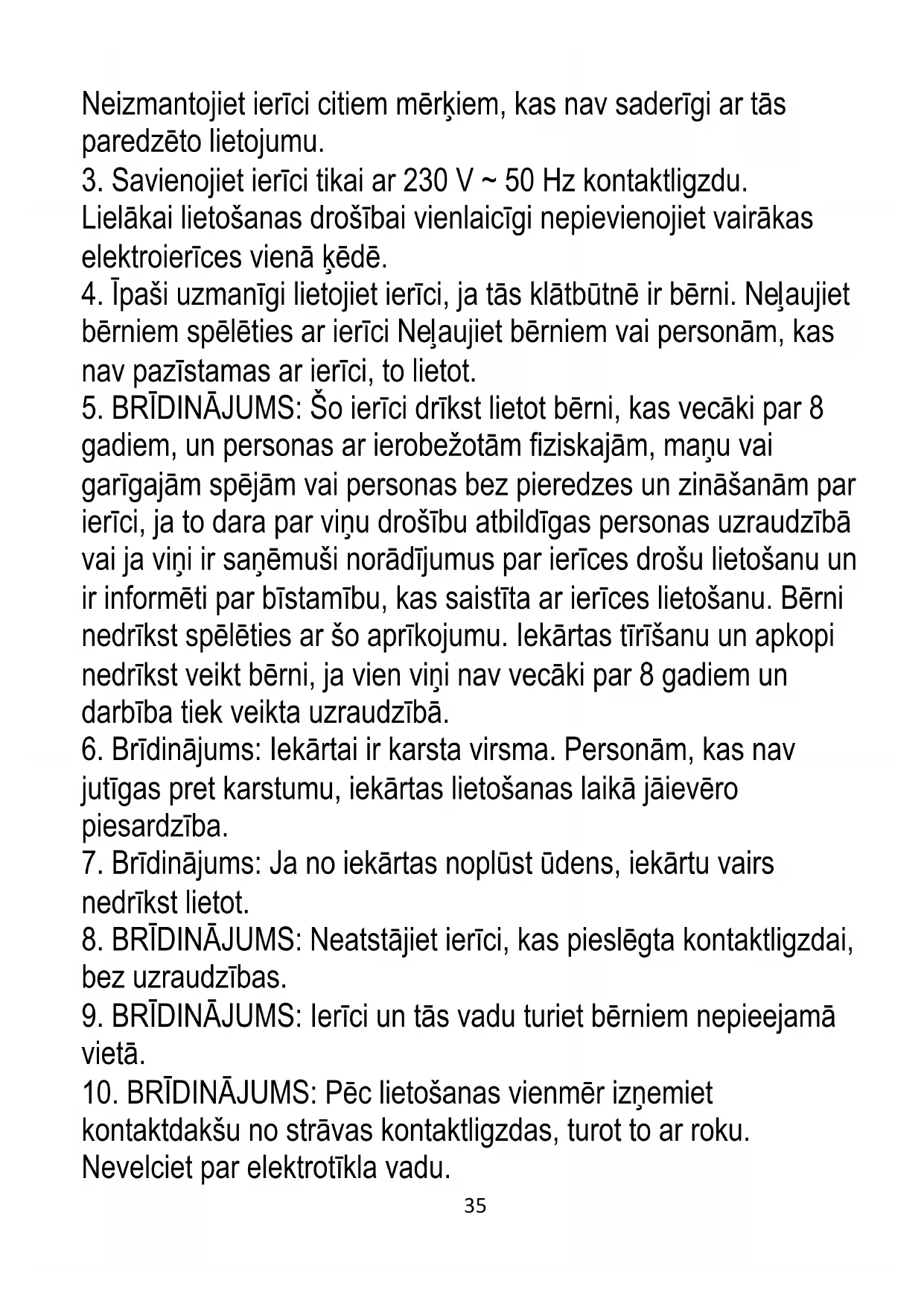 9. BRĪDINĀJUMS: Ierīci un tās vadu turiet bērniem nepieejamā