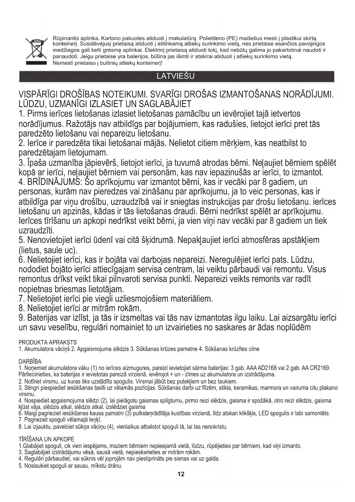 kopā ar ierīci, neļaujiet bērniem vai personām, kas nav iepazinušās ar ierīci, to izmantot. PRODUKTA APRAKSTS VISPĀRĪGI DROŠĪBAS NOTEIKUMI. SVARĪGI DROŠAS IZMANTOŠANAS NORĀDĪJUMI. LŪDZU, UZMANĪGI IZLASIET UN SAGLABĀJIET