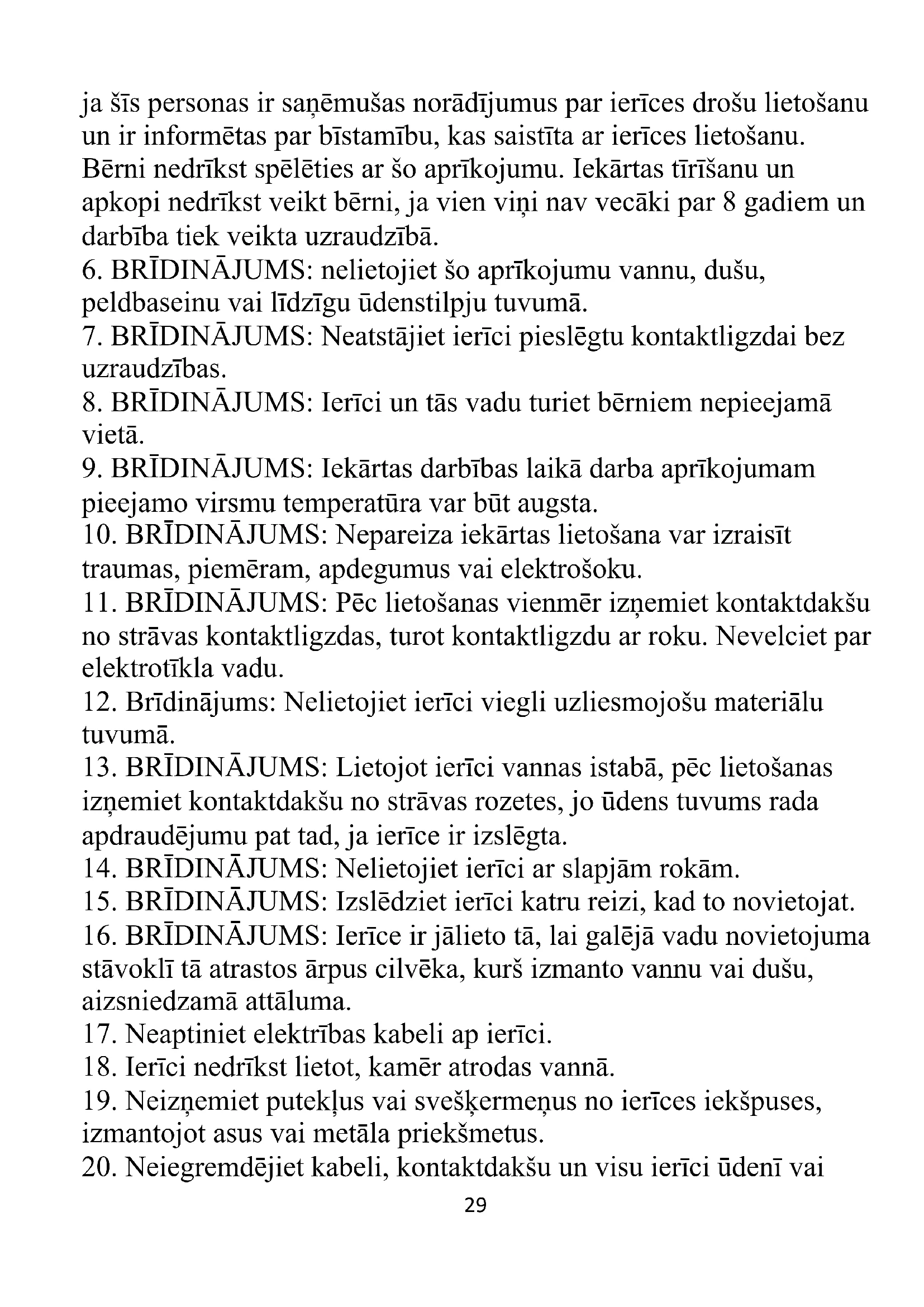 gadiem, un personas ar ierobežotām fiziskajām, maņu vai garīgajām spējām vai personas bez pieredzes un zināšanām par ierīci, ja to dara par viņu drošību atbildīgas personas uzraudzībā vai29 ja šīs personas ir saņēmušas norādījumus par ierīces drošu lietošanu un ir informētas par bīstamību, kas saistīta ar ierīces lietošanu. Bērni nedrīkst spēlēties ar šo aprīkojumu. Iekārtas tīrīšanu un apkopi nedrīkst veikt bērni, ja vien viņi nav vecāki par 8 gadiem un darbība tiek veikta uzraudzībā.
