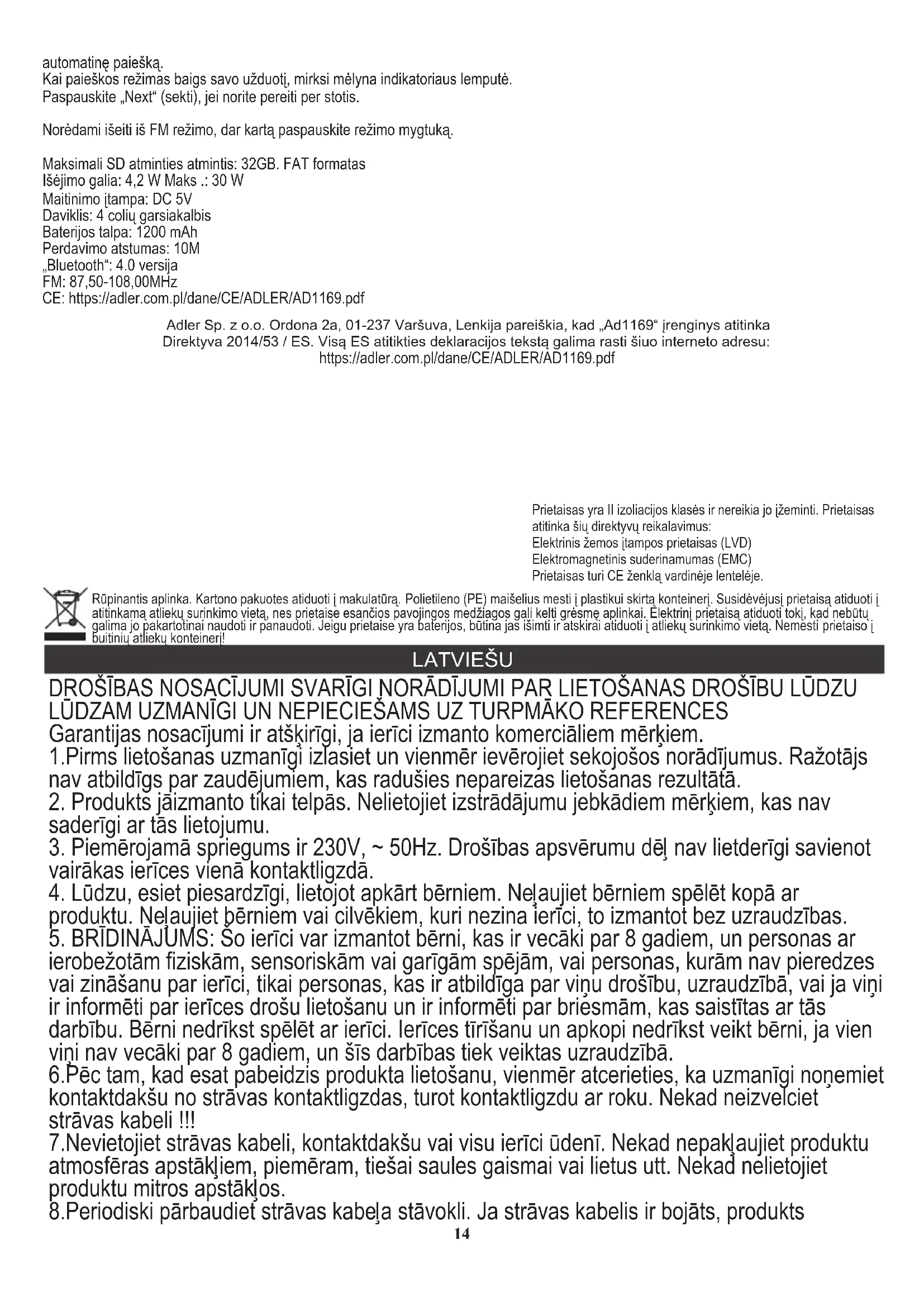 veidā vai ja tas nedarbojas pareizi. Nemēģiniet sevi labot pats, jo tas var izraisīt elektriskās strāvas triecienu. Lai to labotu, vienmēr nogrieziet bojāto ierīci profesionālā pakalpojuma vietā. Visus remontus var veikt tikai pilnvaroti servisa speciālisti. Nepareizi veikts remonts var radīt lietotājam bīstamas situācijas. jāvēršas pie profesionālas apkalpošanas vietas, lai to nomainītu, lai izvairītos no bīstamām situācijām. Mirgo skaļruņa zilais BT indikators. Bluetooth savienojums: USB / TF opcijas ir pieejamas tikai tad, kad ierīcē ir ievietota Pendrive (USB) vai TF (SD karte). 15izstrādājums ir atzīmēts ar CE marķējumu. zema sprieguma direktīva (LVD), elektromagnētiskā saderība (EMC), Ierīce ir izstrādāta II izolācijas klasē un atbilst nepieciešamajām direktīvām: Apkārtējās vides aizsardzība. Kartona iepakojumu, lūdzu, nododiet otreizējai pārstrādei. Polietilēna maisiņus (PE) izmest plastmasas izstrādājumiem paredzētajos konteineros. Lietotās elektropreces nododiet attiecīgajos pieņemšanas punktos. Ierīcē satur bīstamas sastāvdaļas, kas var izraisīt draudus apkārtējai videi. Elektroierīce jānodod tā, lai ierobežotu tās atkārtotu izmantošanu. Ja ierīcē atrodas baterijas, izņemiet tās un nododiet pieņemšanas punktā atsevišķi. Produktu neizmest sadzīves atkritumu konteinerā! EESTI
