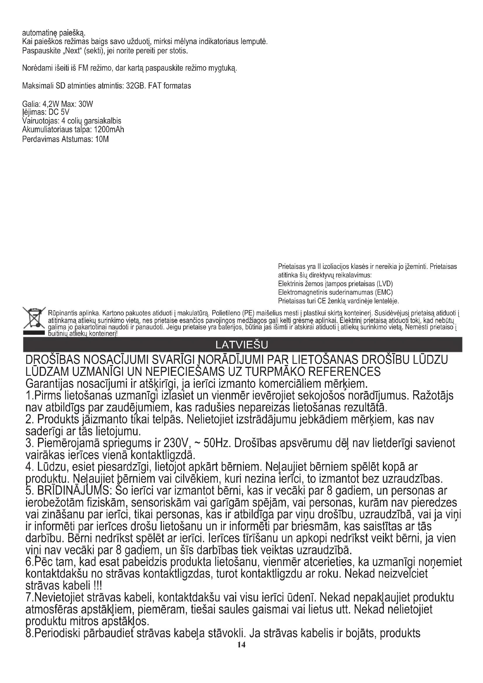 Poga „Mode”: Nospiediet šo pogu (3), lai pārslēgtos starp Bluetooth / USB (7) / TF (4) un FM režīmiem. Ieslēgt / izslēgt garu skaļruņu LED spuldzes nospiešanu. USB / TF opcijas ir pieejamas tikai tad, kad ierīcē ir ievietota Pendrive (USB) vai TF (SD karte). Bluetooth savienojums: Pabīdiet ieslēgšanas / izslēgšanas taustiņu (10) ON stāvoklī. Mirgo skaļruņa zilais BT indikators. Mobilajā tālrunī meklējiet “AD1169” un atlasiet to, kad tas ir atrasts. Pēc tam, kad skaļrunis ir veiksmīgi savienojies ar mobilo tālruni, BT indikators pārtrauks mirgot. AUX Pievienojiet vienu audio kabeļa galu (mini ligzda 3,5 mm) skaļrunī un otru galu mobilajā telefonā vai citā audio ierīcē. FM radio: Lai pārslēgtos uz FM režīmu, nospiediet režīma pogu. Nospiediet un dažas sekundes turiet pogu Atskaņot / pauze, tad atlaidiet to un vēlreiz nospiediet, lai sāktu automātisko meklēšanu. Kad meklēšanas režīms ir pabeidzis uzdevumu, mirgo zils indikators. Nospiediet Next, lai ritinātu stacijas. Lai izietu no FM režīma, vēlreiz nospiediet režīma pogu. Maksimālais atmiņas atbalsts SD kartei: 32GB. FAT formāts Jauda: 4,2W Max: 30W Ieeja: DC 5V Vadītājs: 4 collu skaļrunis Akumulatora ietilpība: 1200mAh Nosūtīšanas attālums: 10M 15Ierīce ir izstrādāta II izolācijas klasē un atbilst nepieciešamajām direktīvām: zema sprieguma direktīva (LVD), elektromagnētiskā saderība (EMC), izstrādājums ir atzīmēts ar CE marķējumu. Apkārtējās vides aizsardzība. Kartona iepakojumu, lūdzu, nododiet otreizējai pārstrādei. Polietilēna maisiņus (PE) izmest plastmasas izstrādājumiem paredzētajos konteineros. Lietotās elektropreces nododiet attiecīgajos pieņemšanas punktos. Ierīcē satur bīstamas sastāvdaļas, kas var izraisīt draudus apkārtējai videi. Elektroierīce jānodod tā, lai ierobežotu tās atkārtotu izmantošanu. Ja ierīcē atrodas baterijas, izņemiet tās un nododiet pieņemšanas punktā atsevišķi. Produktu neizmest sadzīves atkritumu konteinerā! EESTI OHUTUSNÕUDED OLULISED JUHISED KASUTUSJUHENDITE KOHTA PÄRAST