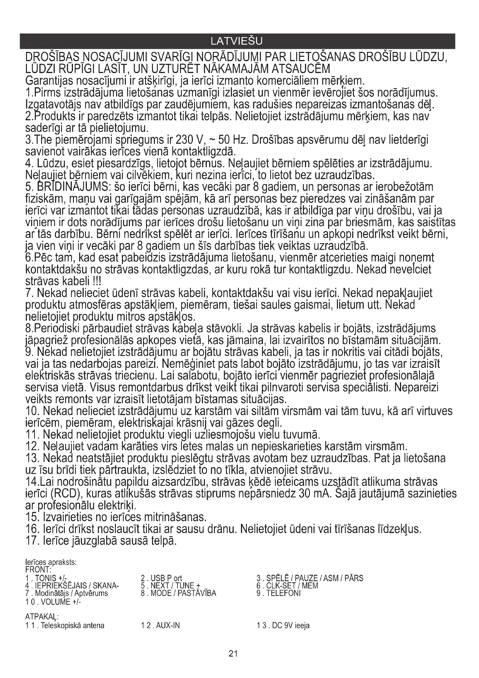 Neļaujiet bērniem vai cilvēkiem, kuri nezina ierīci, to lietot bez uzraudzības. 6.Pēc tam, kad esat pabeidzis izstrādājuma lietošanu, vienmēr atcerieties maigi noņemt kontaktdakšu no strāvas kontaktligzdas, ar kuru rokā tur kontaktligzdu. Nekad nevelciet strāvas kabeli !!! 8.Periodiski pārbaudiet strāvas kabeļa stāvokli. Ja strāvas kabelis ir bojāts, izstrādājums jāpagriež profesionālās apkopes vietā, kas jāmaina, lai izvairītos no bīstamām situācijām. 4 . IEPRIEKŠĒJAIS / SKANA- 5 . NEXT / TUNE + 6 . CLK-SET / MEM 1 . TONIS +/- 2 . USB P ort 3 . SPĒLĒ / PAUZE / ASM / PĀRS FRONT: DROŠĪBAS NOSACĪJUMI SVARĪGI NORĀDĪJUMI PAR LIETOŠANAS DROŠĪBU LŪDZU, LŪDZI RŪPĪGI LASĪT, UN UZTURĒT NĀKAMAJĀM ATSAUCĒM 1.Pirms izstrādājuma lietošanas uzmanīgi izlasiet un vienmēr ievērojiet šos norādījumus. Izgatavotājs nav atbildīgs par zaudējumiem, kas radušies nepareizas izmantošanas dēļ. 3.The piemērojami spriegums ir 230 V, ~ 50 Hz. Drošības apsvērumu dēļ nav lietderīgi savienot vairākas ierīces vienā kontaktligzdā.