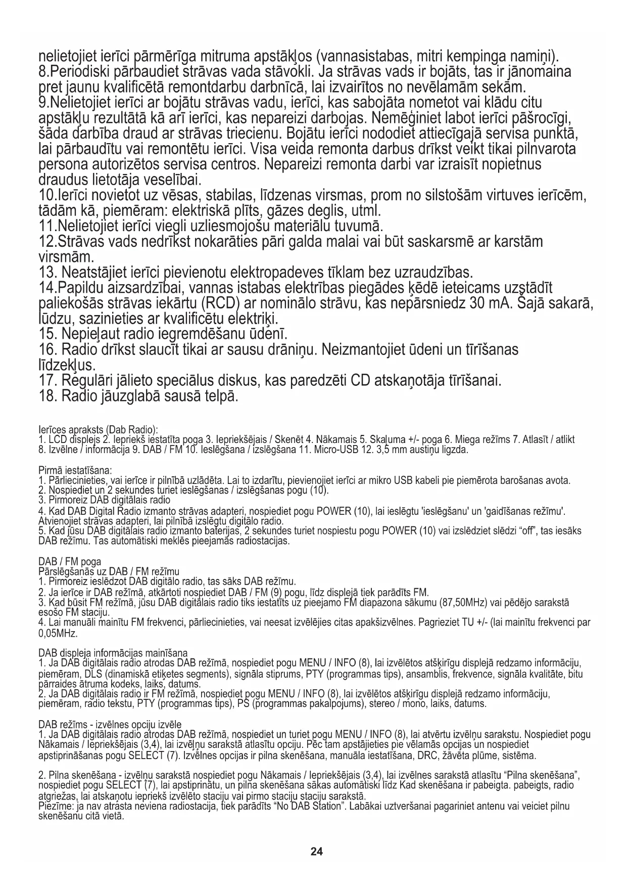 16. Radio drīkst slaucīt tikai ar sausu drāniņu. Neizmantojiet ūdeni un tīrīšanas