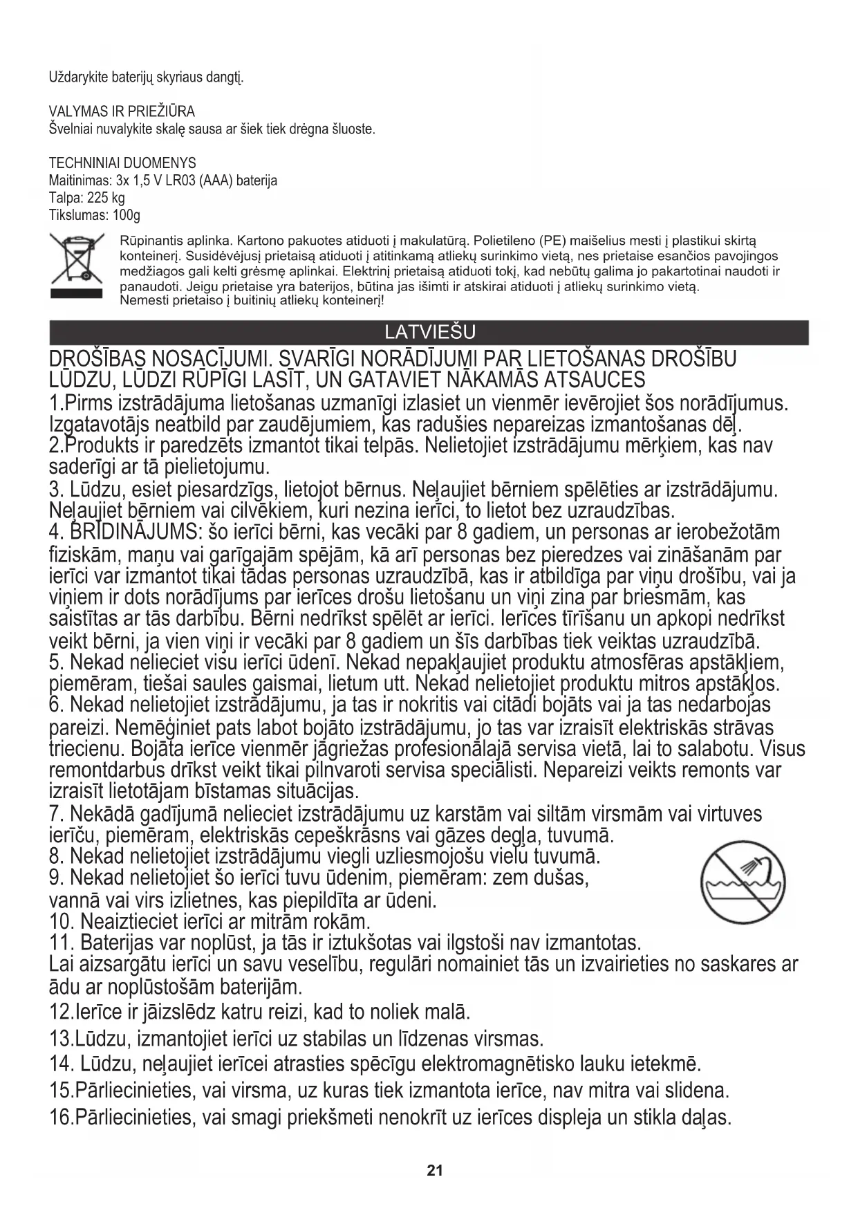 Lo - zems akumulatora līmenis TEHNISKIE DATI Precizitāte: 100 g Celtspēja: 225 kg PIEZĪME: programmas var izdzēst no atmiņas, ja tās ir pretrunā. Kamēr mērogā tiek parādītas konfliktējošas programmas, vienu no tām atlasiet, nospiežot bultiņas (a vai b). Pēc tam 3 sekundes turiet nospiestu taustiņu SET. Displejā parādīsies “dEL”. Nākamreiz ieslēdzot mērogu, profils tiks izdzēsts no atmiņas. Aizveriet akumulatora nodalījuma vāku. Apkārtējās vides aizsardzība. Kartona iepakojumu, lūdzu, nododiet otreizējai pārstrādei. Polietilēna maisiņus (PE) izmest plastmasas izstrādājumiem paredzētajos konteineros. Lietotās elektropreces nododiet attiecīgajos pieņemšanas punktos. Ierīcē satur bīstamas sastāvdaļas, kas var izraisīt draudus apkārtējai videi. Elektroierīce jānodod tā, lai ierobežotu tās atkārtotu izmantošanu. Ja ierīcē atrodas baterijas, izņemiet tās un nododiet pieņemšanas punktā atsevišķi. Produktu neizmest sadzīves atkritumu konteinerā!24 2.Toodet kasutatakse ainult siseruumides. Ärge kasutage toodet muul eesmärgil, mis ei ühildu selle rakendusega.