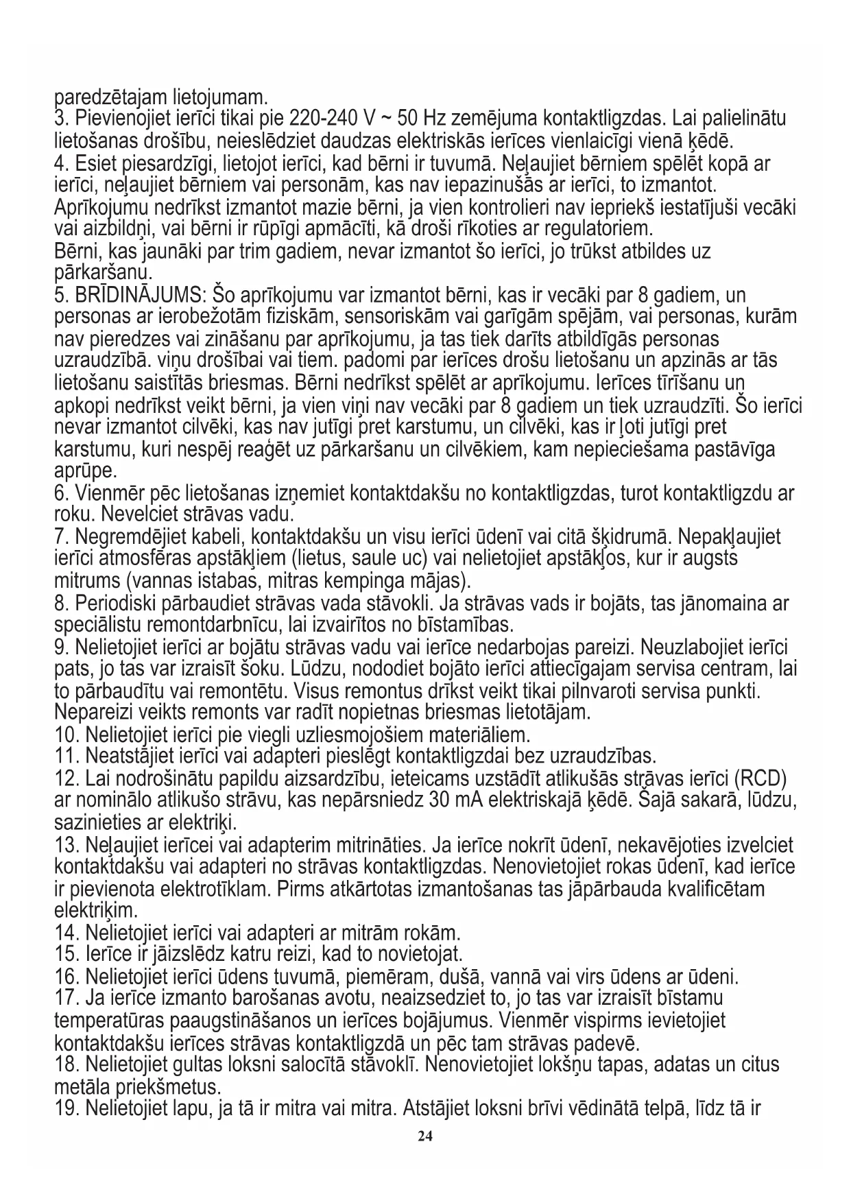 kontaktdakšu vai adapteri no strāvas kontaktligzdas. Nenovietojiet rokas ūdenī, kad ierīce ir pievienota elektrotīklam. Pirms atkārtotas izmantošanas tas jāpārbauda kvalificētam elektriķim.