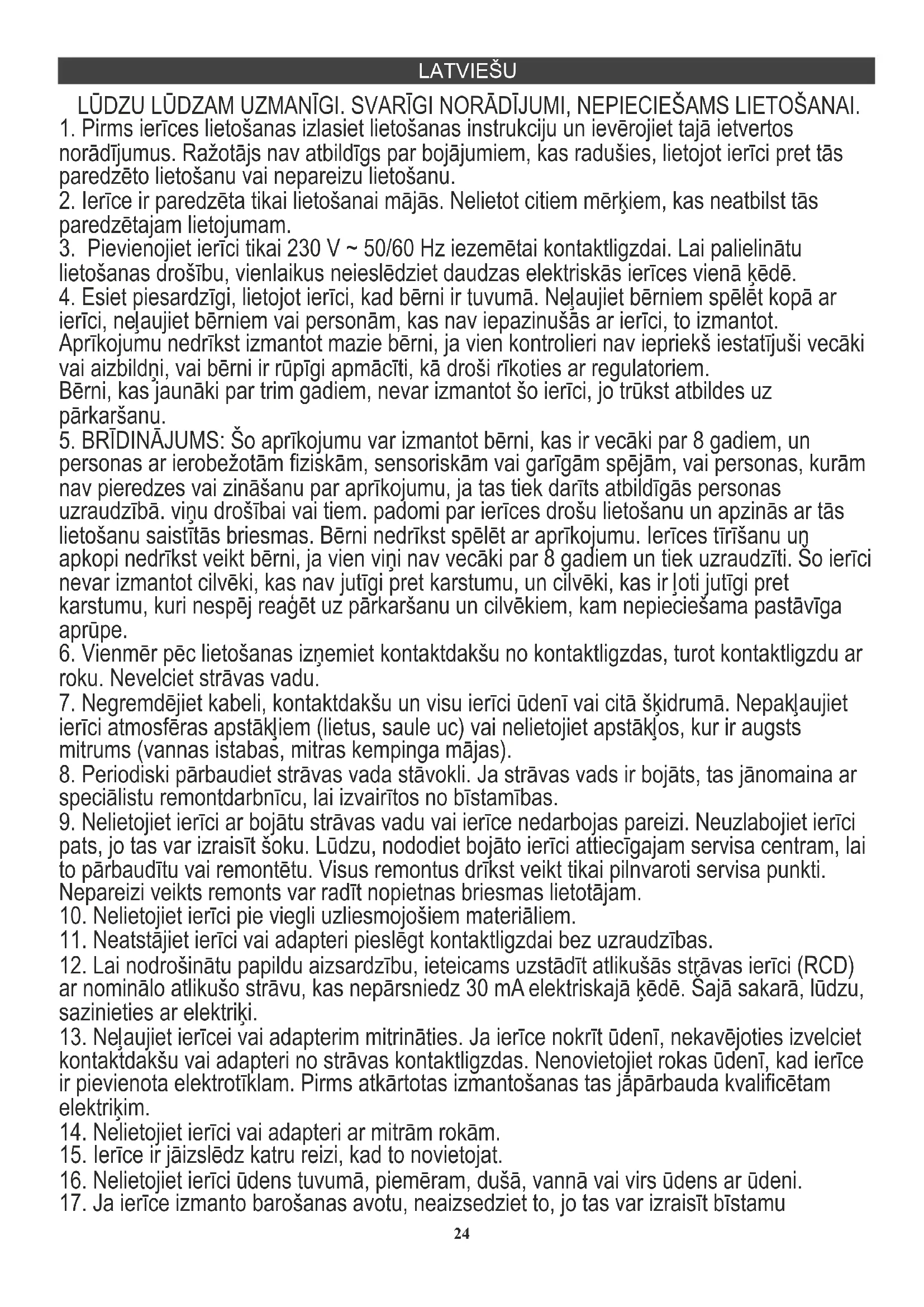 16. Nelietojiet ierīci ūdens tuvumā, piemēram, dušā, vannā vai virs ūdens ar ūdeni.