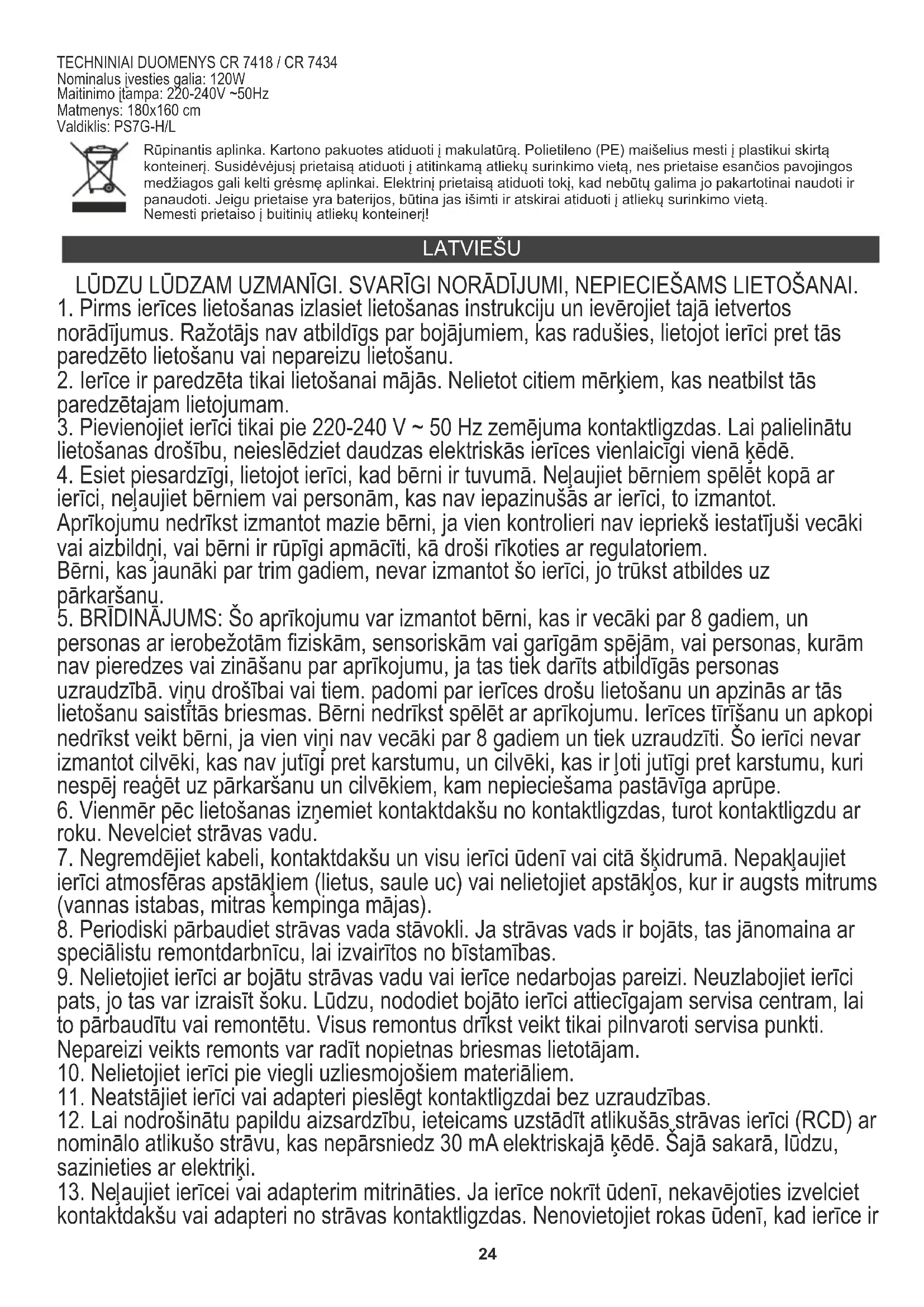 darboties, ja to lieto atbilstoši paredzētajai iekārtas lietošanai. Ja drošinātājs brauc, ierīce pārtrauks darboties, iekārta ir jāatgriež ražotājam vai tā pārstāvim remontam. Produkts: Elektriskā muciņa CR7418 / Cr7434 Šī elektriskā sega ir paredzēta lietošanai kā pārvalks, tā ir jānovieto uz indivīda virsmas, nevis zem tās, vai arī tā jānovieto virs augšējās plāksnes virs personas, nevis zem matrača. Nenovietojiet to apkārt vai zem personas. Tam vajadzētu palikt zaudētam, lai neaizliegtu lietotāja kustību. Nenovietojiet regulatoru un neradiet spiedienu uz regulatoru.