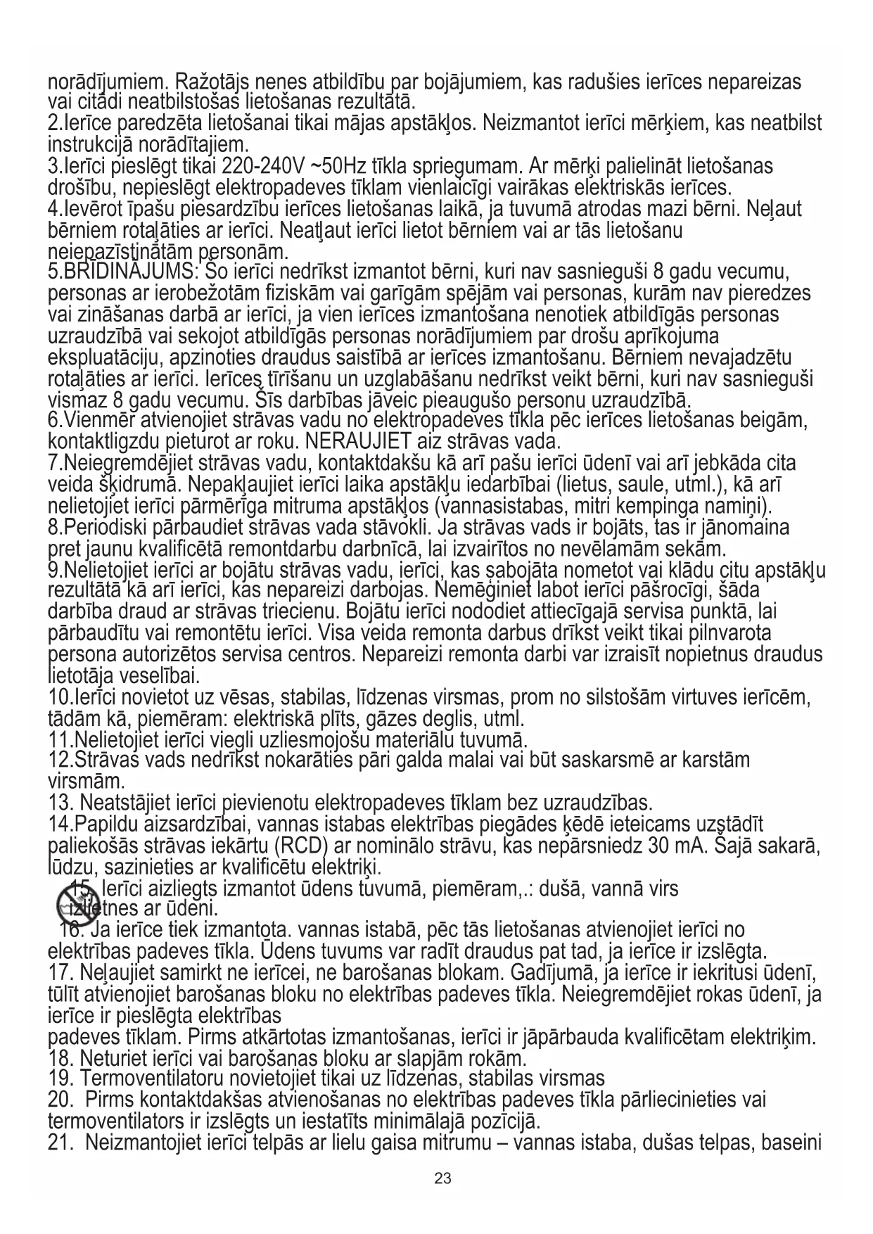 21. Neizmantojiet ierīci telpās ar lielu gaisa mitrumu – vannas istaba, dušas telpas, baseini24