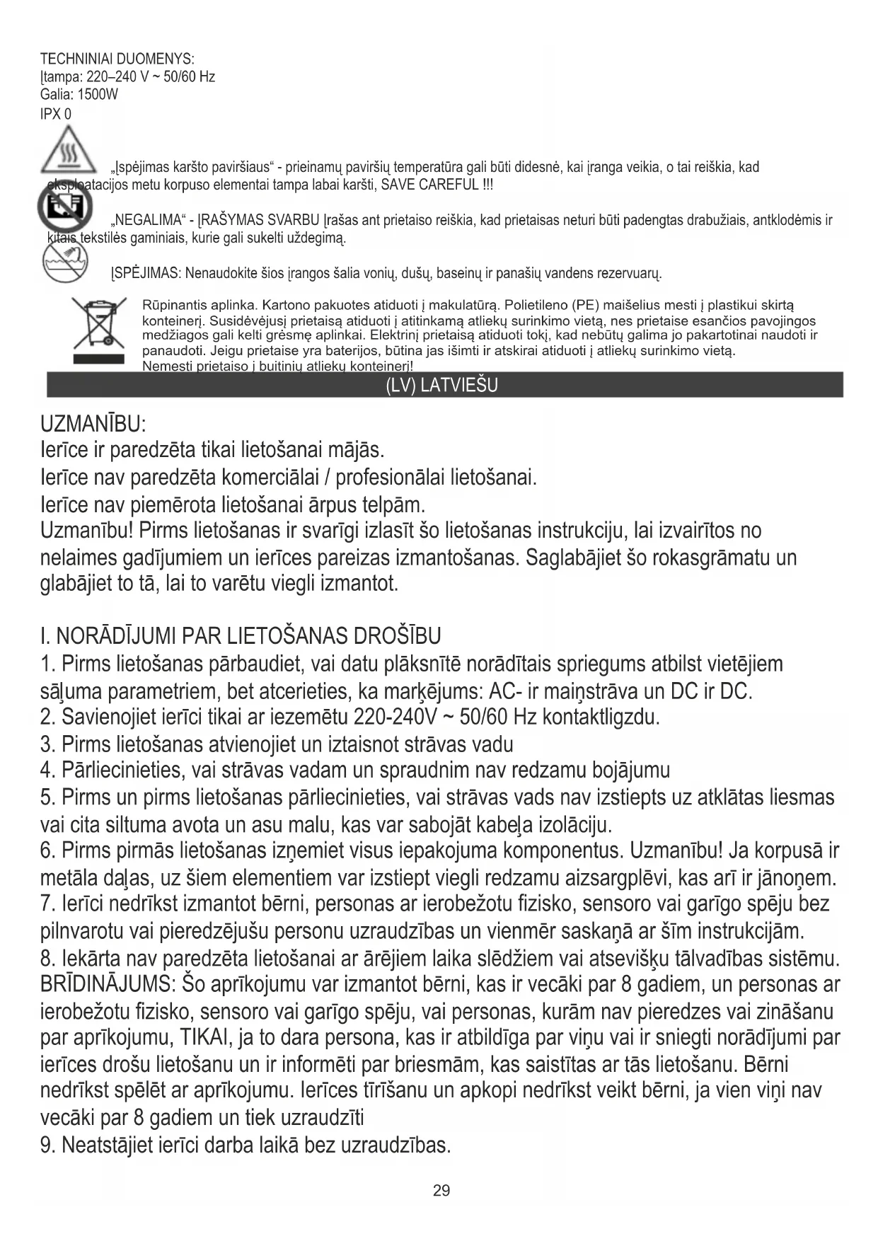 TEHNISKIE DATI: Spriegums: 220-240V ~ 50 / 60Hz Jauda: 1500W IPX 0 "Uzmanīgi karstā virsma" - pieejamo virsmu temperatūra var būt lielāka, kad darbojas iekārta, kas nozīmē, ka ekspluatācijas laikā korpusa elementi kļūst ļoti karsti, SAVE CAREFUL! “NEIZMANTOJIET” - UZRAUDZĪBAS SVARĪBA Ieraksts uz ierīces nozīmē, ka ierīce nav pārklāta ar apģērbu, segām un citiem tekstilizstrādājumiem, kas var izraisīt aizdegšanos. BRĪDINĀJUMS: Neizmantojiet šo aprīkojumu vannas, dušas, peldbaseinu un līdzīgu ūdens tvertņu tuvumā. Apkārtējās vides aizsardzība. Kartona iepakojumu, lūdzu, nododiet otreizējai pārstrādei. Polietilēna maisiņus (PE) izmest plastmasas izstrādājumiem paredzētajos konteineros. Lietotās elektropreces nododiet attiecīgajos pieņemšanas punktos. Ierīcē satur bīstamas sastāvdaļas, kas var izraisīt draudus apkārtējai videi. Elektroierīce jānodod tā, lai ierobežotu tās atkārtotu izmantošanu. Ja ierīcē atrodas baterijas, izņemiet tās un nododiet pieņemšanas punktā atsevišķi. Produktu neizmest sadzīves atkritumu konteinerā!33 (EST) EESTI TÄHELEPANU: Seade on mõeldud ainult koduseks kasutamiseks. Seade ei ole mõeldud äriliseks / professionaalseks kasutamiseks. Seade ei sobi kasutamiseks välitingimustes. Tähelepanu! Enne kasutamist on oluline, et te lugeksid need kasutusjuhendid läbi, et vältida õnnetusi ja seadme õiget kasutamist. Hoidke see käsiraamat ja hoidke seda nii, et saaksite seda hõlpsasti kasutada.
