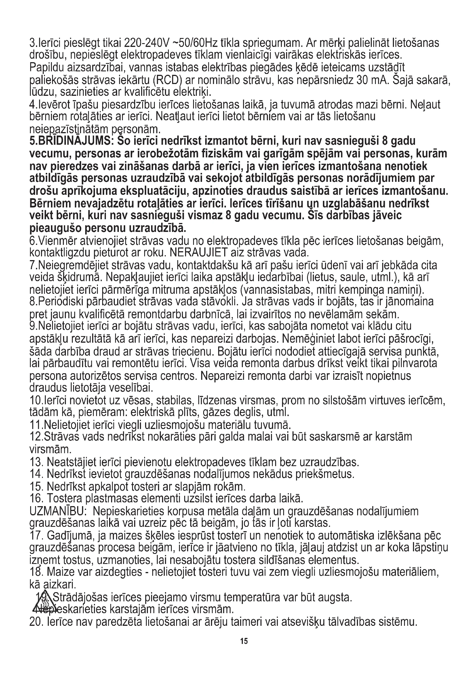15. Nedrīkst apkalpot tosteri ar slapjām rokām.