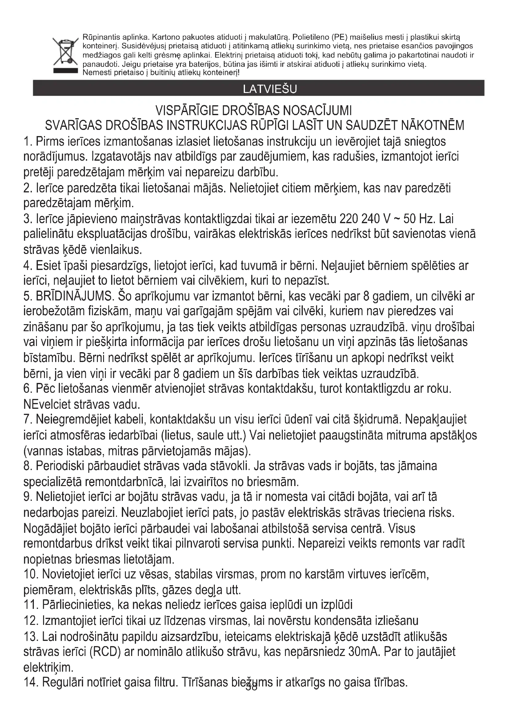 Apkārtējās vides aizsardzība. Kartona iepakojumu, lūdzu, nododiet otreizējai pārstrādei. Polietilēna maisiņus (PE) izmest plastmasas izstrādājumiem paredzētajos konteineros. Lietotās elektropreces nododiet attiecīgajos pieņemšanas punktos. Ierīcē satur bīstamas sastāvdaļas, kas var izraisīt draudus apkārtējai videi. Elektroierīce jānodod tā, lai ierobežotu tās atkārtotu izmantošanu. Ja ierīcē atrodas baterijas, izņemiet tās un nododiet pieņemšanas punktā atsevišķi. Produktu neizmest sadzīves atkritumu konteinerā! EESTI