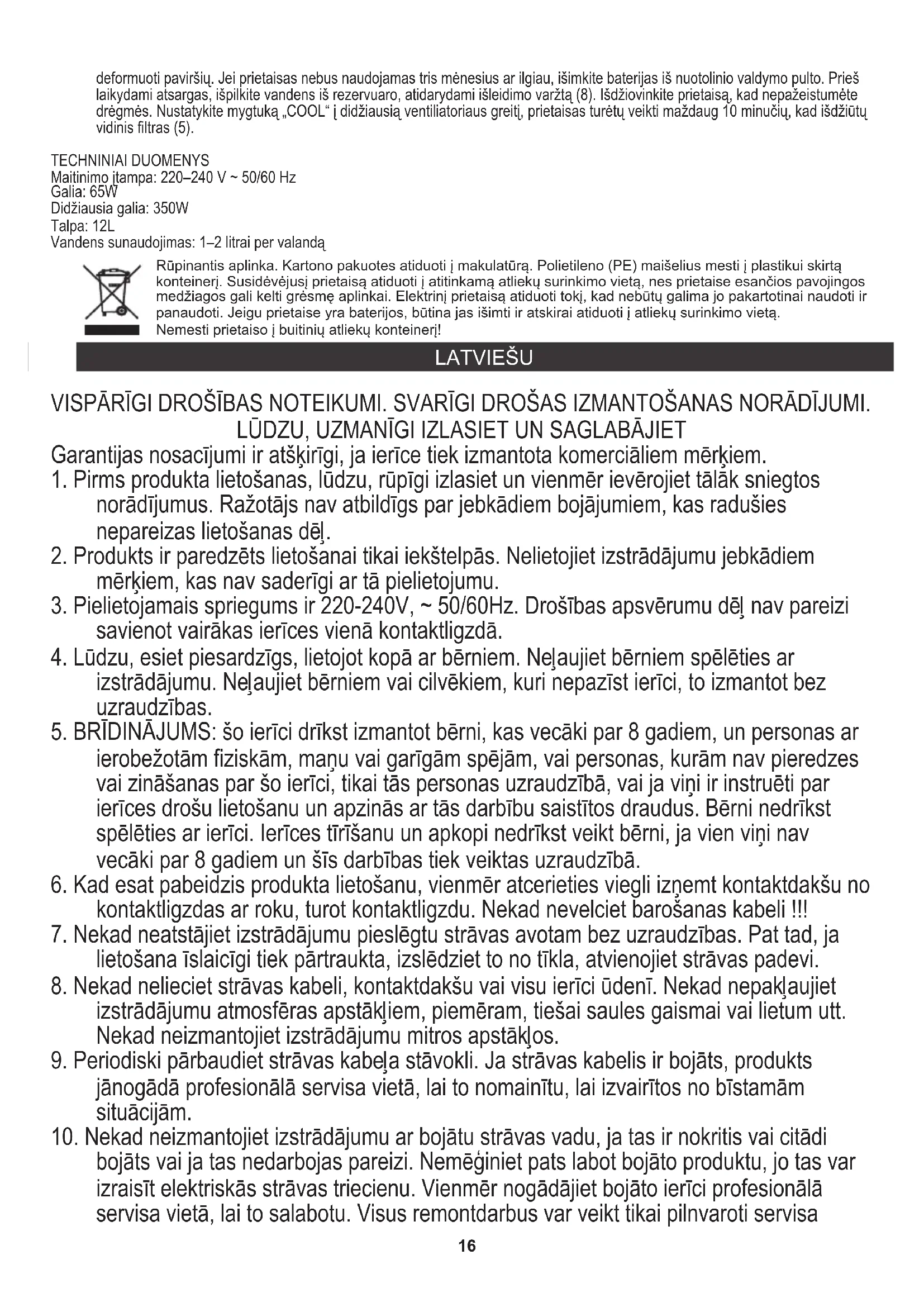 kontaktligzdas ar roku, turot kontaktligzdu. Nekad nevelciet barošanas kabeli !!! deformuoti paviršių. Jei prietaisas nebus naudojamas tris mėnesius ar ilgiau, išimkite baterijas iš nuotolinio valdymo pulto. Prieš laikydami atsargas, išpilkite vandens iš rezervuaro, atidarydami išleidimo varžtą (8). Išdžiovinkite prietaisą, kad nepažeistumėte drėgmės. Nustatykite mygtuką „COOL“ į didžiausią ventiliatoriaus greitį, prietaisas turėtų veikti maždaug 10 minučių, kad išdžiūtų vidinis filtras (5). Talpa: 12L Maitinimo įtampa: 220–240 V ~ 50/60 Hz Didžiausia galia: 350W TECHNINIAI DUOMENYS